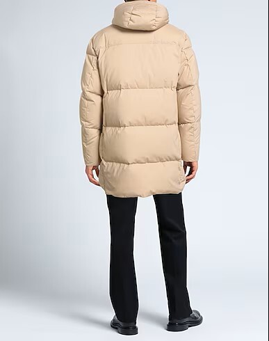 Длинный пуховик с капюшонном. Длинные рукава, наполнитель из гусиного пуха, толстая подкладка, застежка на молнию, застежка на кнопки, прорезные карманы. Машинная стирка, не отбеливать, не сушить в стиральной машине