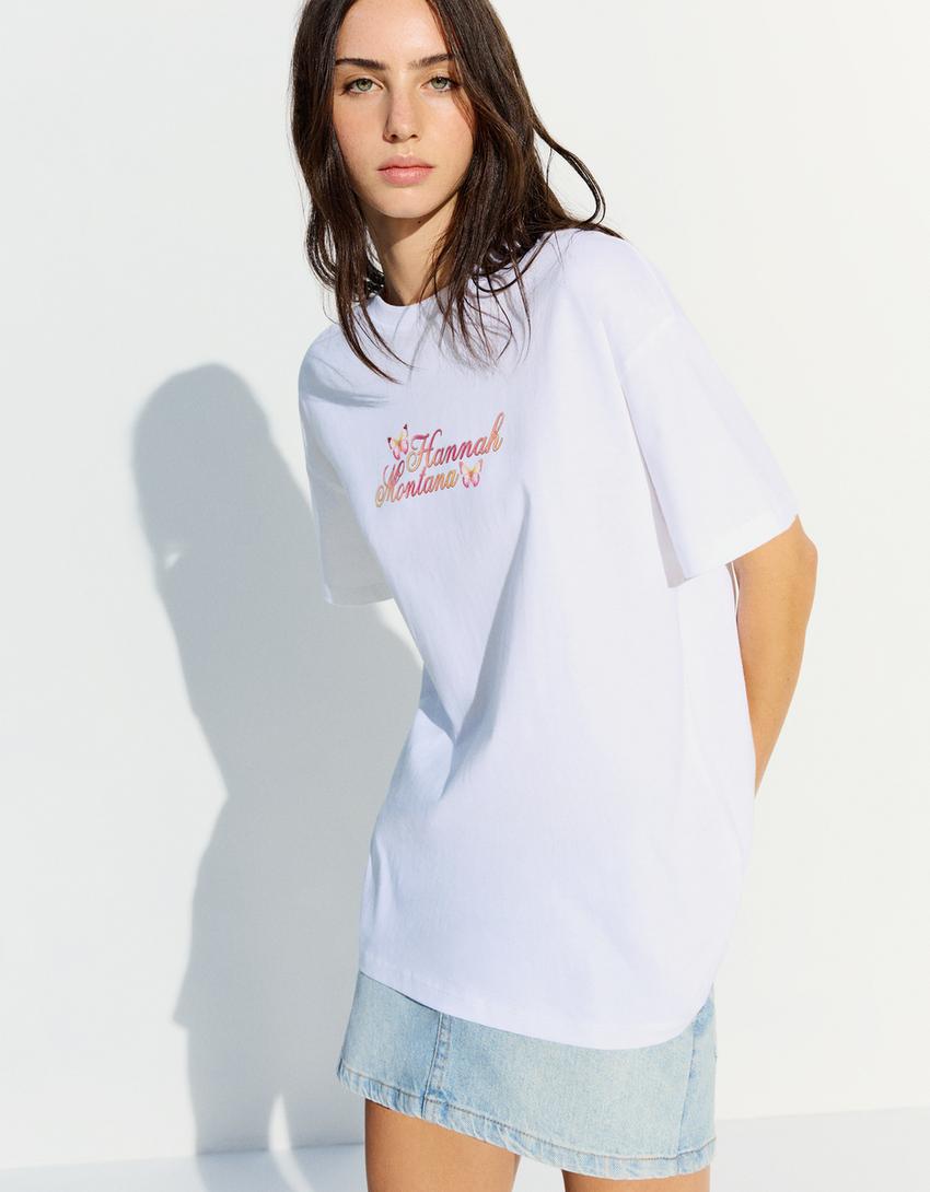 BERSHKA Футболка с короткими рукавами и принтом "Ханна Монтана", белый