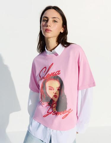 BERSHKA Футболка с короткими рукавами и принтом Selena Gomez, розовый