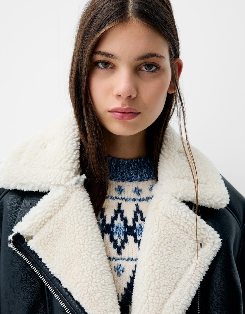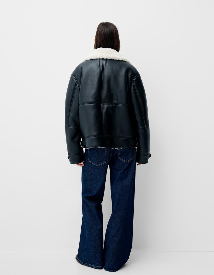 BERSHKA Куртка-дублена с подкладкой из искусственного меха, черный