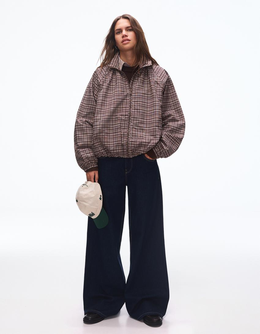 BERSHKA Куртка в клетку на молнии свободного кроя, коричневый