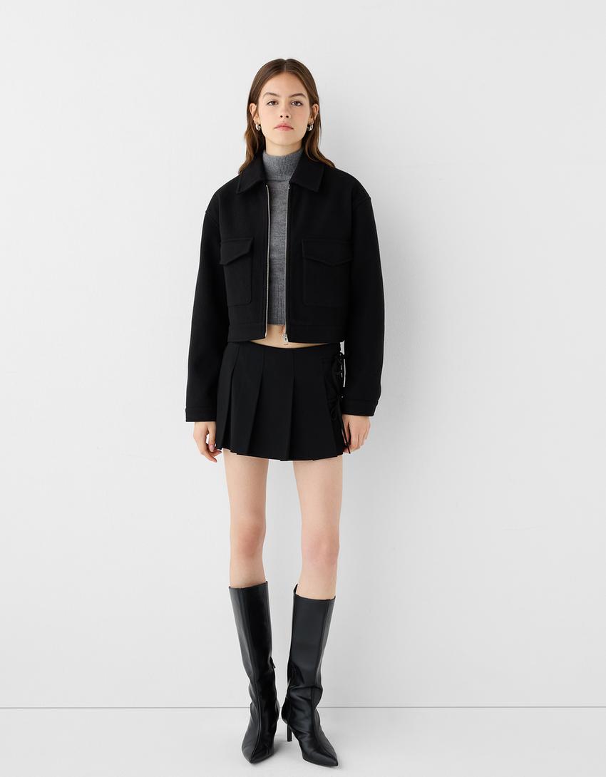 BERSHKA Мягкая укороченная куртка на молнии, черный