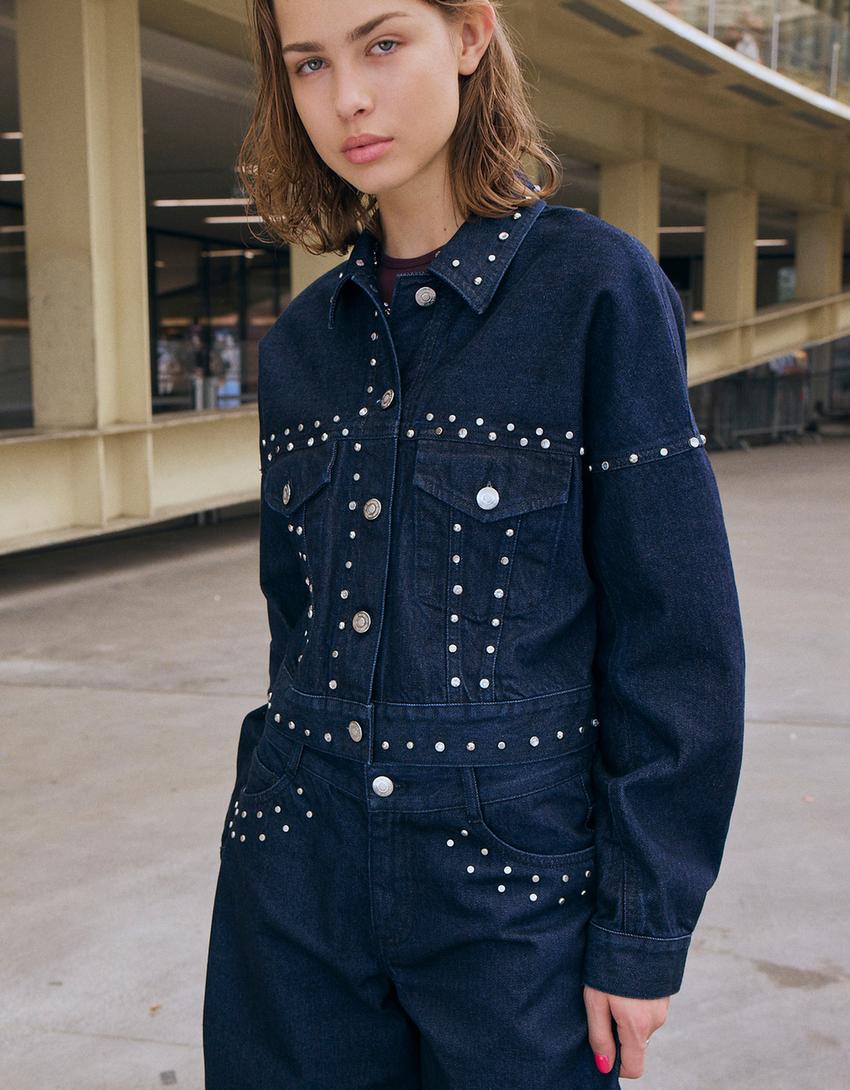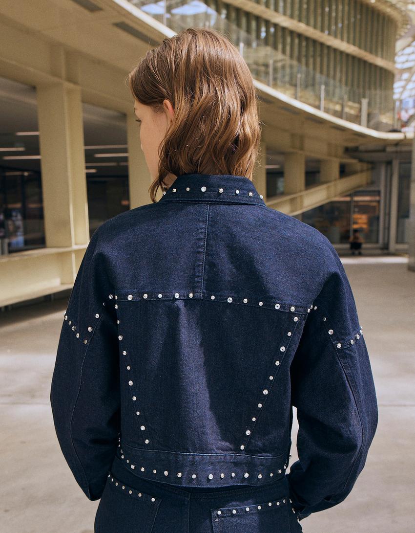 BERSHKA Укороченная джинсовая куртка с заклепками, темно-синий