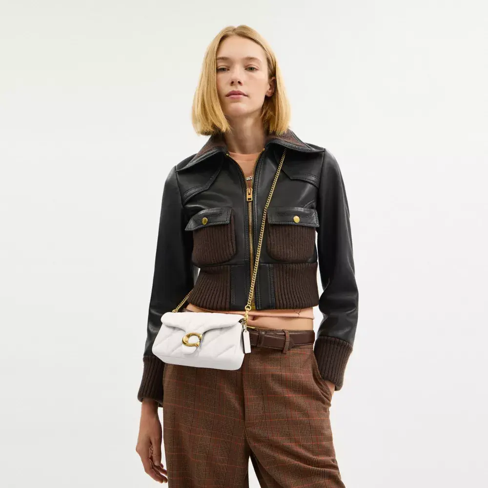 Структурированная сумка через плечо Tabby 19 с ремешком-цепочкой, современная интерпретация дизайна Coach 70-х годов, выполнена из стеганой кожи наппа. Эта двухсекционная модель, дополненная нашей фирменной фурнитурой, идеально подходит для карт, наличных и телефона. Удобный внешний накладной карман обеспечивает легкий доступ к необходимым вещам. Эту универсальную сумку на запястье можно носить как сумочку или через плечо благодаря стильному ремешку-цепочке, что делает ее идеальным выбором как для элегантного, так и для повседневного образа.