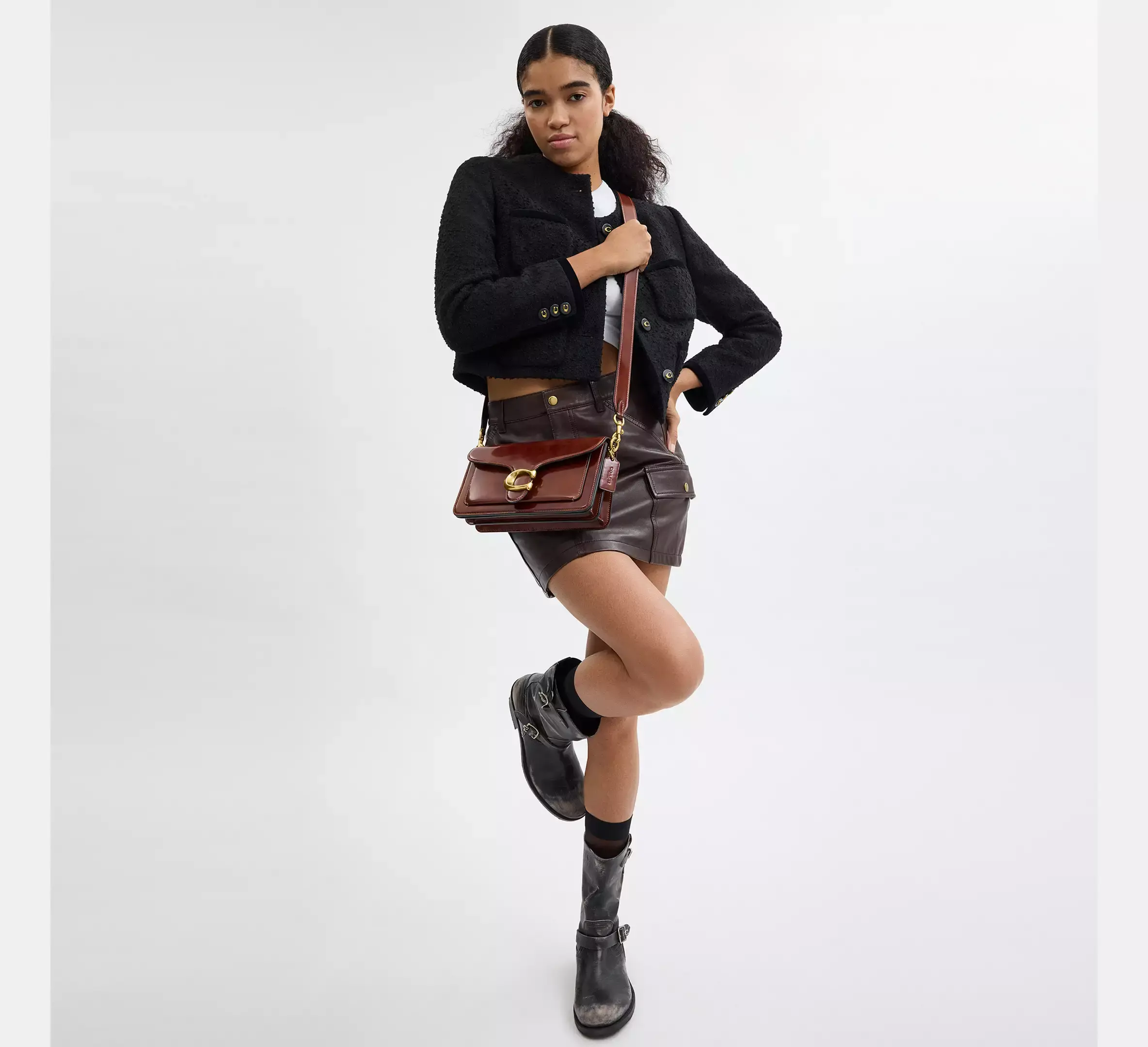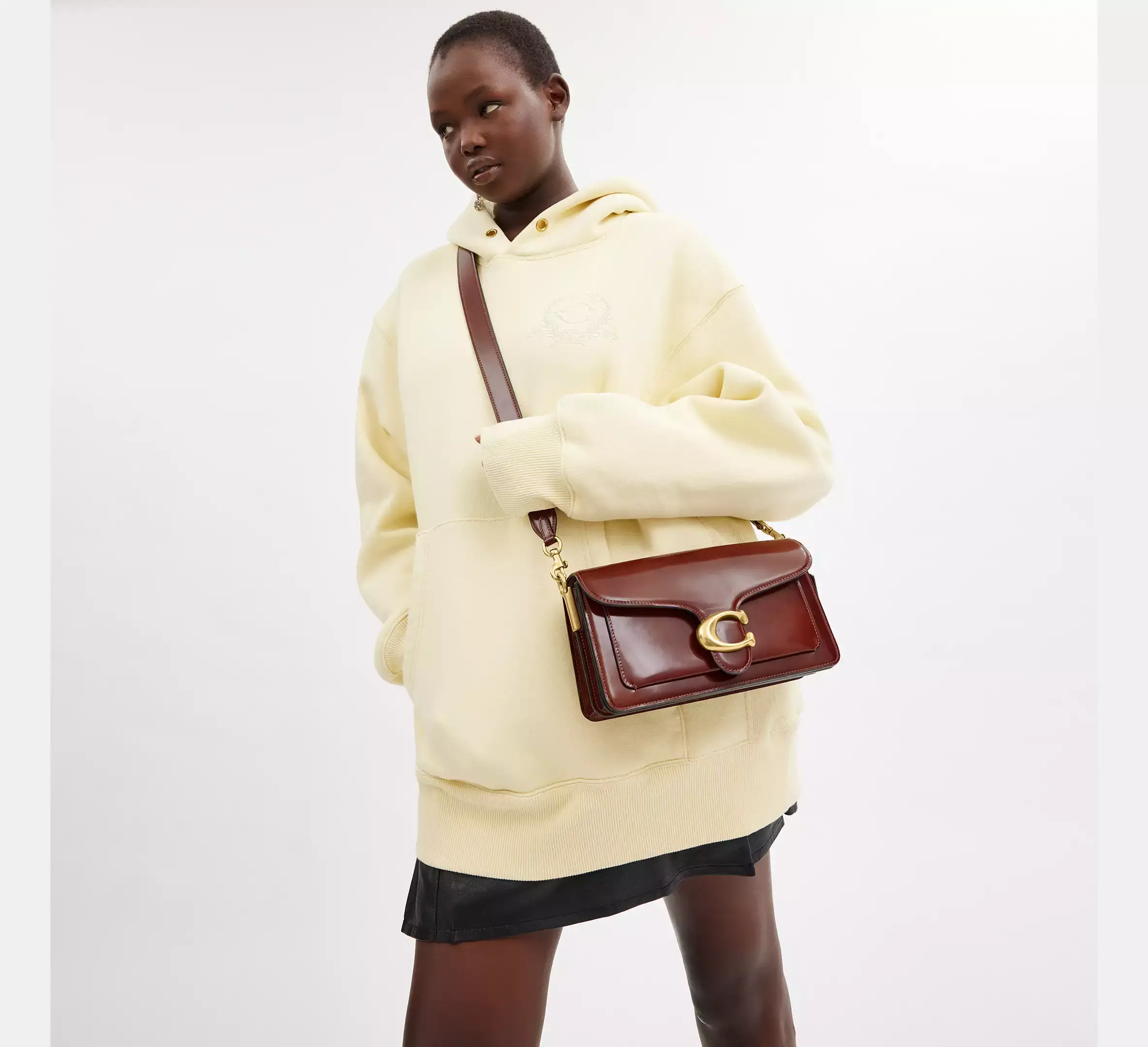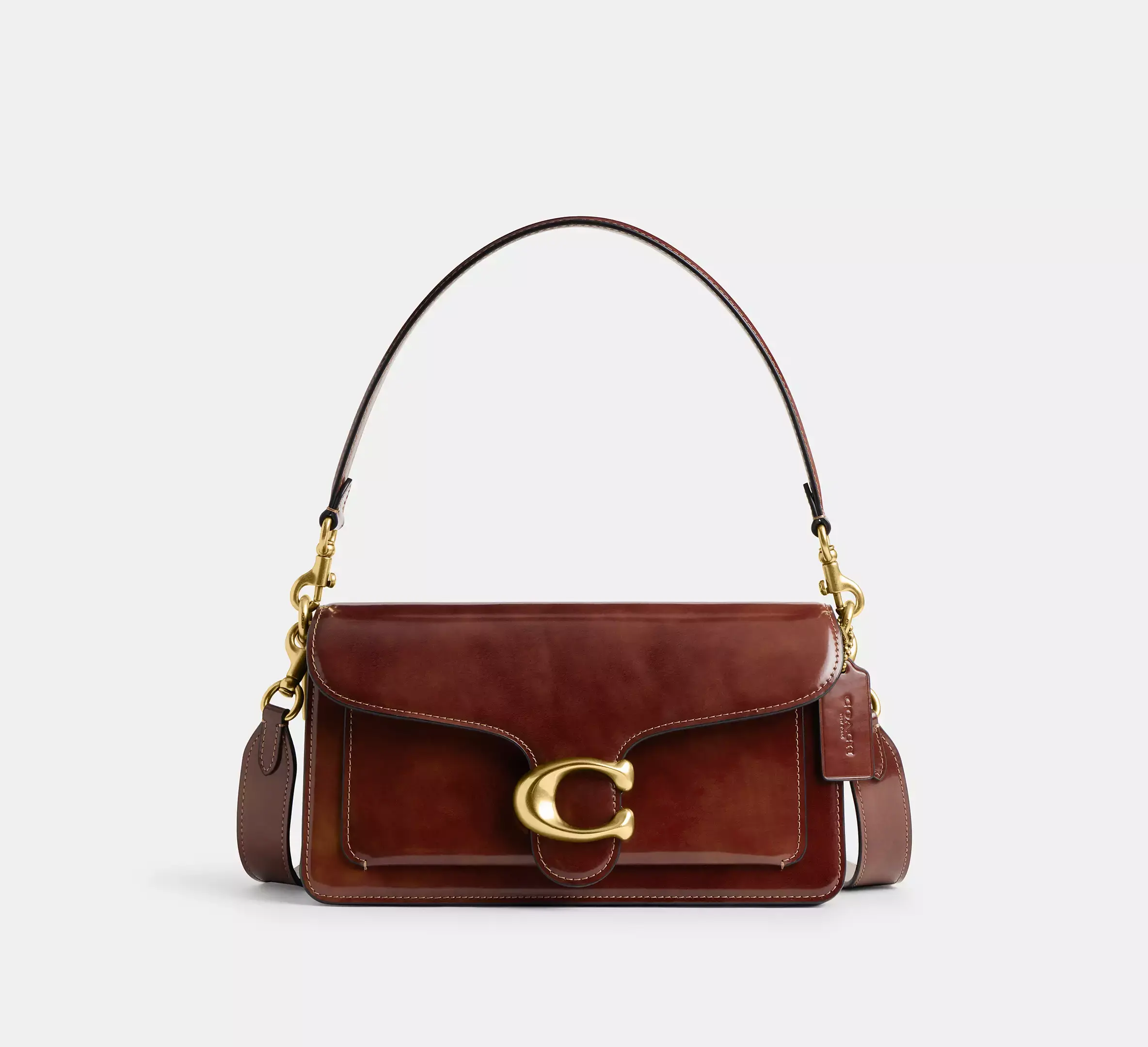 Сумка через плечо Tabby, современная интерпретация дизайна Coach 1970-х годов, изготовлена из блестящей мягкой кожи. Компактная модель 26, дополненная фирменной фурнитурой, оснащена двумя съёмными ремнями для ношения в руке, на плече или через плечо.