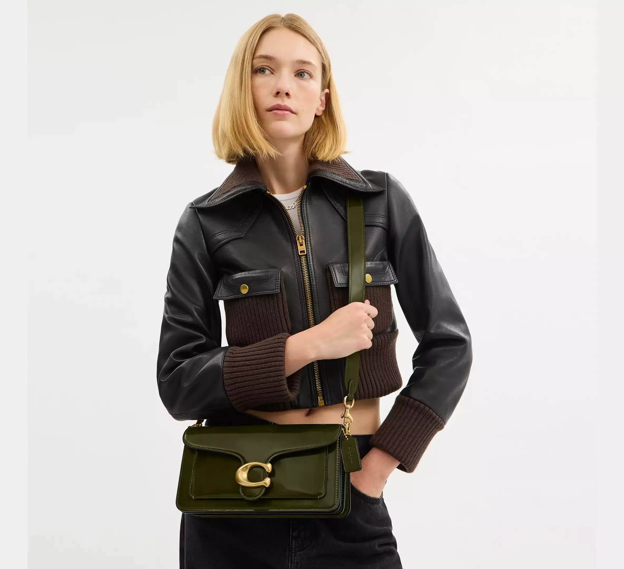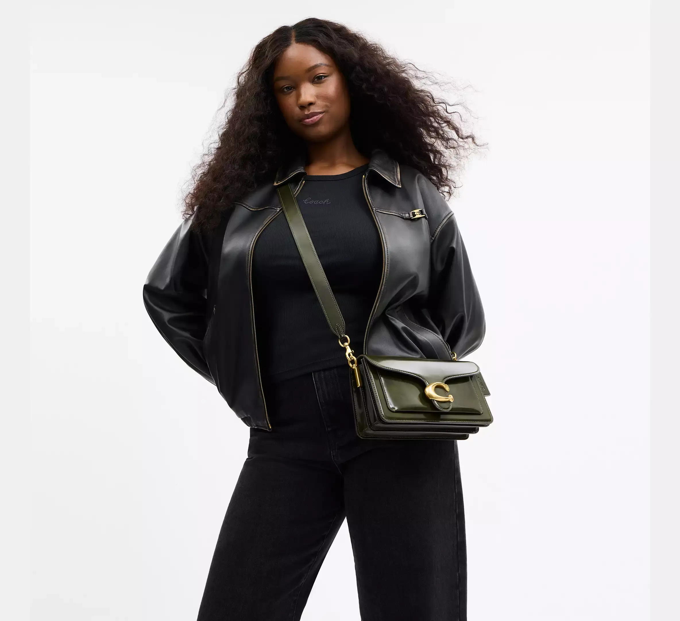 Сумка через плечо Tabby, современная интерпретация дизайна Coach 1970-х годов, изготовлена из блестящей мягкой кожи. Компактная модель 26, дополненная фирменной фурнитурой, оснащена двумя съёмными ремнями для ношения в руке, на плече или через плечо.