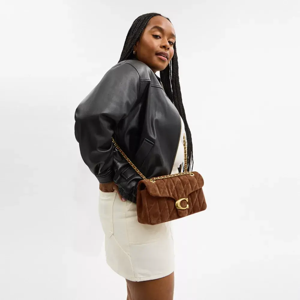Наша сумка через плечо Tabby, современная интерпретация модели Coach 1970-х годов, изготовлена из мягкой стёганой бархатистой замши. Компактная модель 26, дополненная фирменной фурнитурой, оснащена двумя съёмными ремешками для ношения в руке, на плече или через плечо.