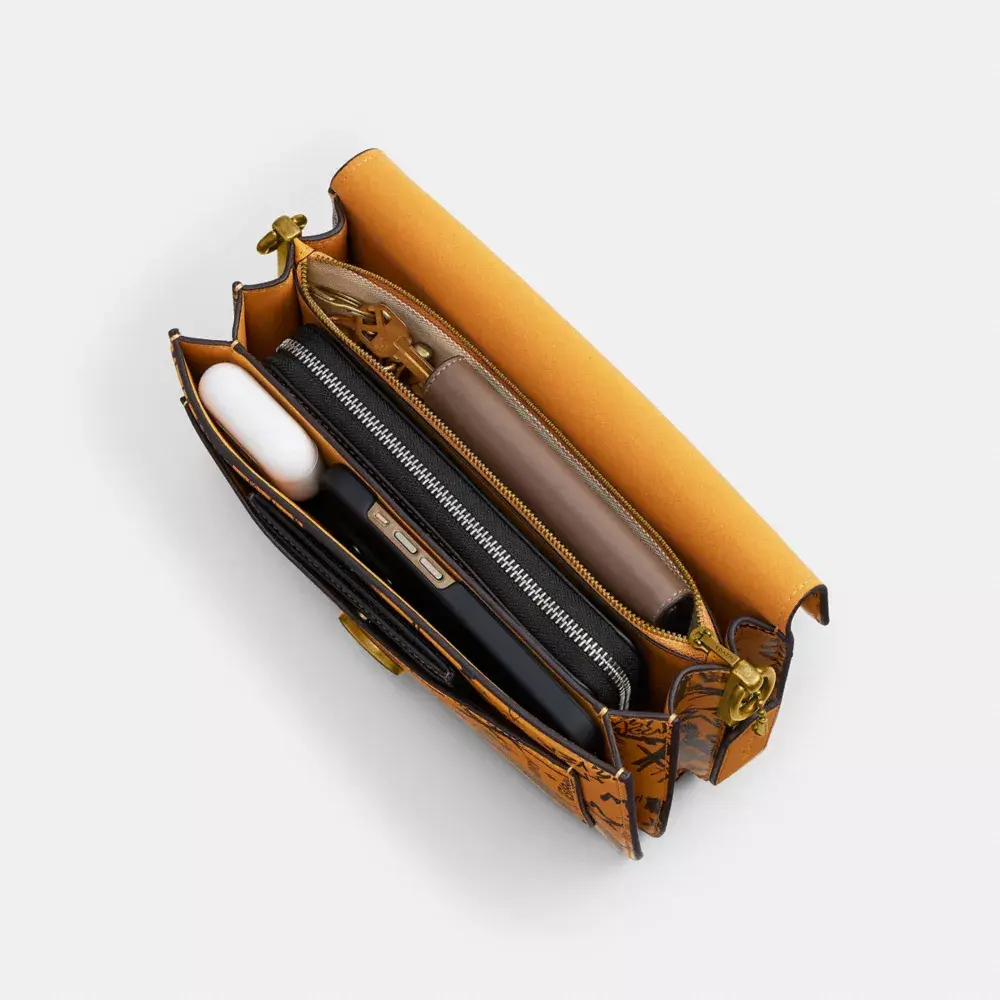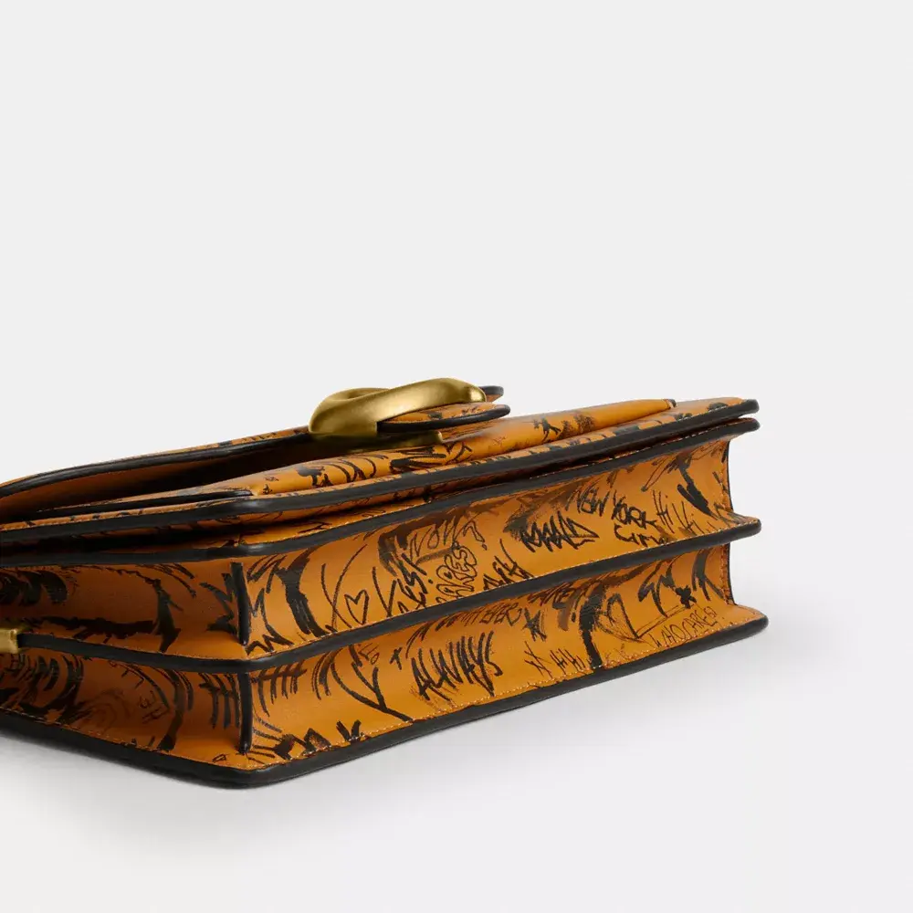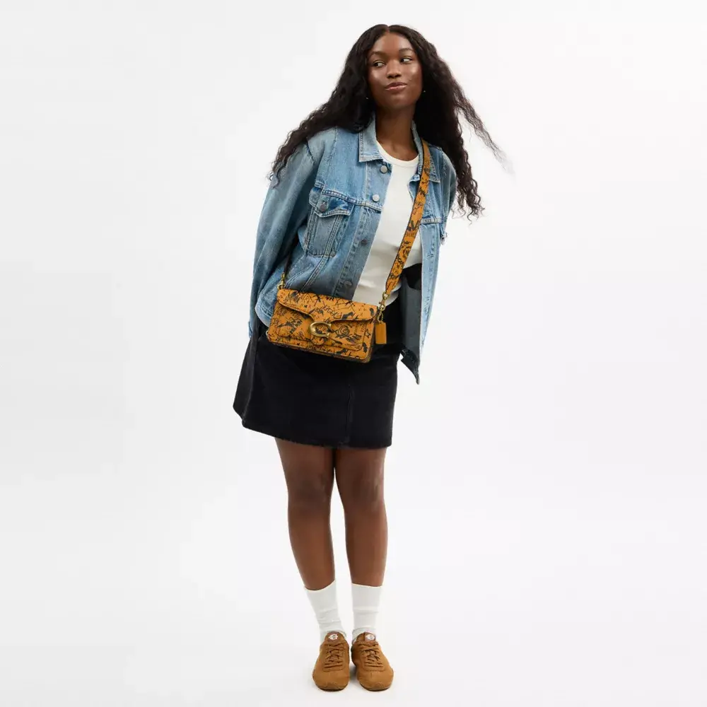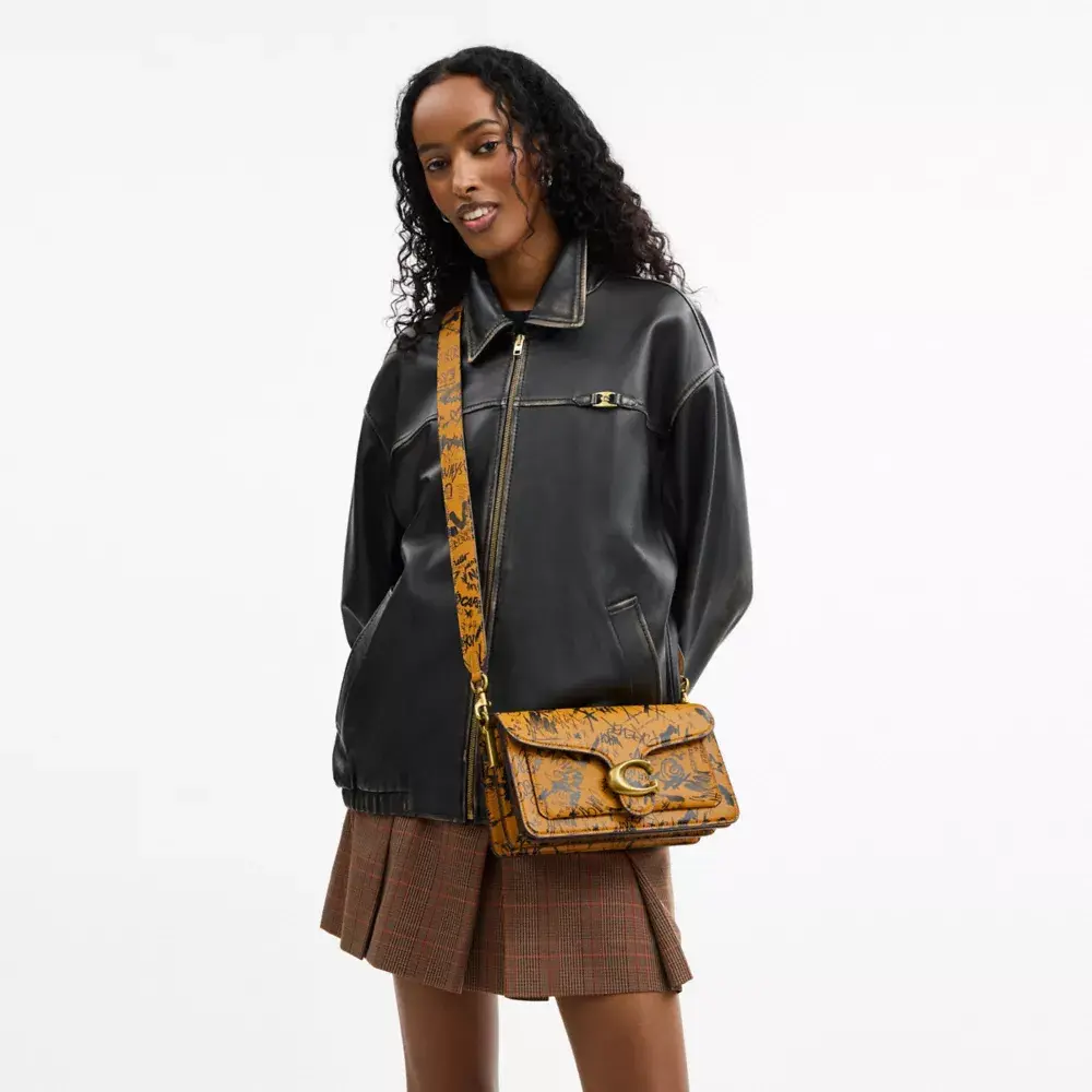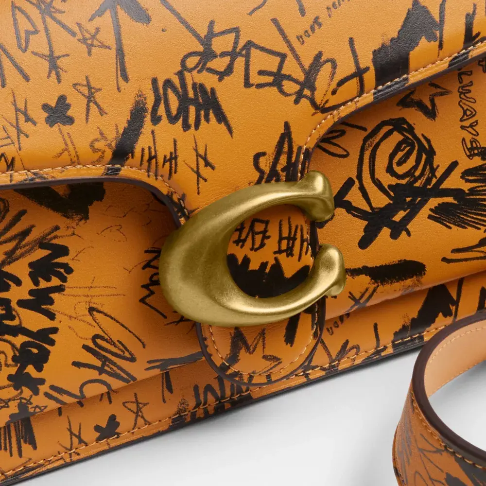 Наша структурированная сумка через плечо Tabby, современная интерпретация дизайна Coach 1970-х годов, выполнена из мягкой дубленой кожи с ярким принтом в виде граффити, вдохновлённым энергией Нью-Йорка. Компактная модель 26-го размера, дополненная фирменной фурнитурой, оснащена двумя съёмными ремнями для ношения в руке, на плече или через плечо.