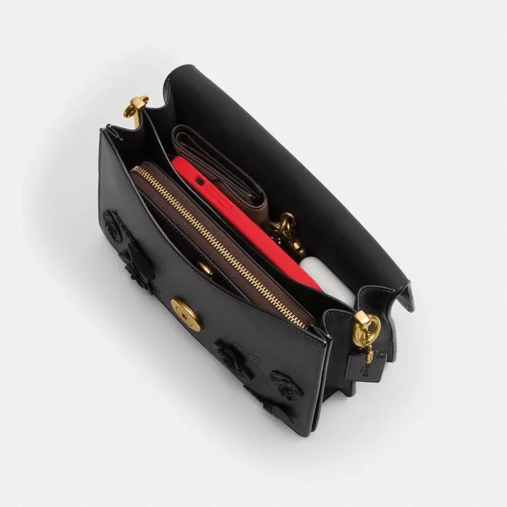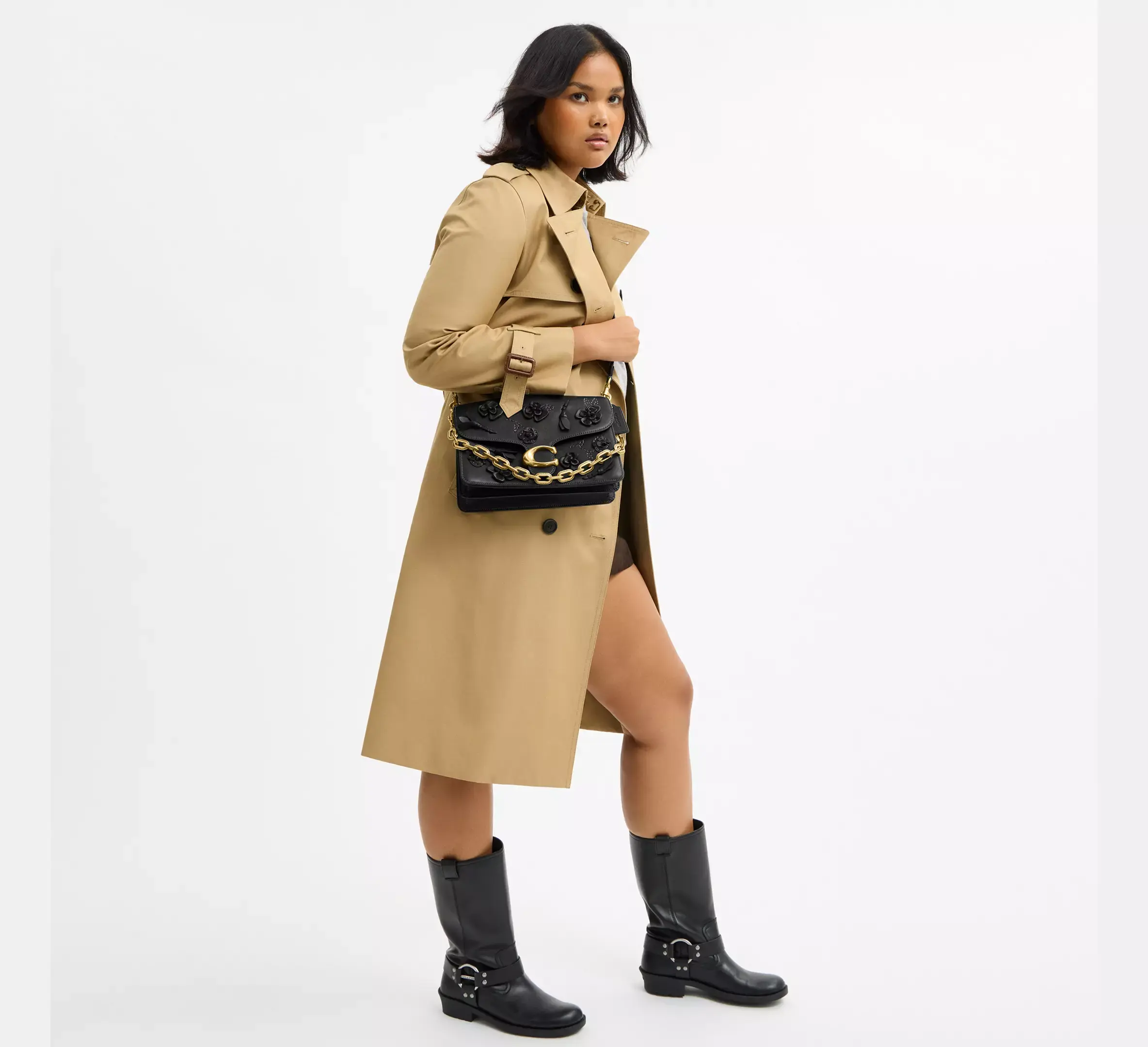 Сумка через плечо Structured Chain Tabby – это современная интерпретация дизайна Coach 70-х годов. Она выполнена из мягкой, драпированной натуральной кожи и украшена вручную изысканной цветочной аппликацией в винтажном стиле. Эта компактная модель, дополненная нашей фирменной фурнитурой, создающей культовый образ, вмещает все необходимое, имеет внутренние многофункциональные карманы-органайзеры и удобный внешний карман на молнии для легкого доступа. Универсальный дизайн дополнен тремя съемными ремешками: ее можно носить в руке, на плече с помощью элегантного прошитого ремешка-цепочки и короткого кожаного ремешка, или через плечо с помощью длинного кожаного ремешка, чтобы руки были свободны.
