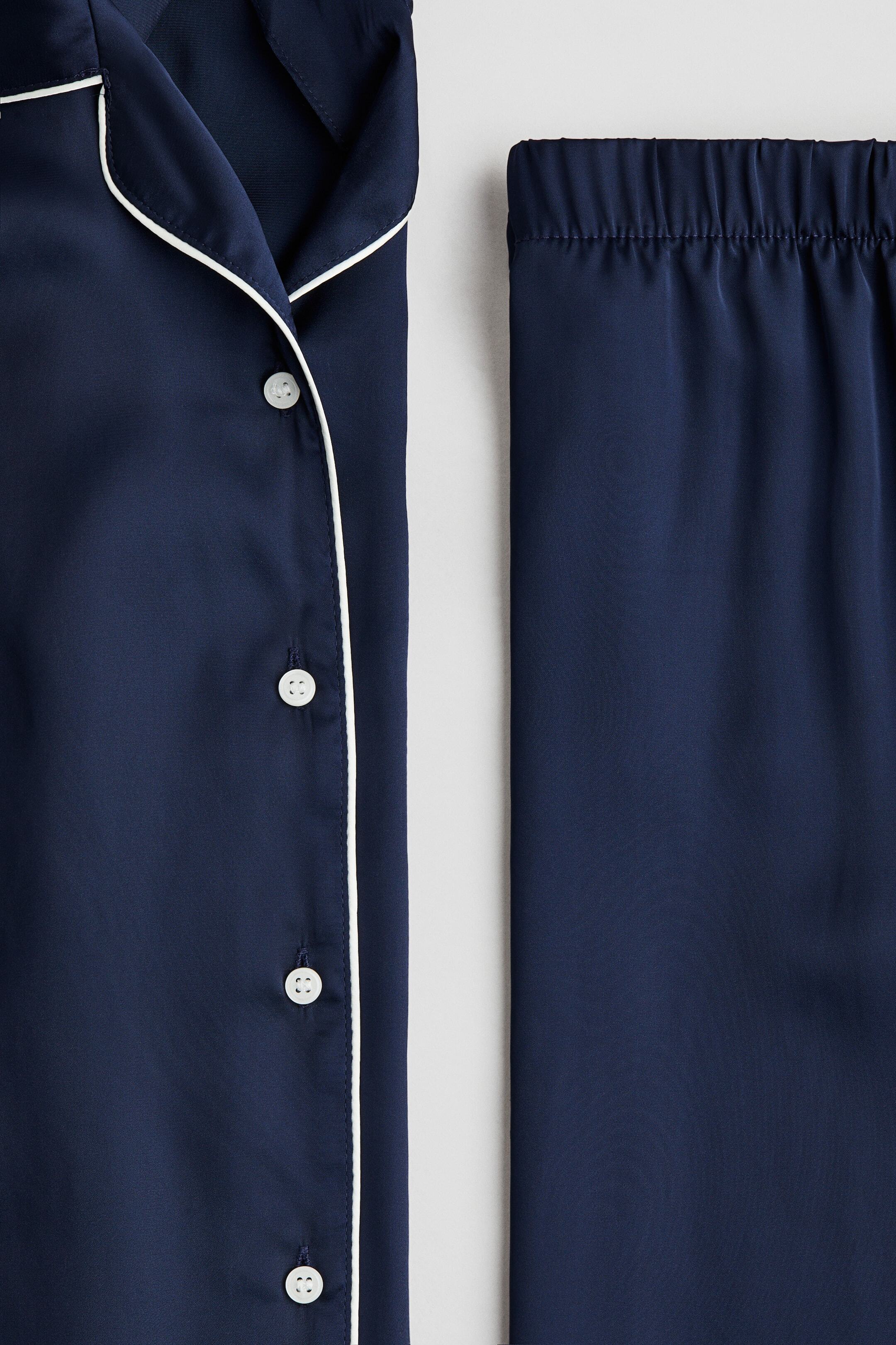 Мягкий атласный пижамный комплект с контрастной окантовкой и брюками в тон. Рубашка с длинными рукавами, круглым вырезом и застежкой на пуговицы спереди. Эластичный пояс и прямые брюки.