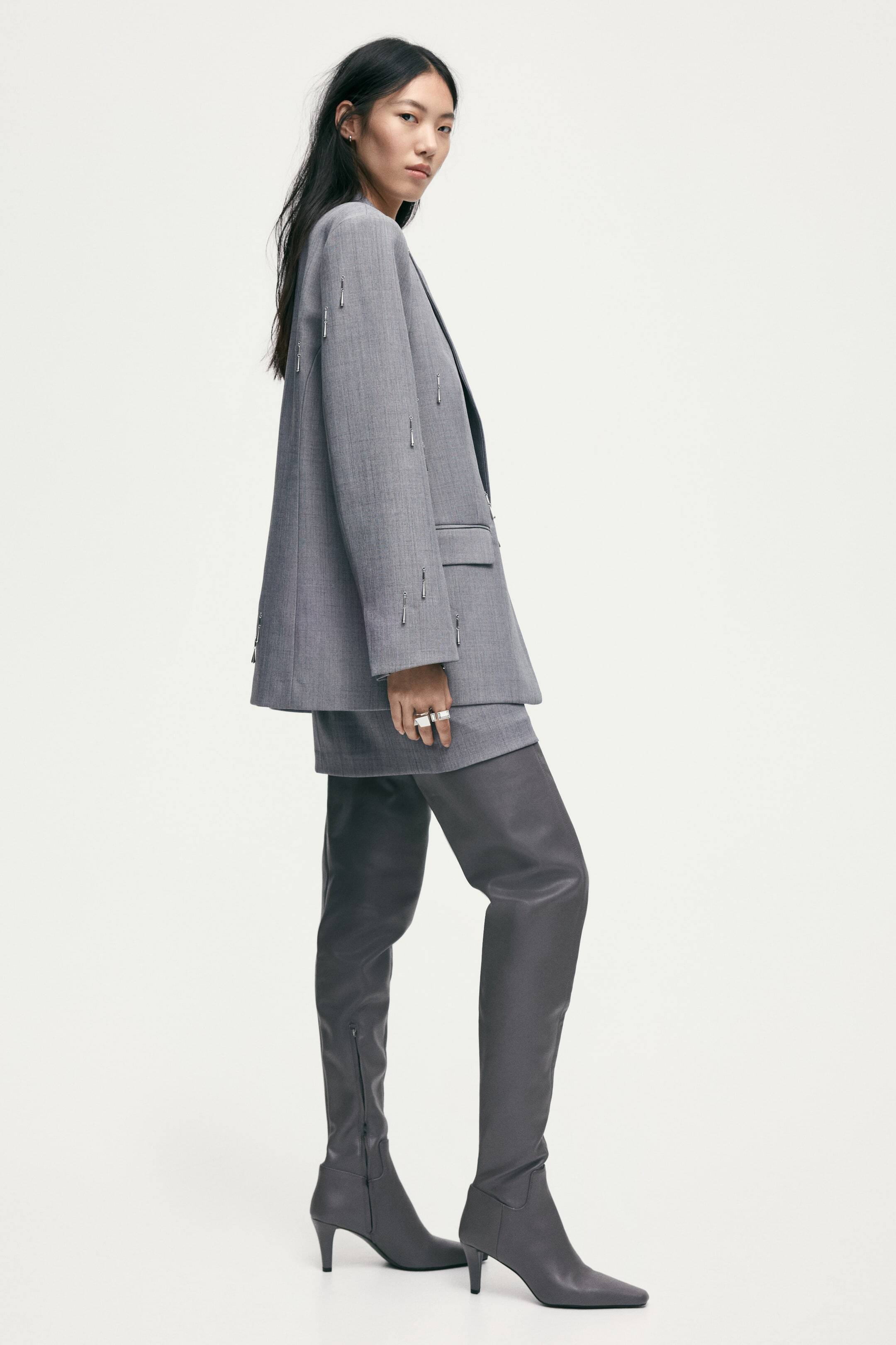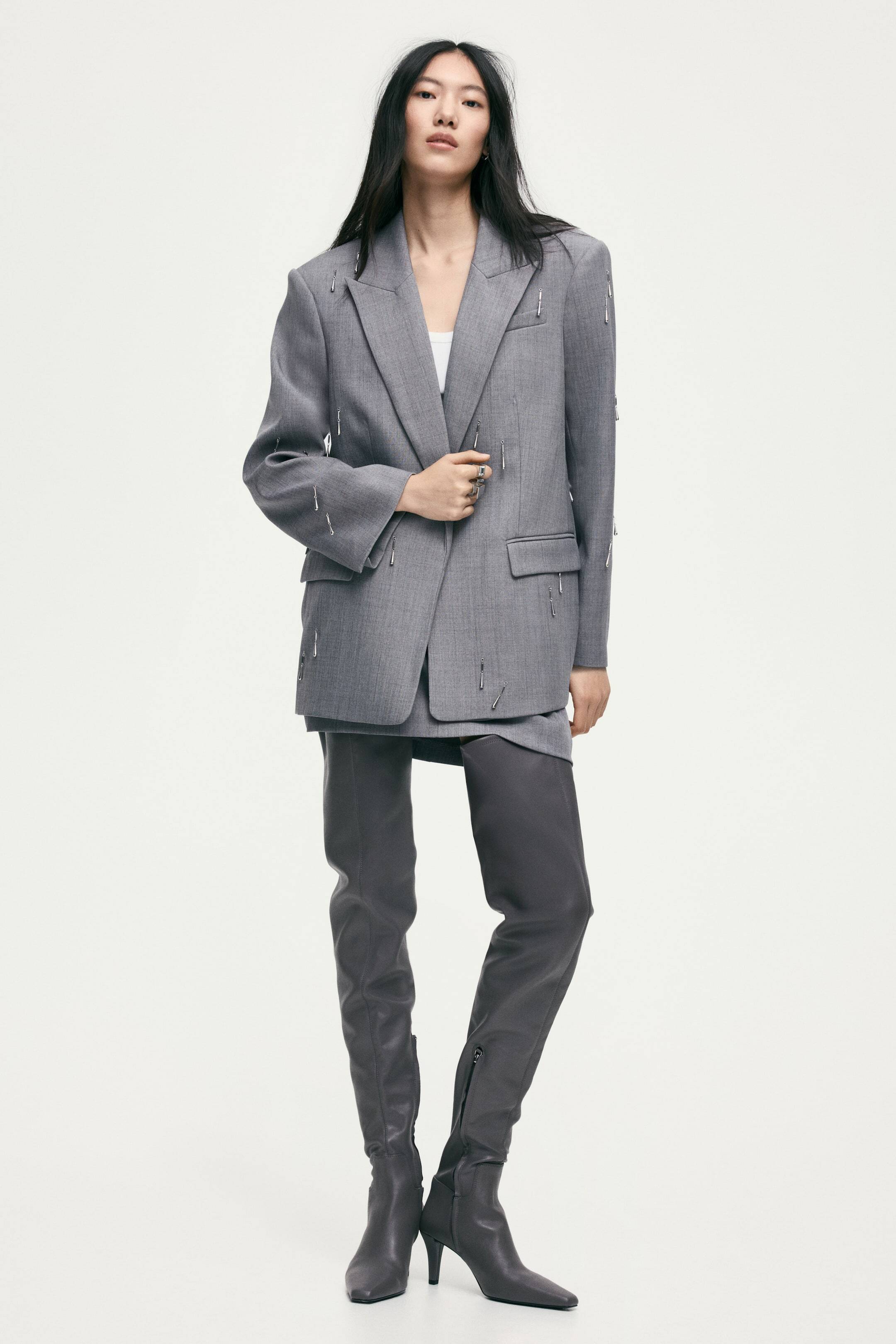 Блейзер свободного кроя из тканого материала с равномерно распределенной отделкой серебристым бисером. Подплечники с подкладкой, острые лацканы и потайная застежка на пуговицы спереди. Прорезной нагрудный карман, передние карманы с двумя клапанами и внутренний карман на пуговице. Разрезные манжеты и одна шлица сзади. На подкладке.