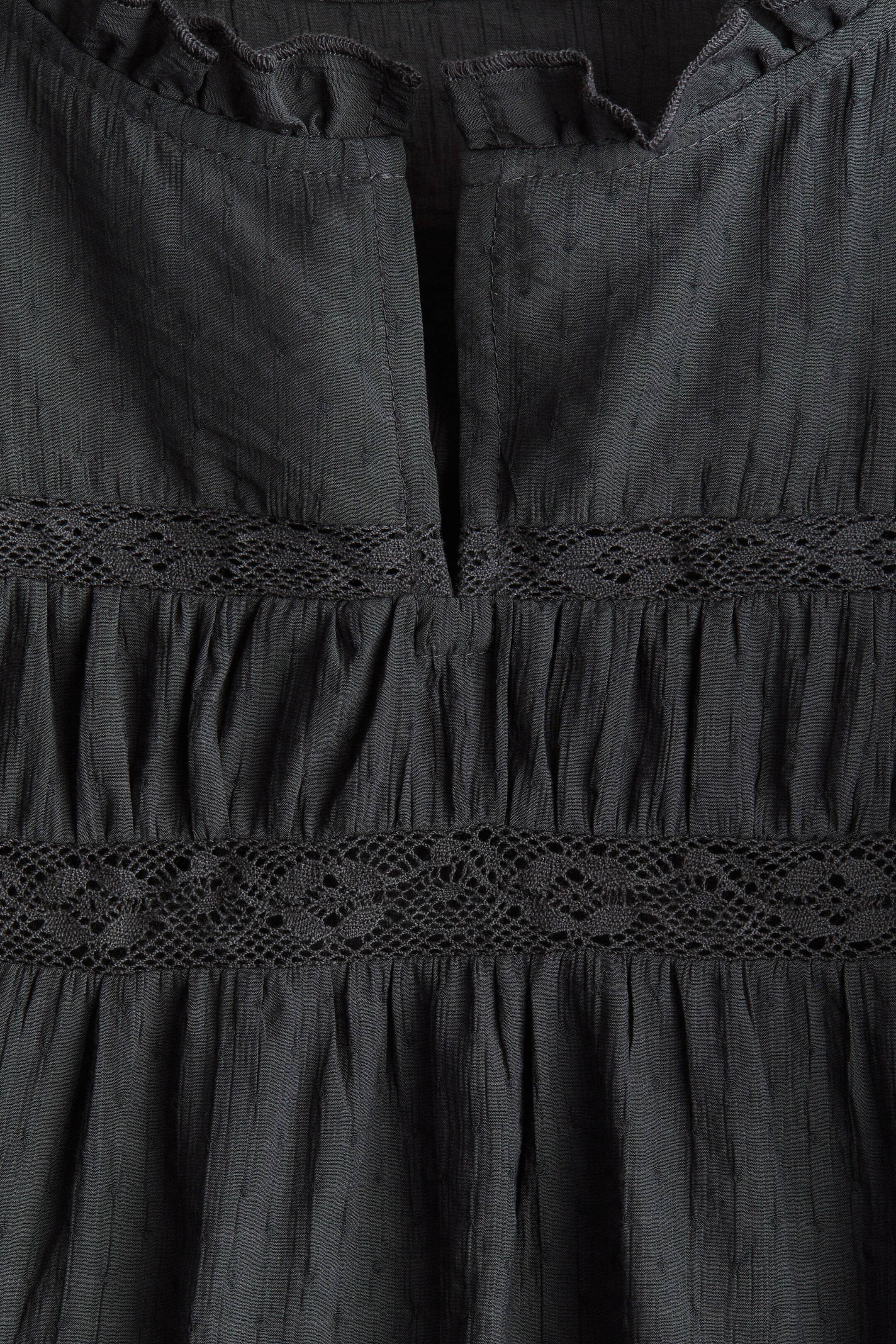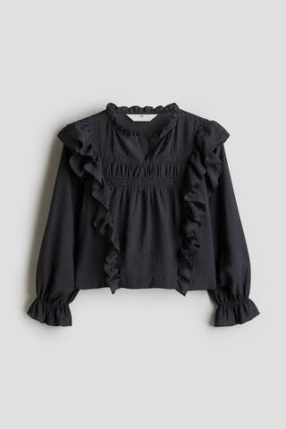 Блузка свободного кроя из мягкой, воздушной ткани с оверлочным подолом. Короткий воротничок с оборкой и разрезом, кокетка с кружевной отделкой спереди, оборка спереди, переходящая на плечи, и длинные рукава с эластичными манжетами с оборкой.