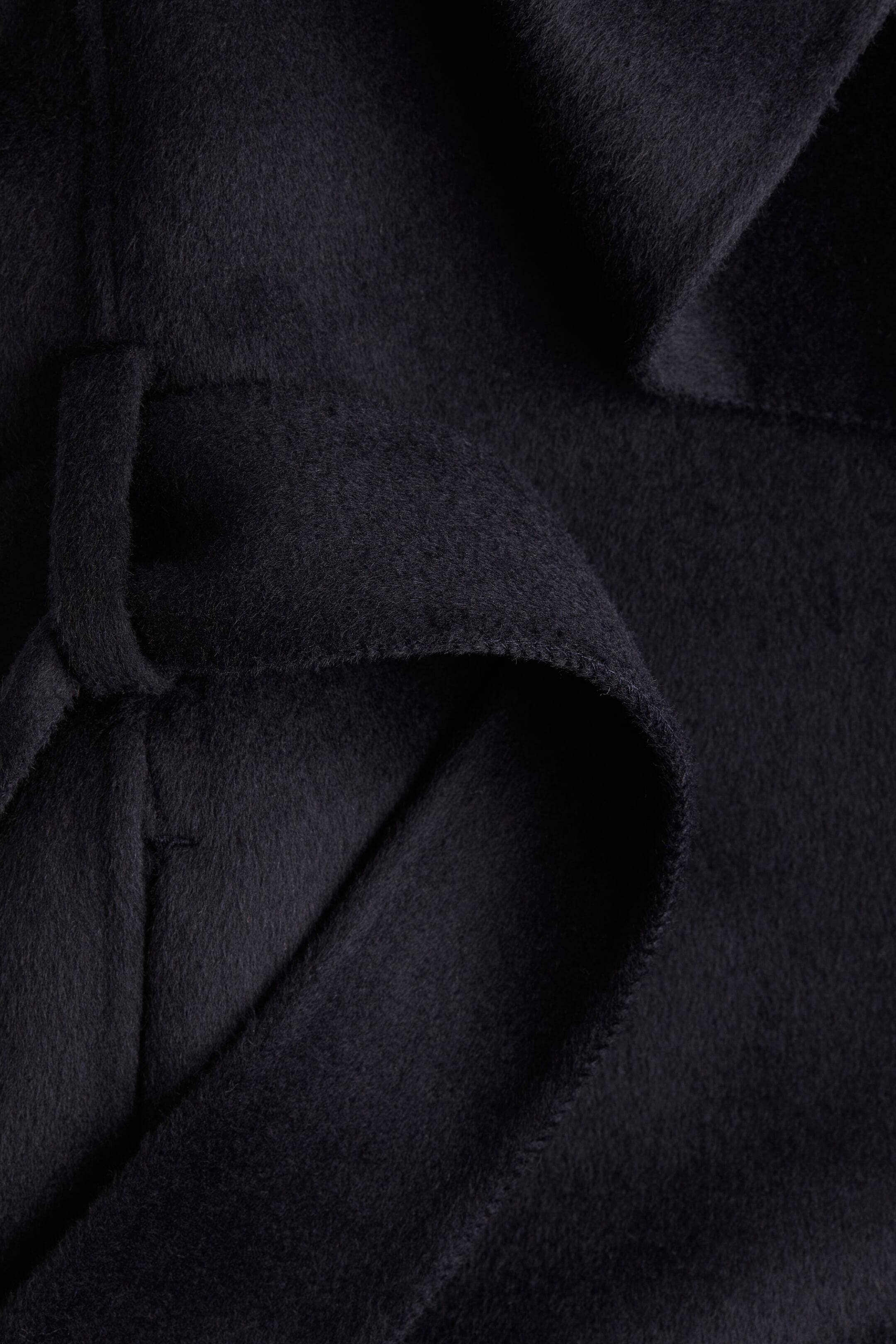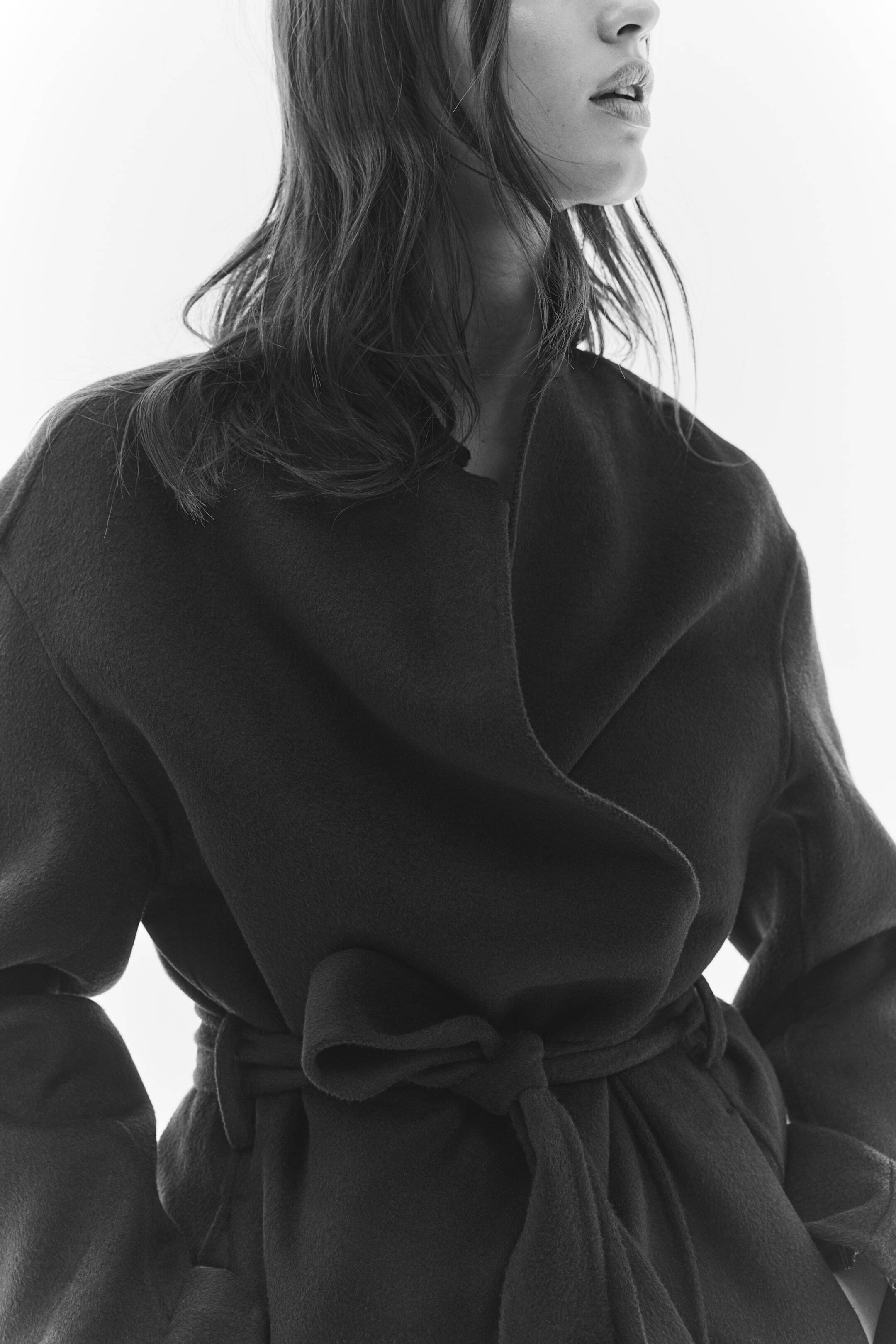 Длинное пальто ручной работы из фетровой шерстяной смеси. Открытый перед, съёмный пояс на талии, свободный крой, спущенная линия плеча, потайные боковые карманы и шлица сзади. Без подкладки.