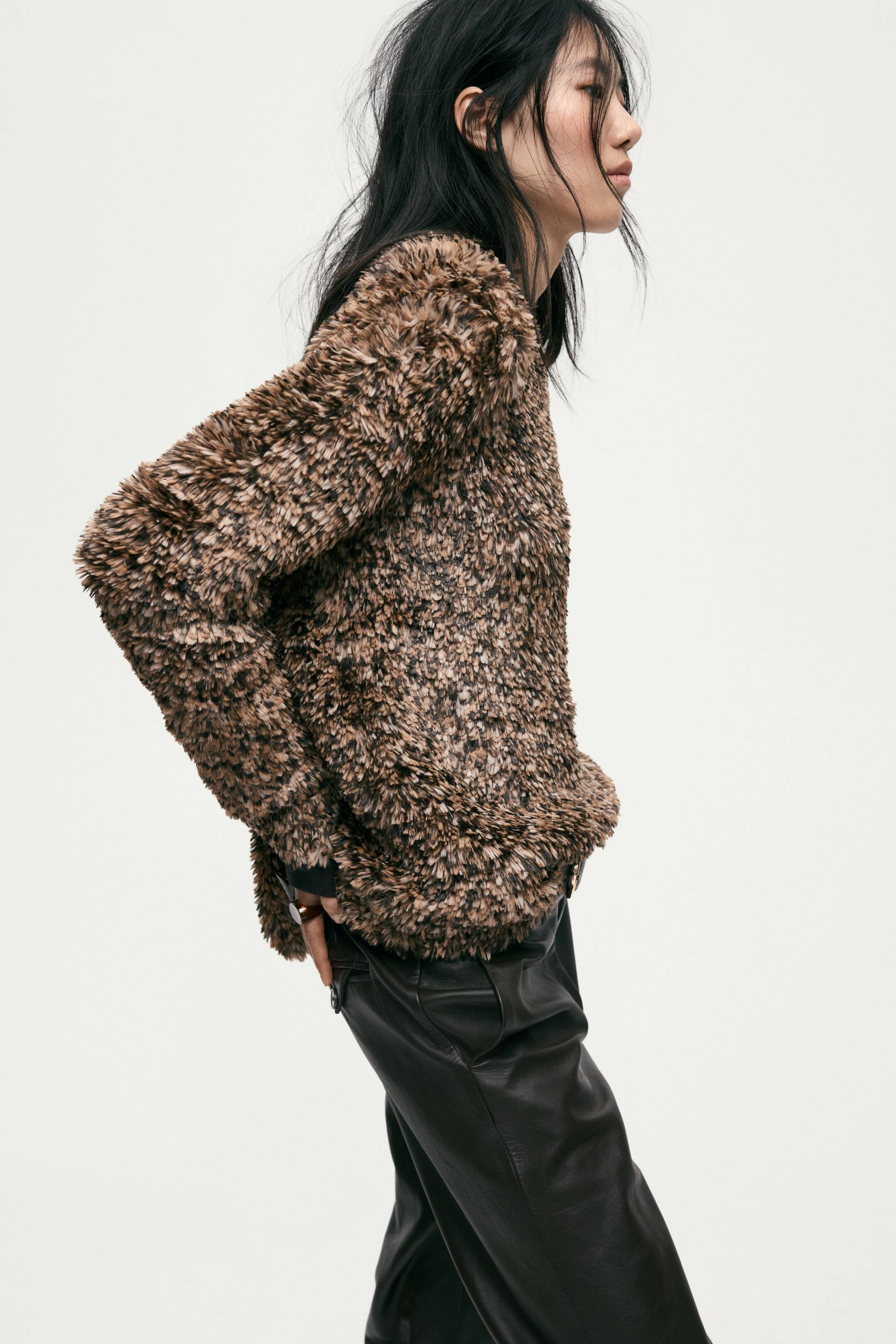 Приталенный джемпер рубчатой вязки с круглой горловиной, длинными рукавами, ребристыми манжетами и подолом.