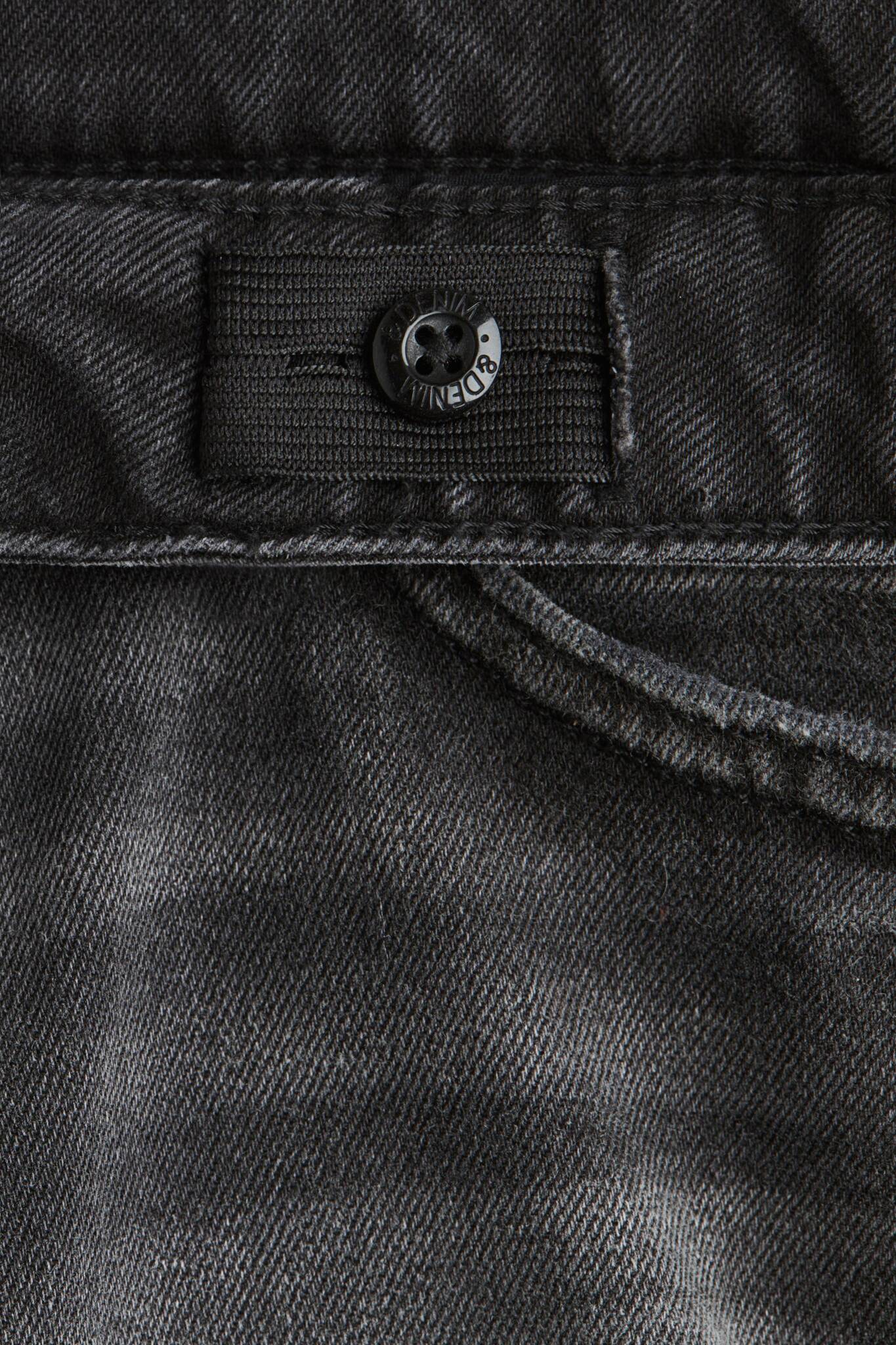 Джинсы с пятью карманами из стираного денима. Свободный крой на бедрах, низкая посадка и широкие штанины. Низкая талия с регулируемой резинкой для идеальной посадки, застежка на молнию и пуговицу.