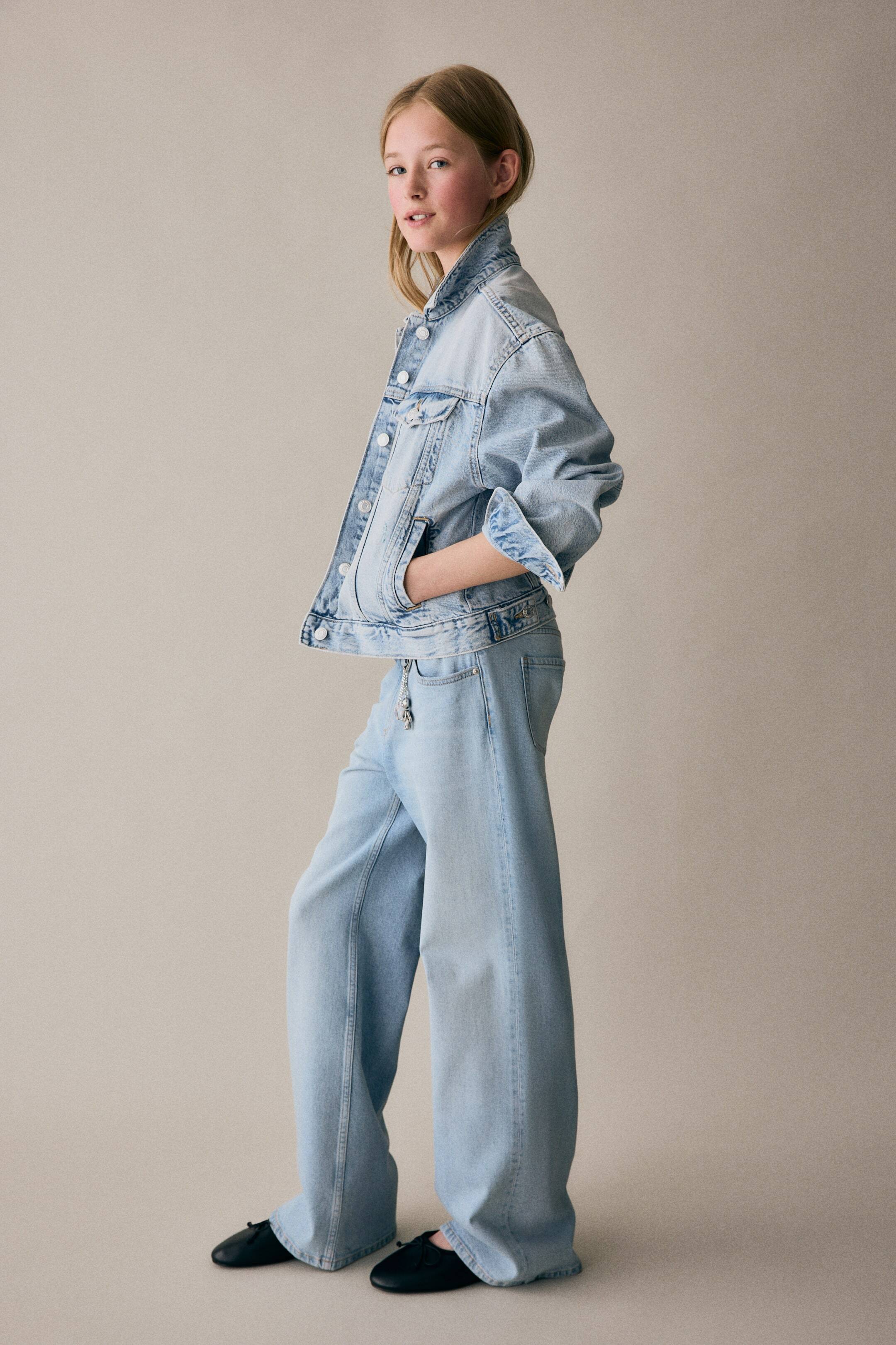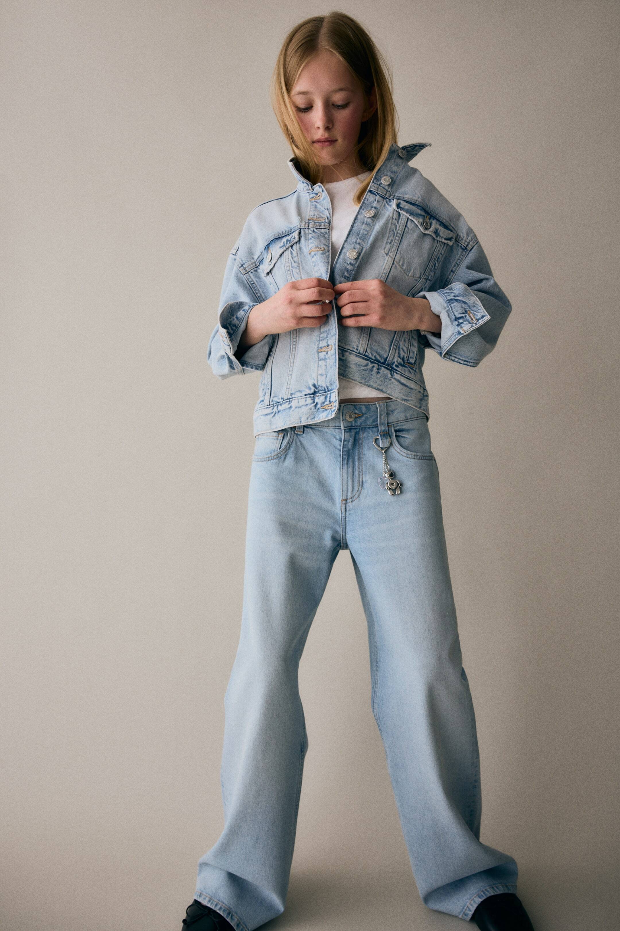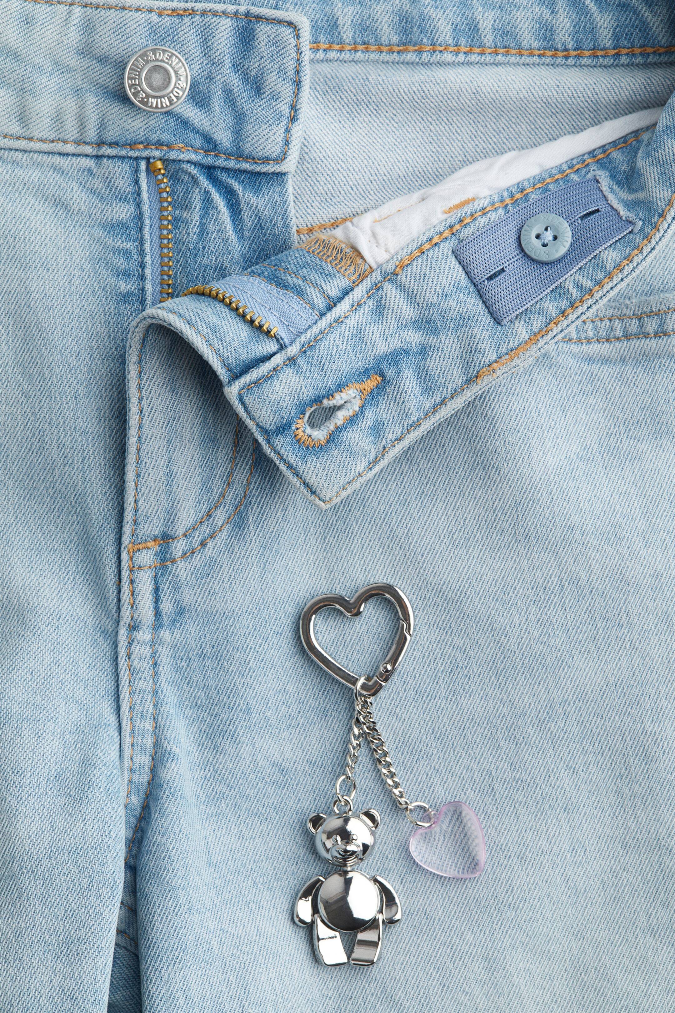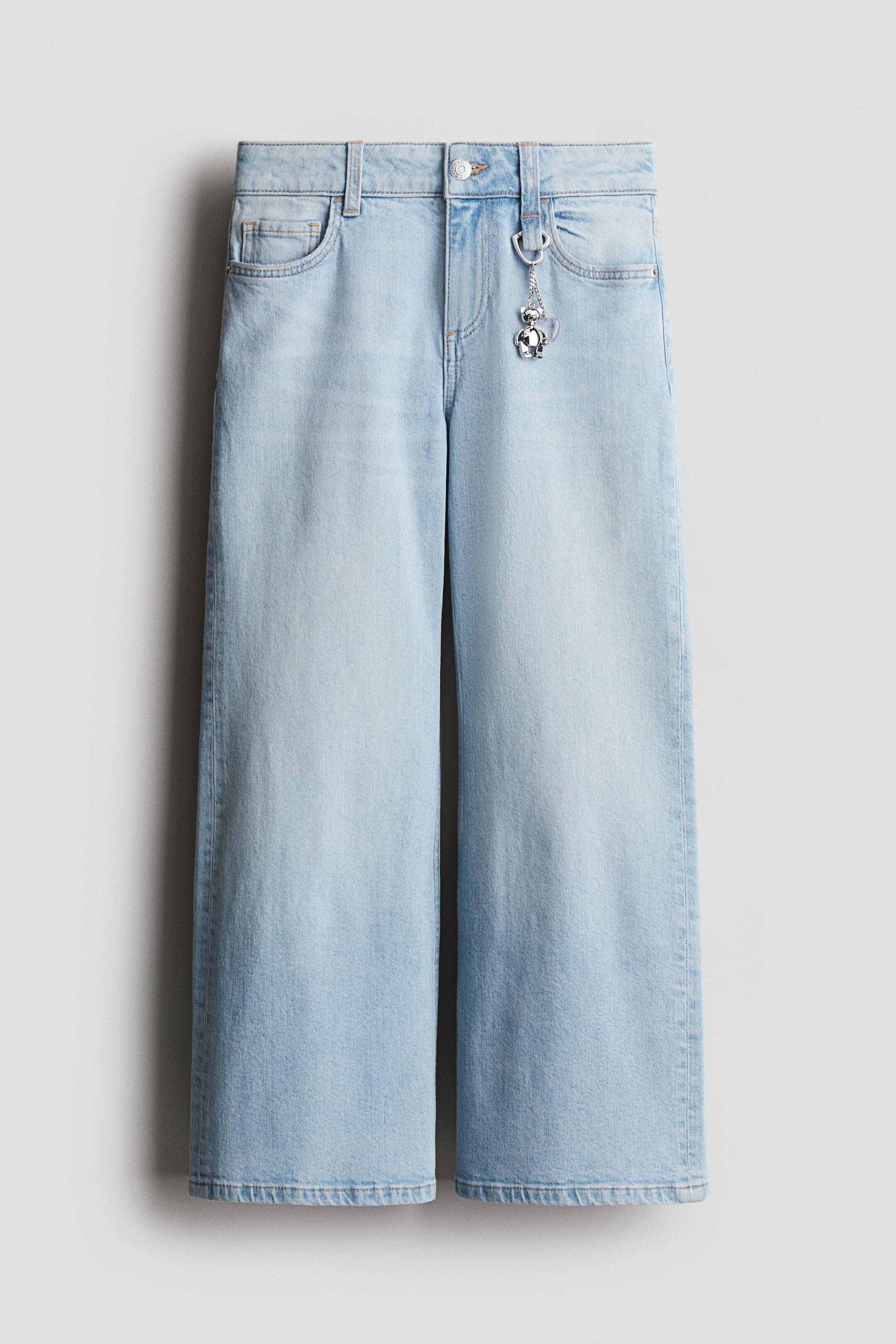 Брюки из стираного денима с пятью карманами и декоративными деталями. Свободный крой на бедрах, низкая посадка и широкие штанины. Регулируемый пояс на резинке с низкой посадкой для идеальной посадки. Застежка на молнию и пуговицу.