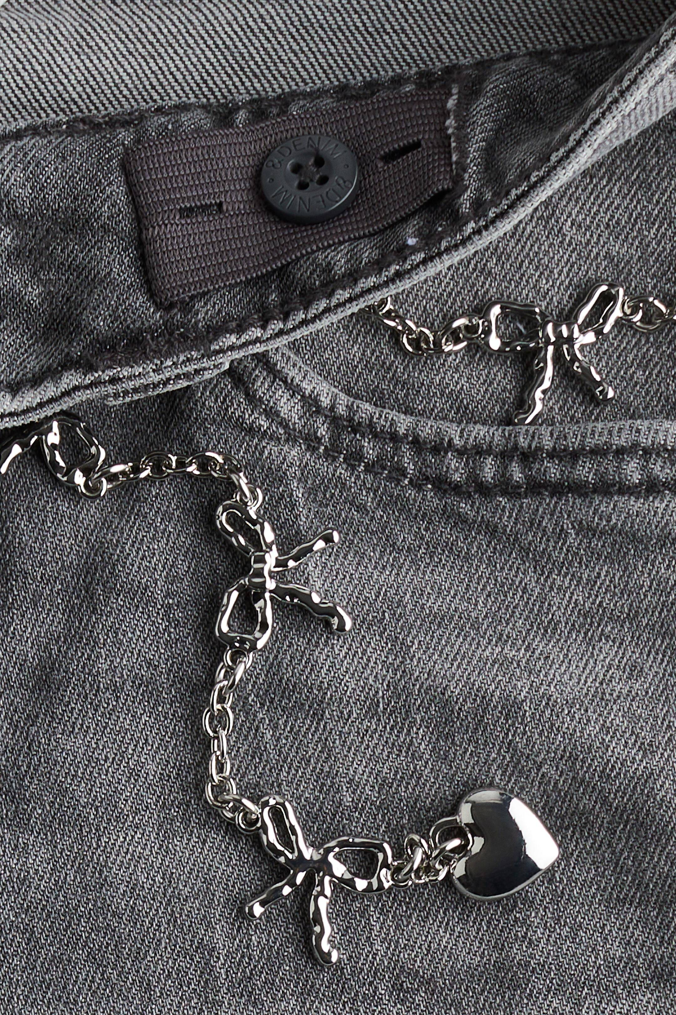 Брюки из стираного денима с пятью карманами и декоративными деталями. Свободный крой на бедрах, низкая посадка и широкие штанины. Регулируемый пояс на резинке с низкой посадкой для идеальной посадки. Застежка на молнию и пуговицу.