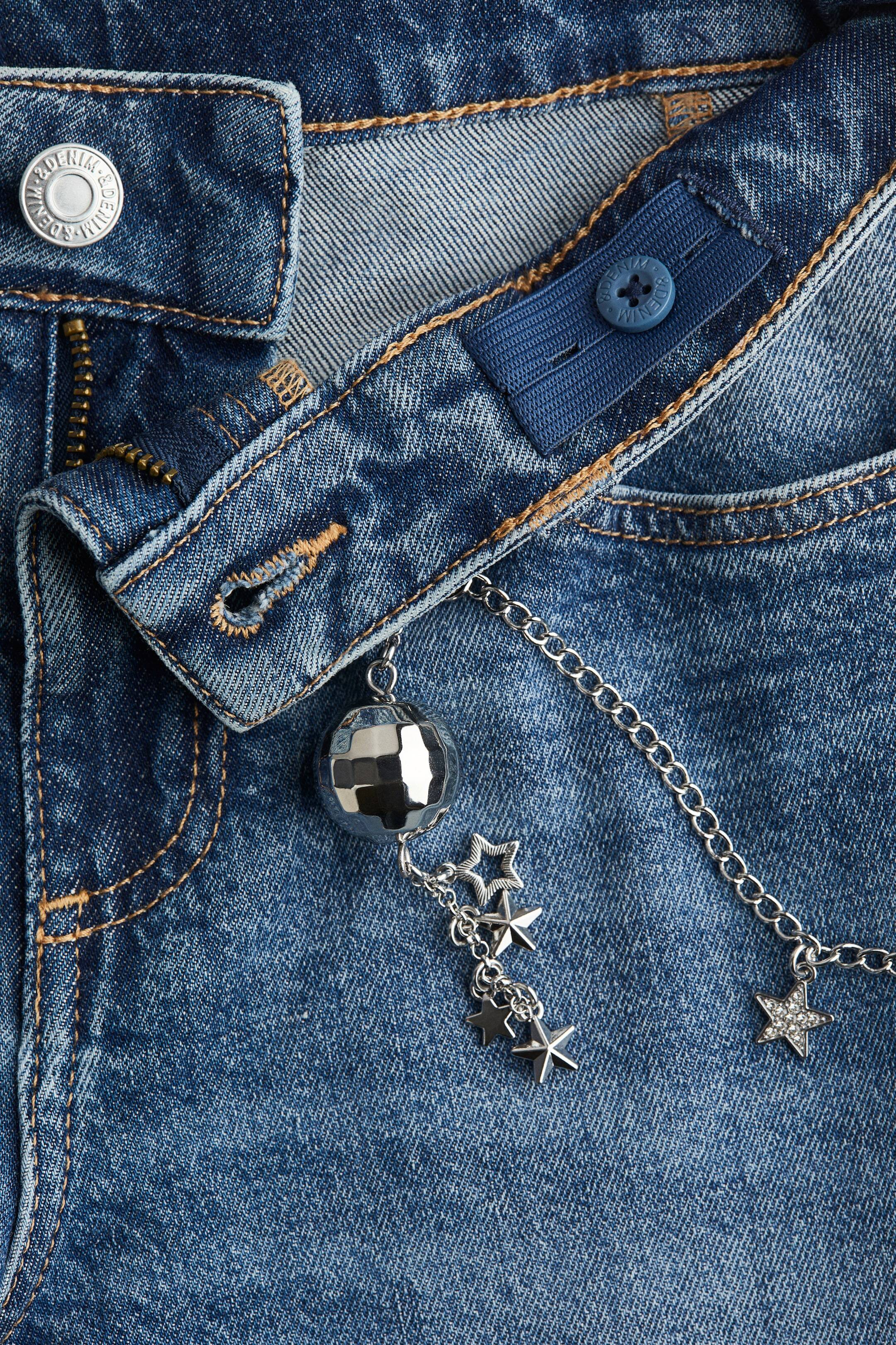 Брюки из стираного денима с пятью карманами и декоративными деталями. Свободный крой на бедрах, низкая посадка и широкие штанины. Регулируемый пояс на резинке с низкой посадкой для идеальной посадки. Застежка на молнию и пуговицу.