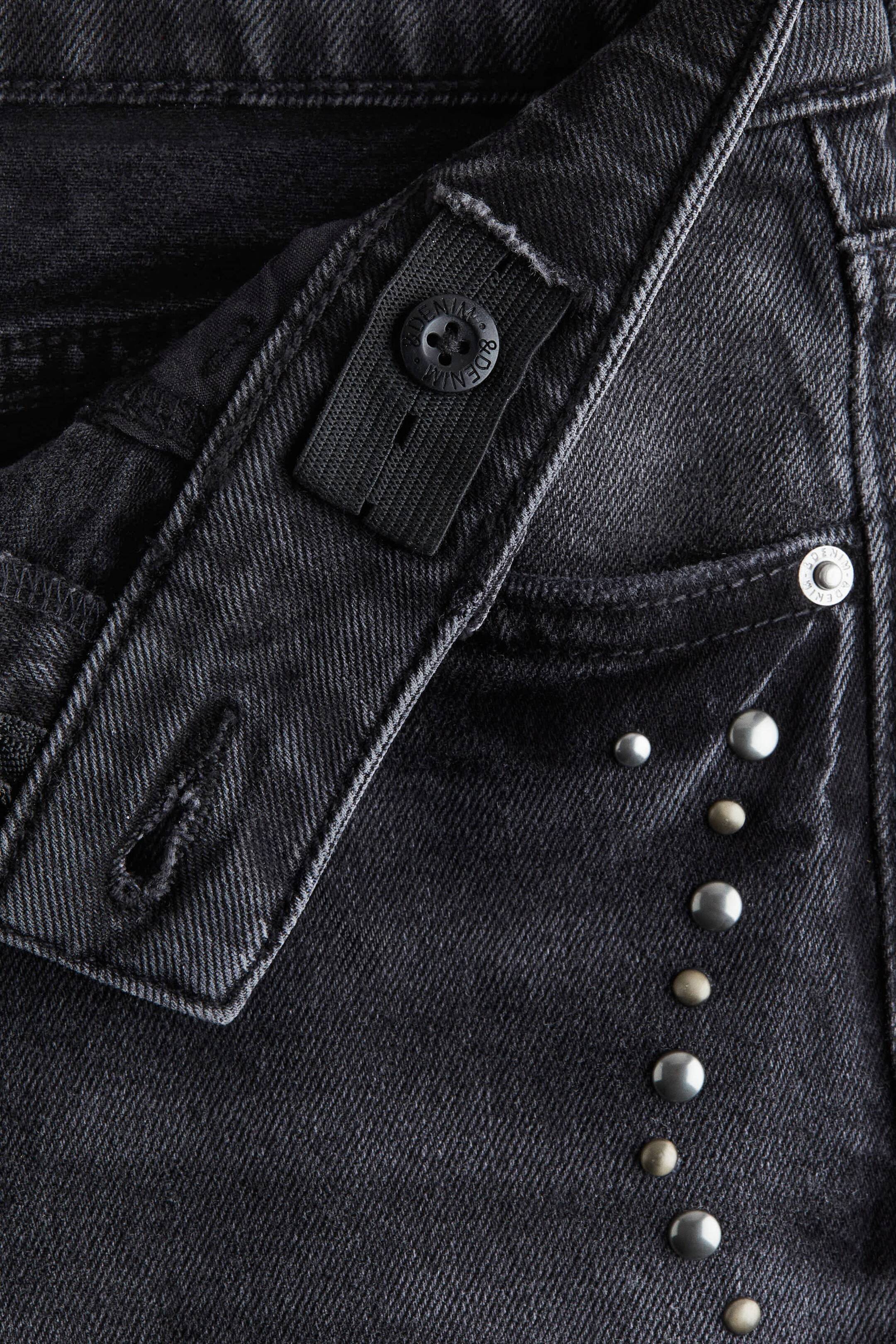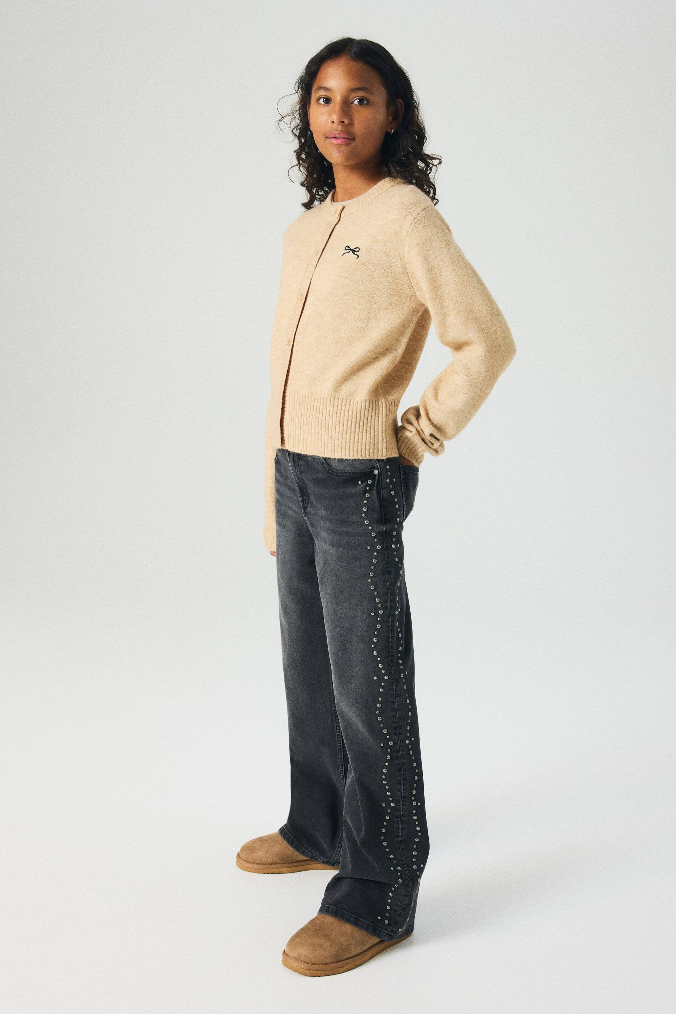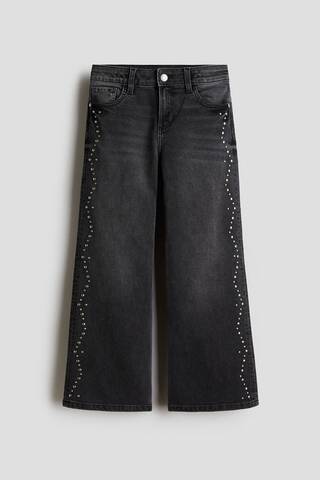 Брюки из стираного денима с пятью карманами и декоративными деталями. Свободный крой на бедрах, низкая посадка и широкие штанины. Регулируемый пояс на резинке с низкой посадкой для идеальной посадки. Застежка на молнию и пуговицу.