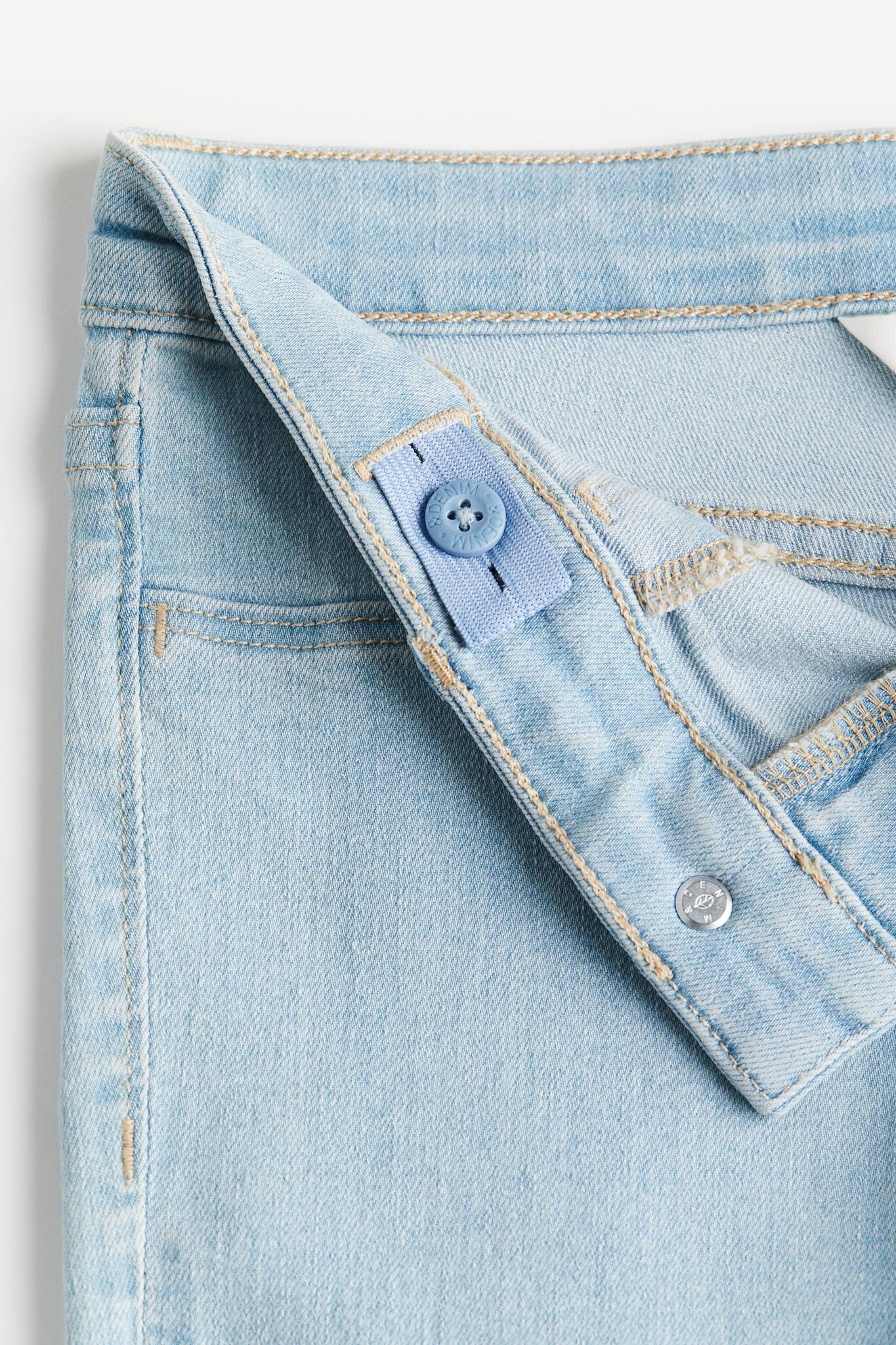 Брюки из суперэластичного денима для максимальной свободы движений. Узкий крой в области бёдер и ягодиц, широкие штанины. Регулируемый пояс на резинке с низкой посадкой, застёжка-молния на пуговице, ложные передние карманы и открытые задние карманы.