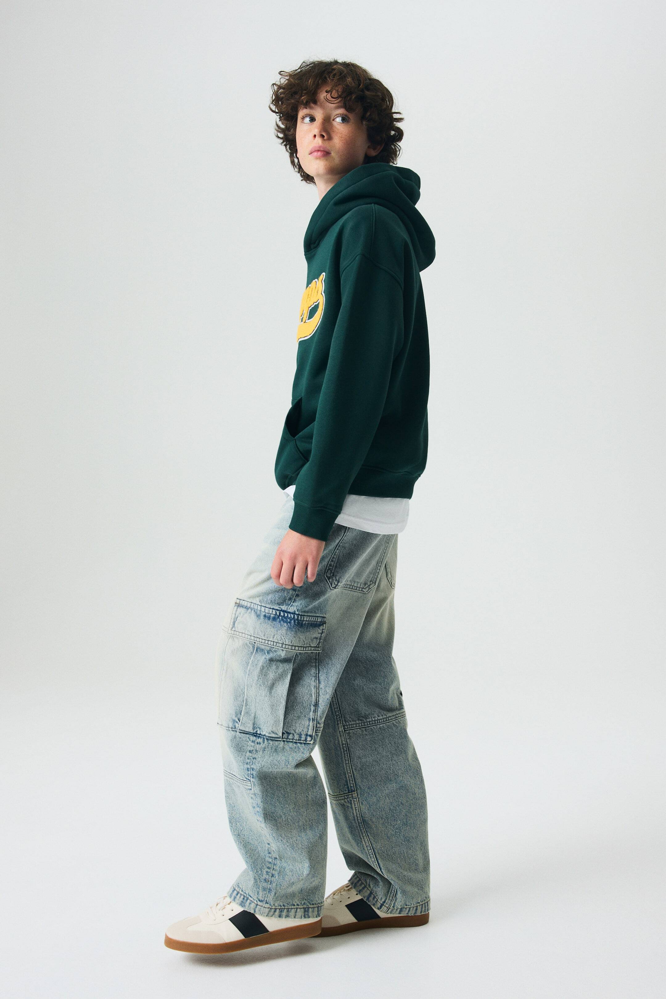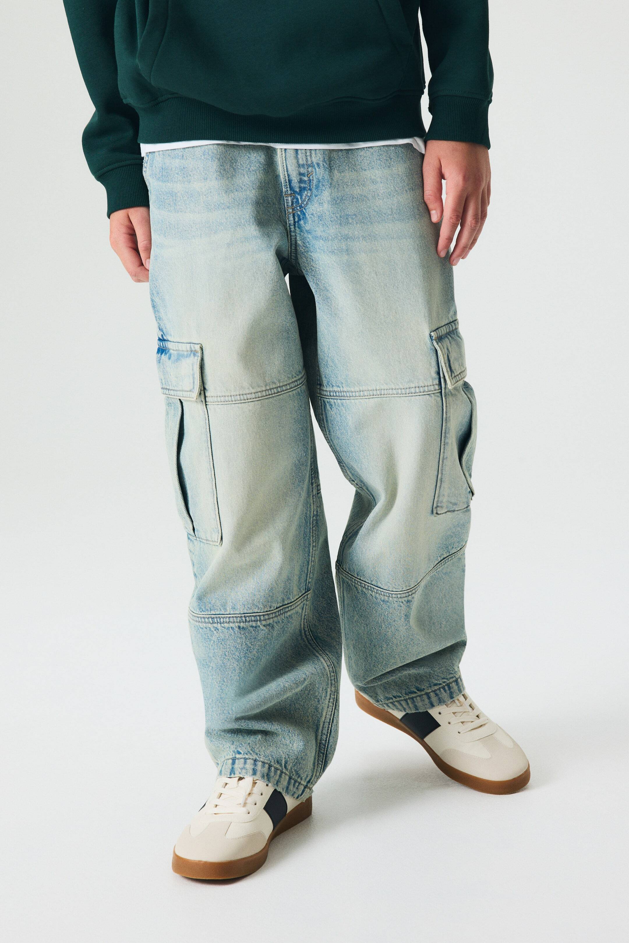 Джинсы-карго с заниженным шаговым швом из мягкого хлопкового денима, свободный крой в бедрах. Регулируемый эластичный пояс и застежка на молнию и пуговицу. Диагональные боковые карманы, открытые задние карманы и карманы на штанинах с клапанами на потайных кнопках.