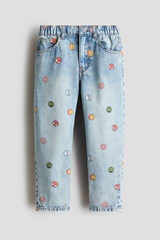 Джинсовые брюки из мягкого хлопка с принтом, закрывающие всю переднюю часть, с 5 карманами. Стандартный крой, зауженные штанины в области бедер и верхней части ног. Регулируемый эластичный пояс с застежкой на пуговицу и молнию.