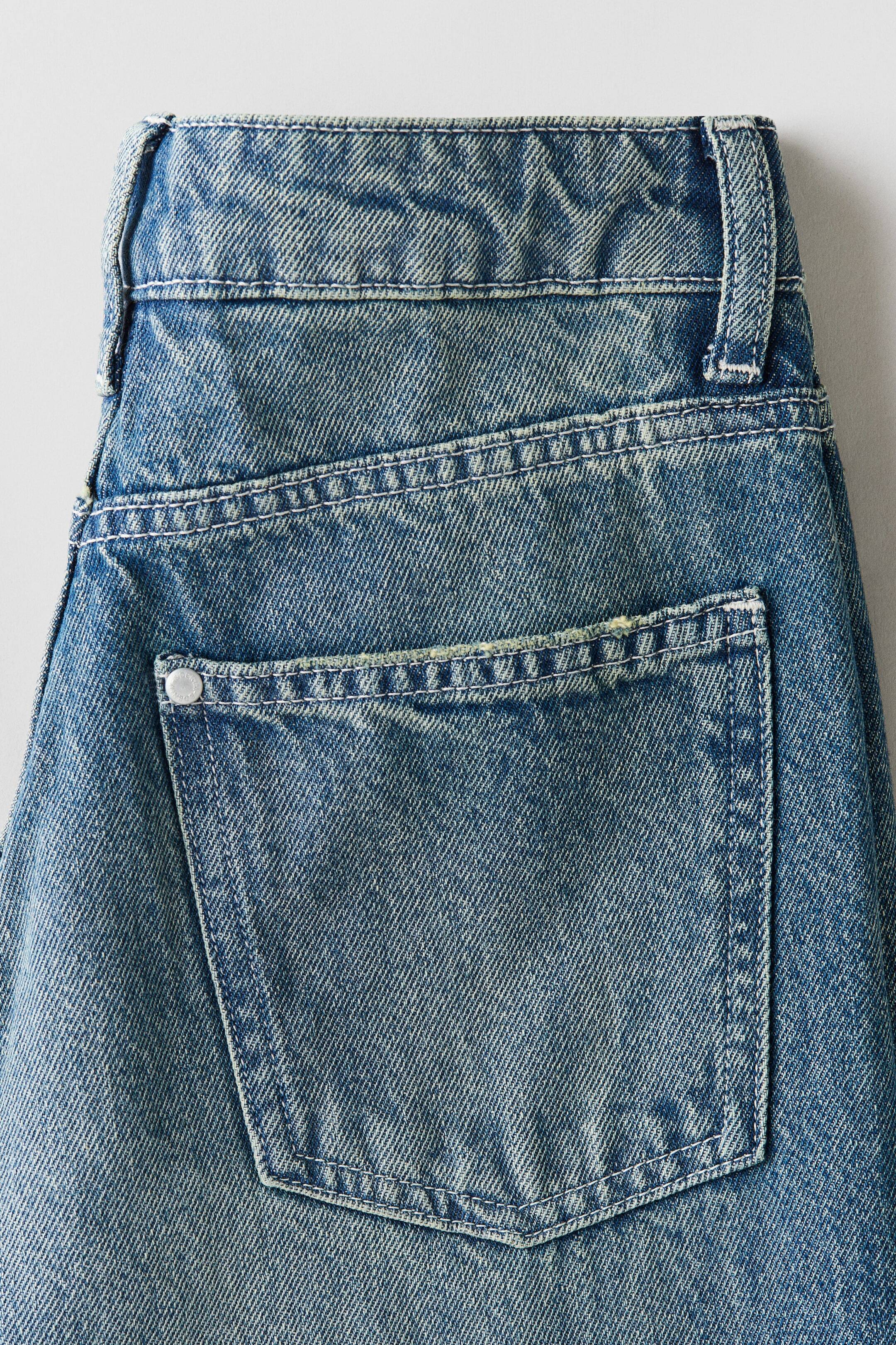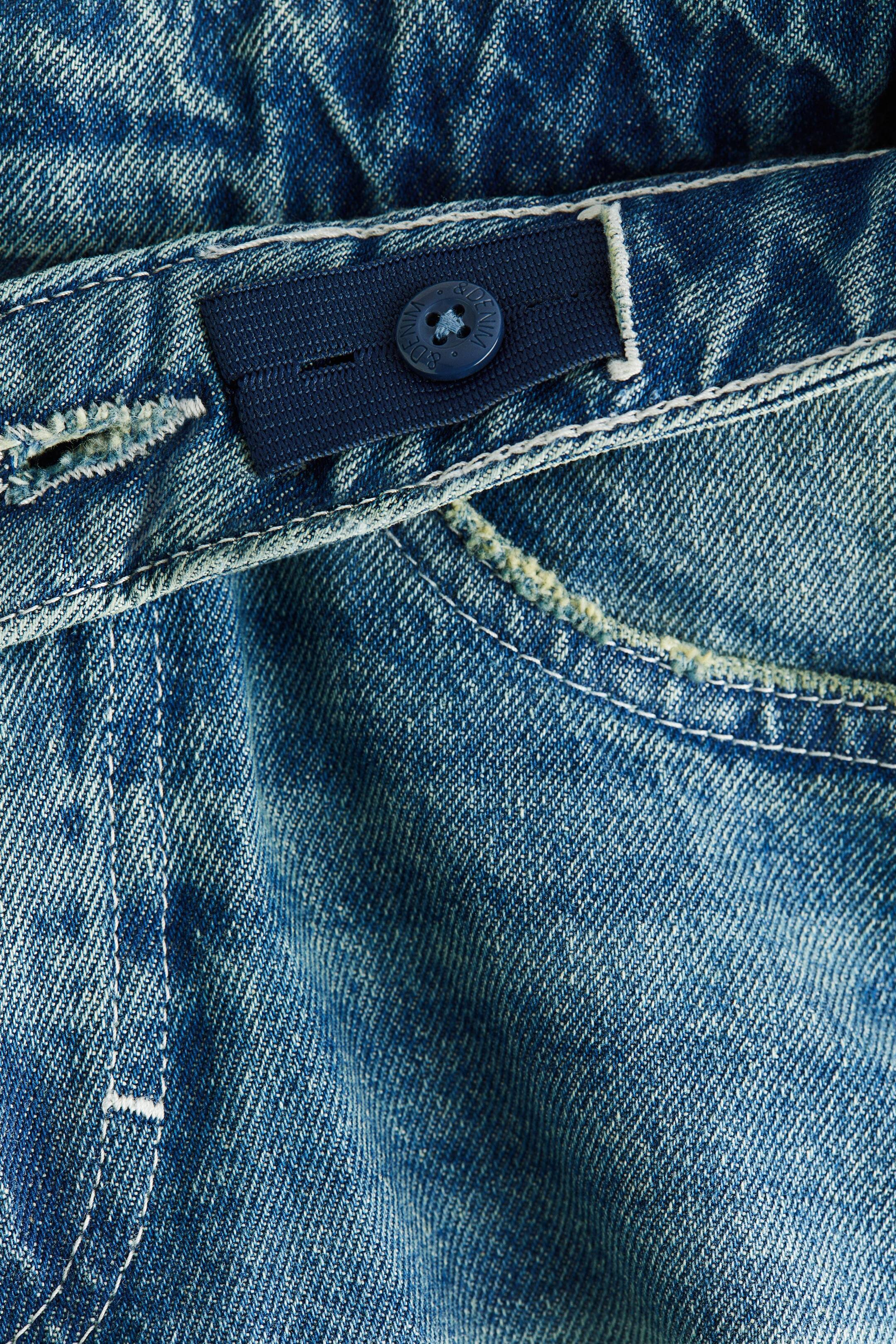Свободные брюки с пятью карманами из стираного хлопкового денима. Талия регулируется резинкой, застегивается на молнию и пуговицу, брючины прямые.