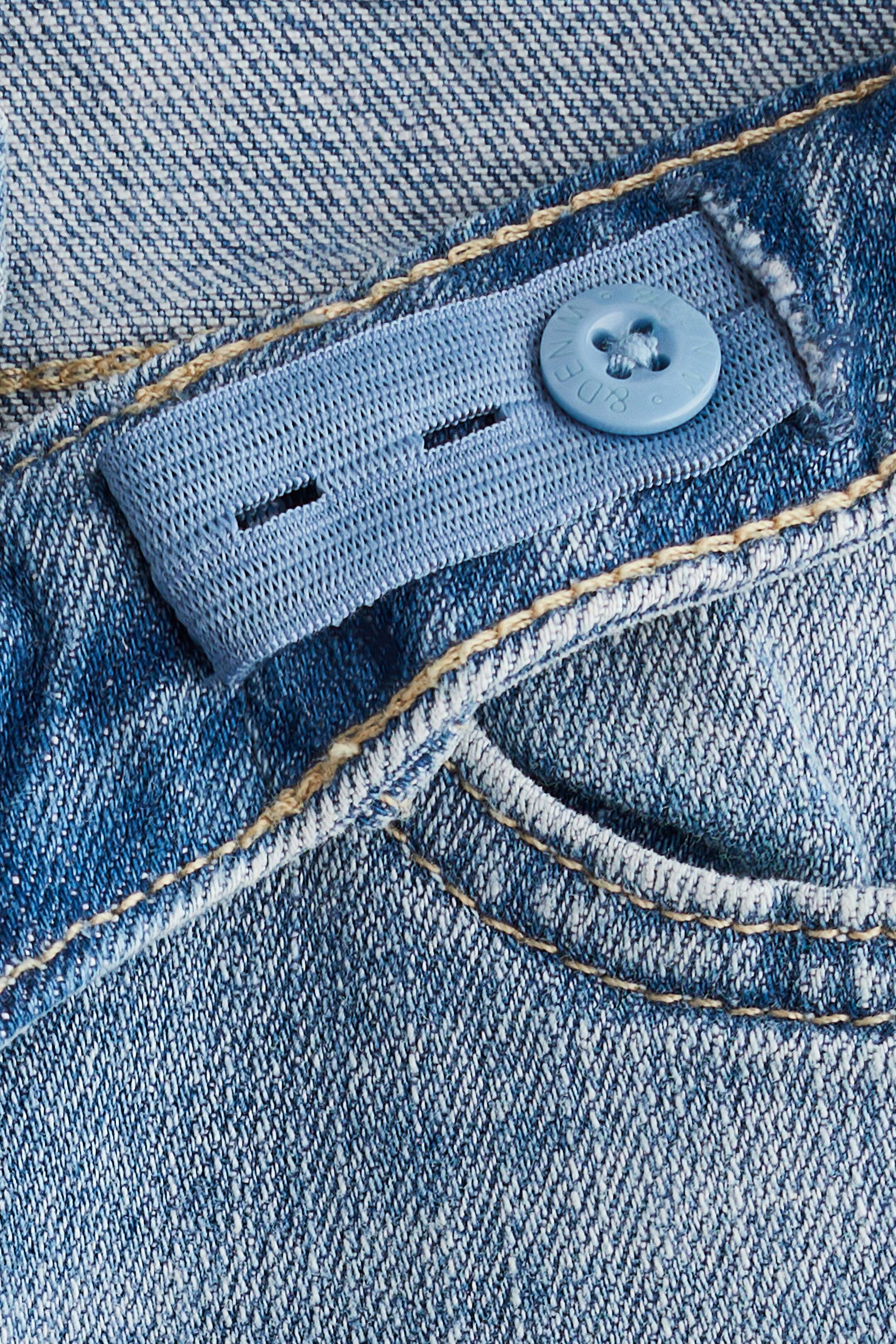 Джинсы широкого кроя с пятью карманами из эластичного денима. Регулируемый пояс на резинке и застежка на молнию и пуговицу.