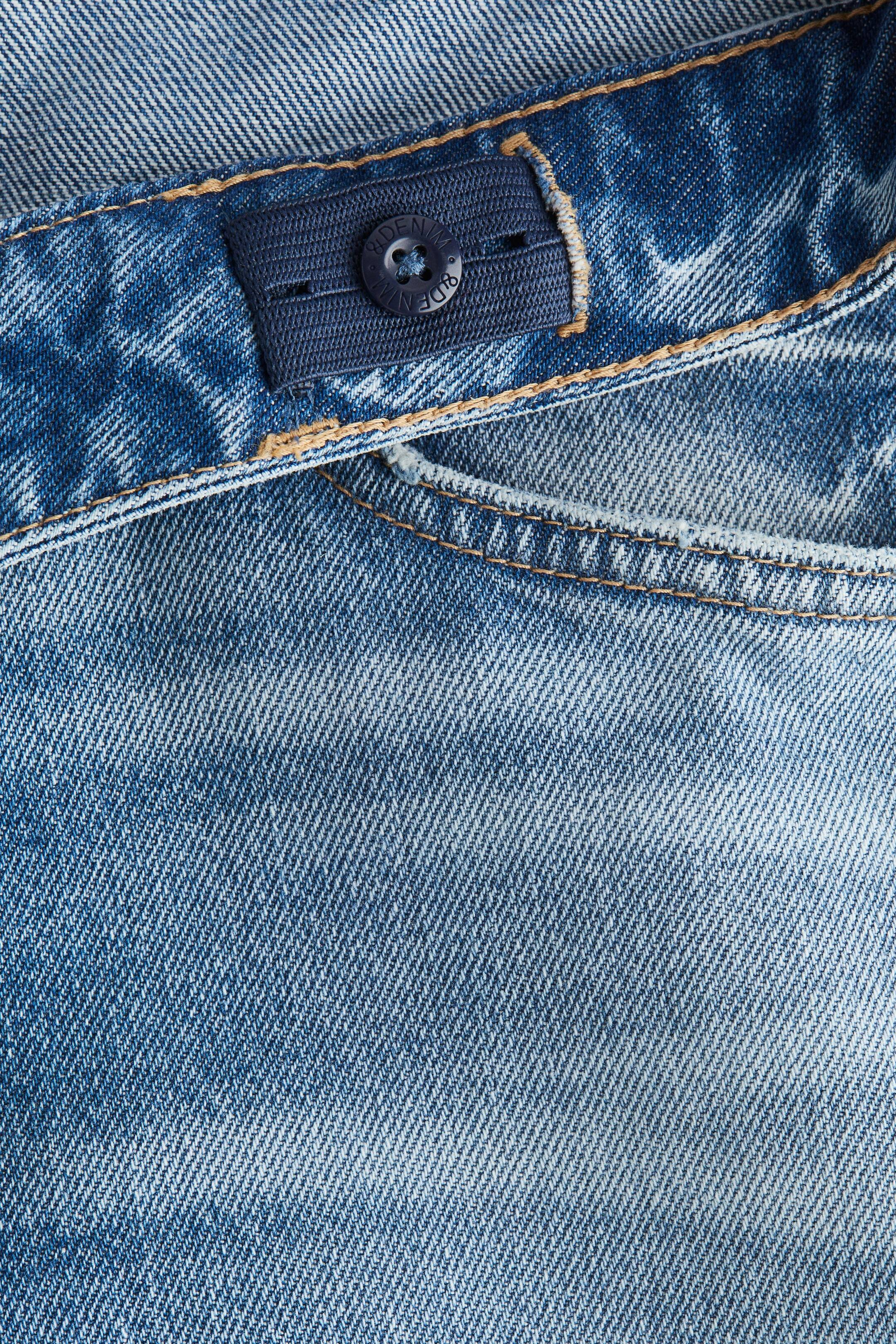 Брюки с пятью карманами из стираного хлопкового денима. Свободный крой в бедрах и ягодицах, широкие штанины. Талия регулируется резинкой, застегивается на молнию и пуговицы.