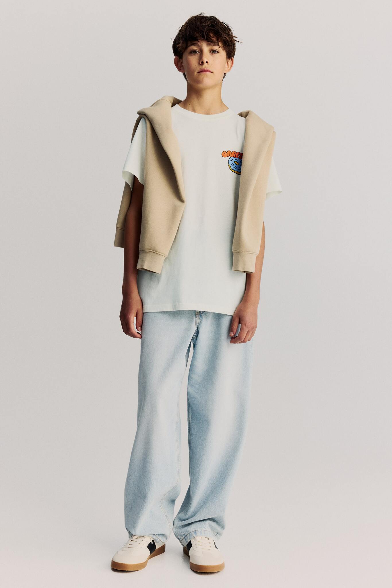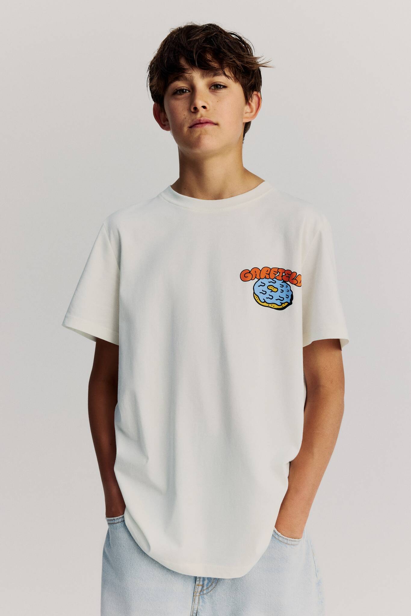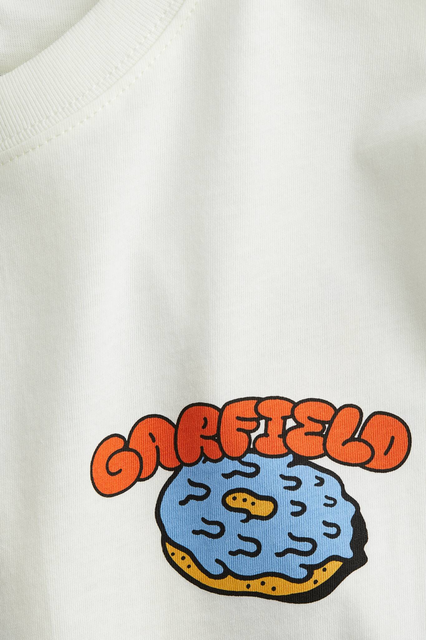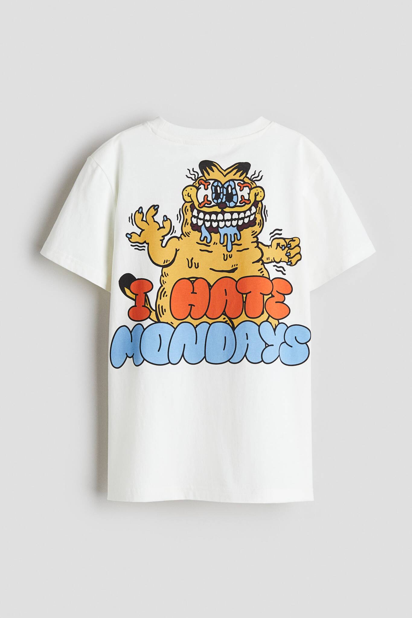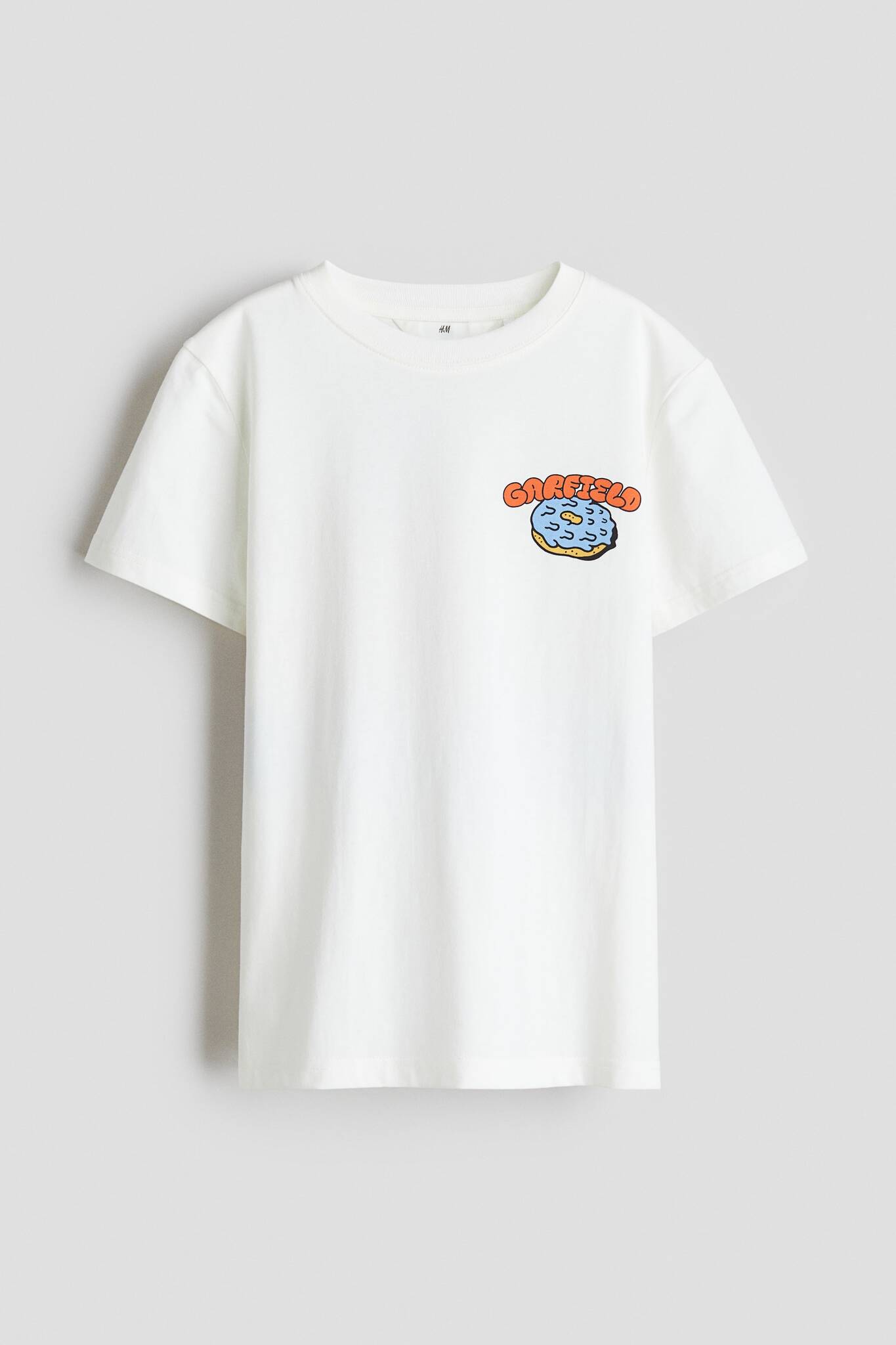 Футболка из мягкого хлопкового трикотажа с принтом, круглым вырезом и спущенными плечами.