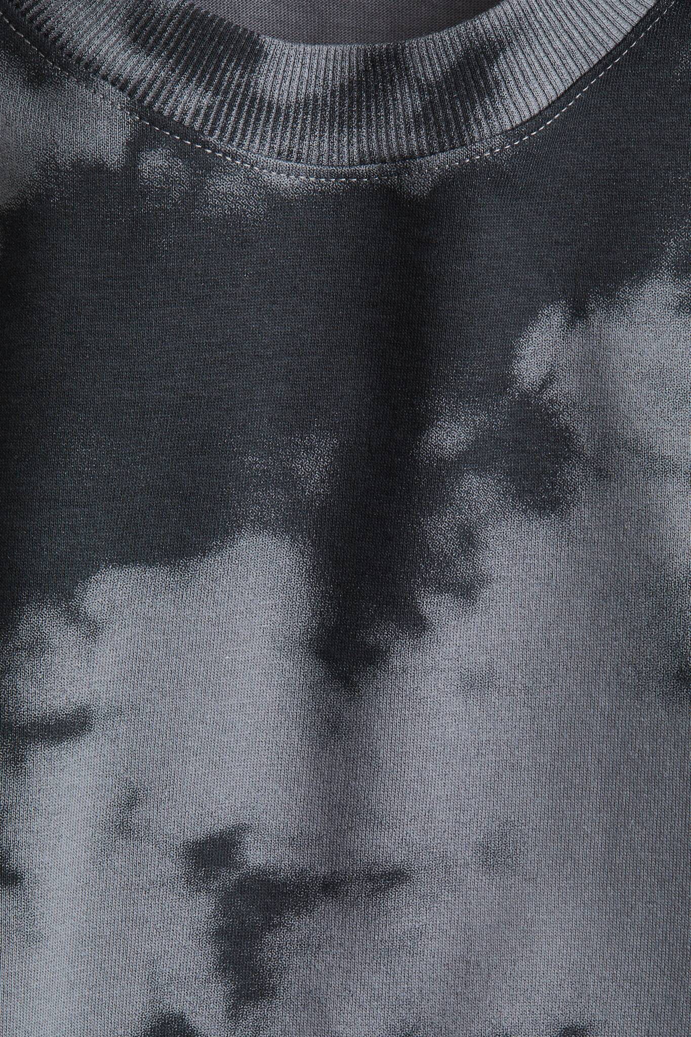 Футболка свободного кроя из мягкого хлопкового трикотажа с принтом, круглым вырезом с ребристой отделкой и спущенными плечами.