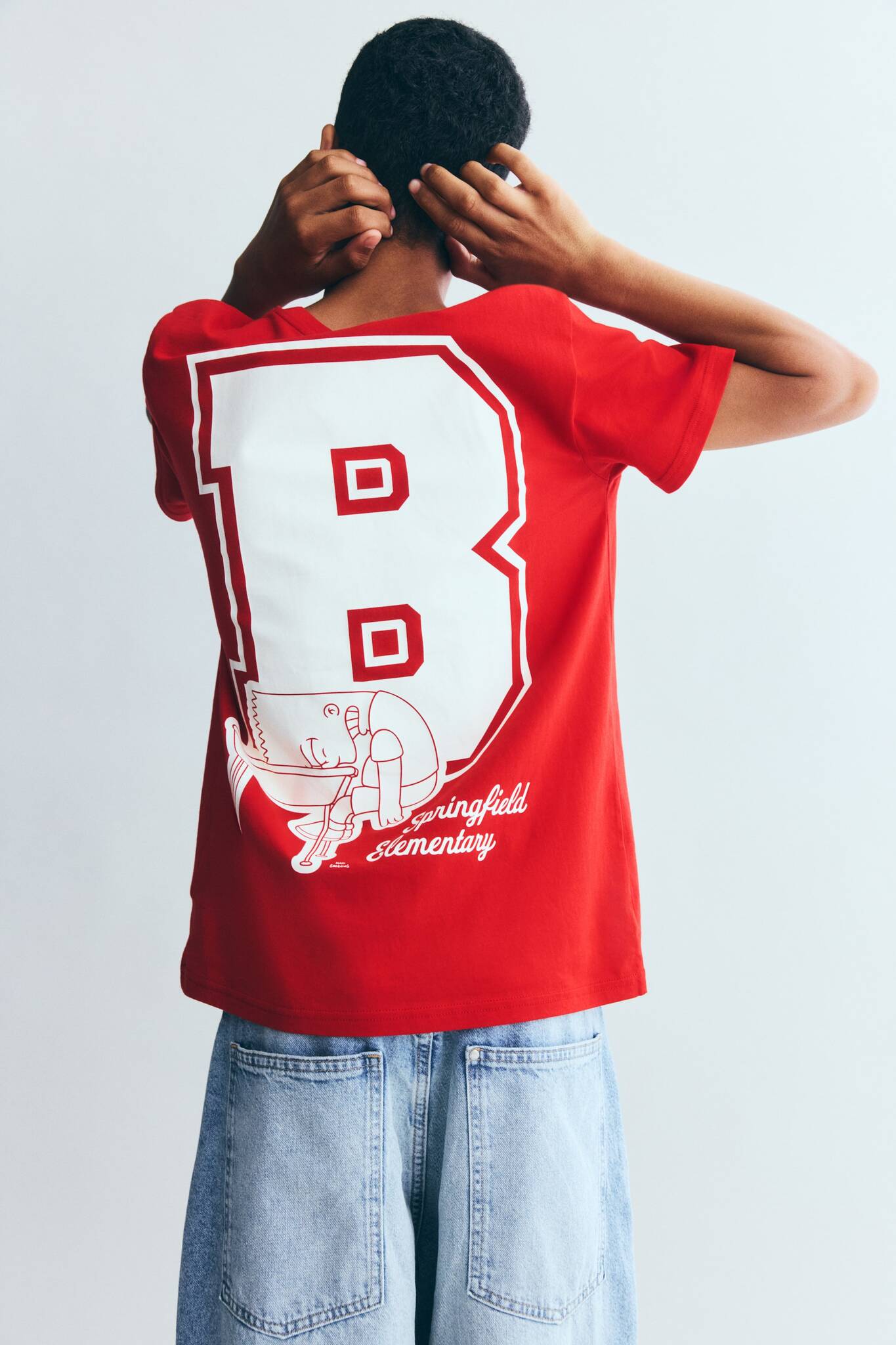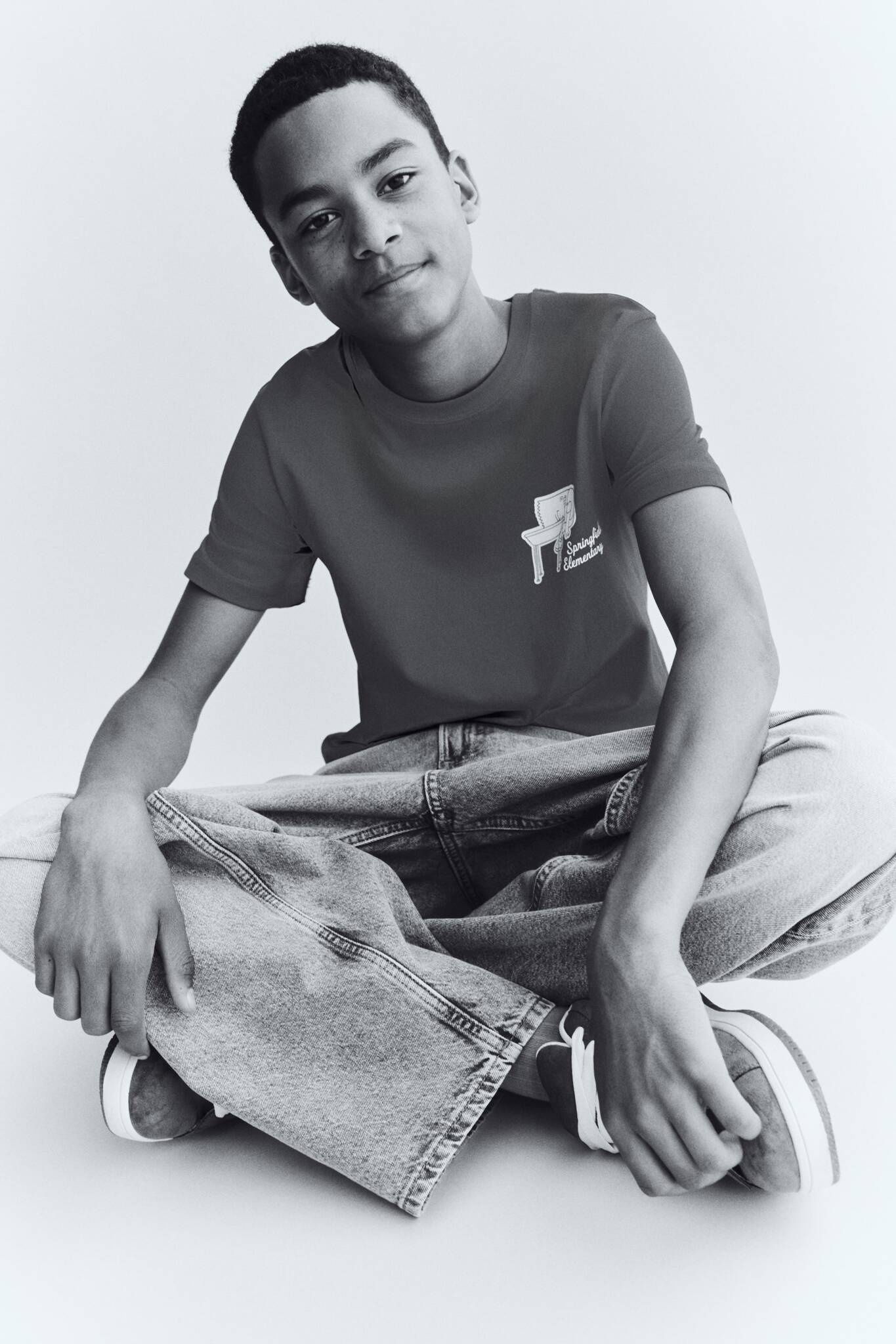 Футболка из мягкого хлопкового трикотажа с принтом, круглым вырезом и спущенными плечами.