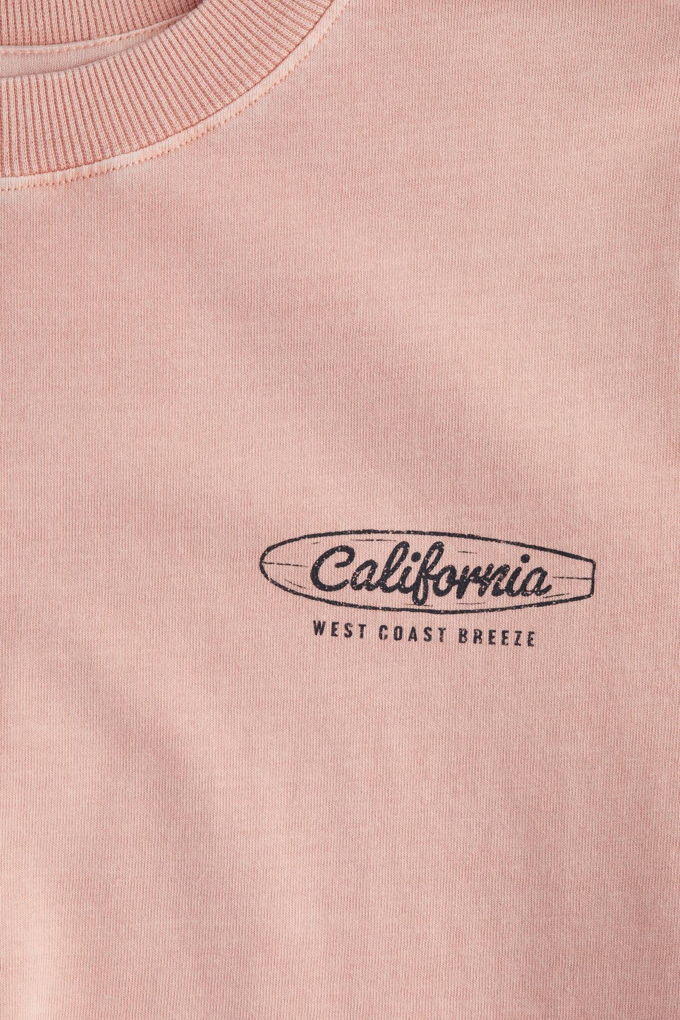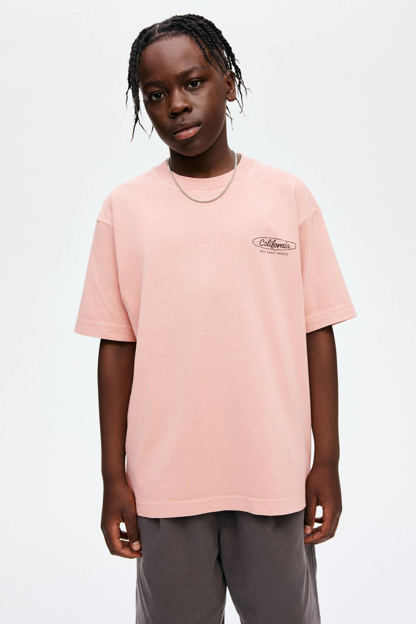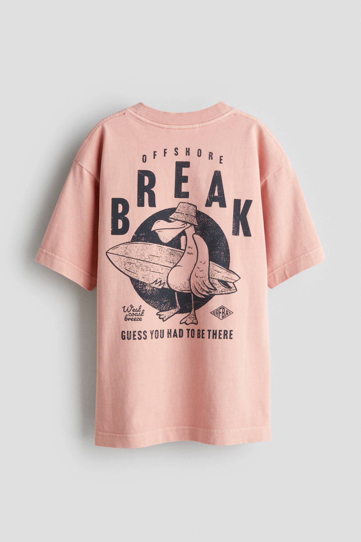 Футболка свободного кроя из мягкого хлопкового трикотажа с принтом, круглым вырезом с ребристой отделкой и спущенными плечами.