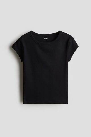 Топ с круглым вырезом и короткими рукавами из ребристого хлопкового трикотажа.