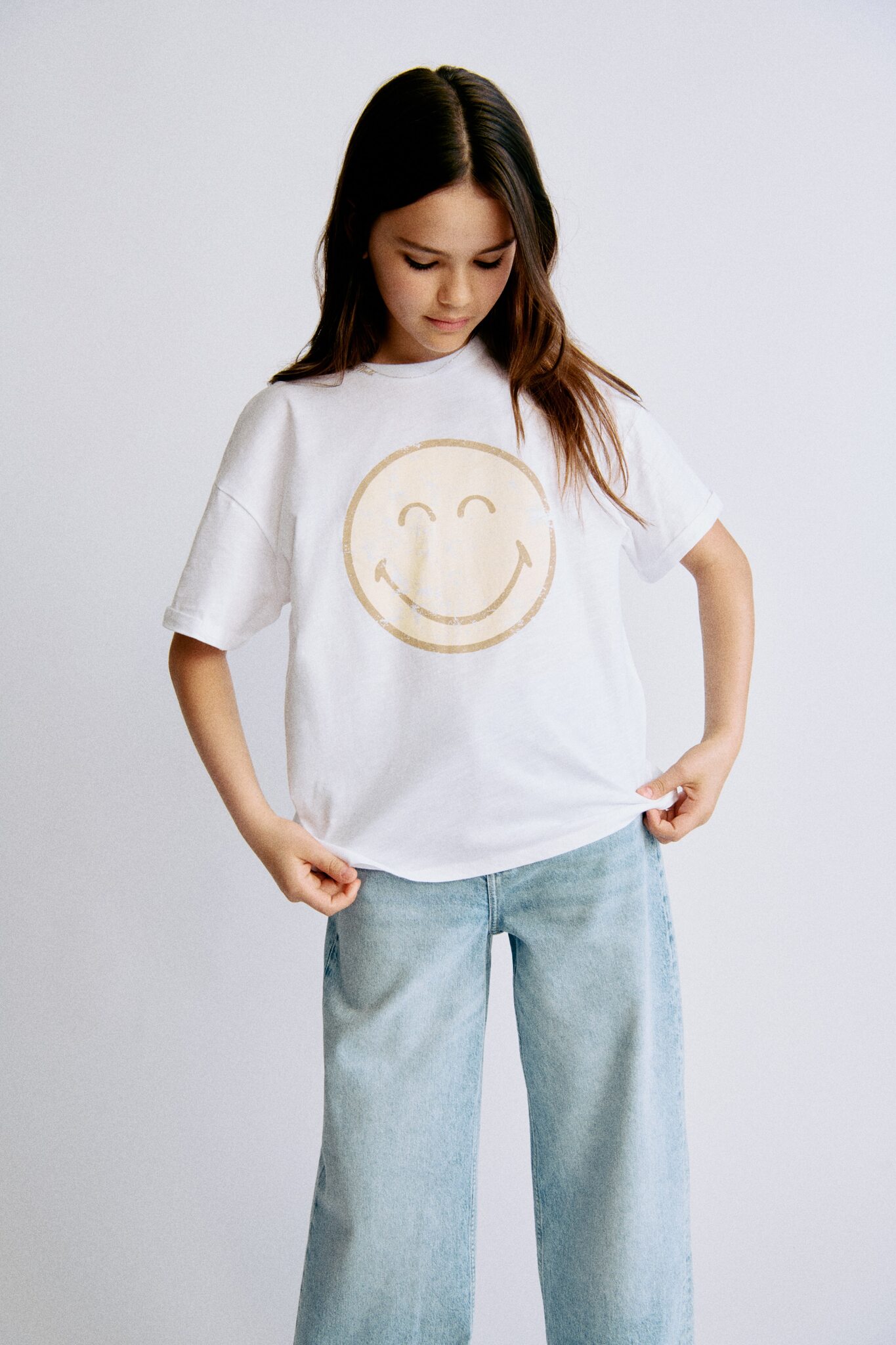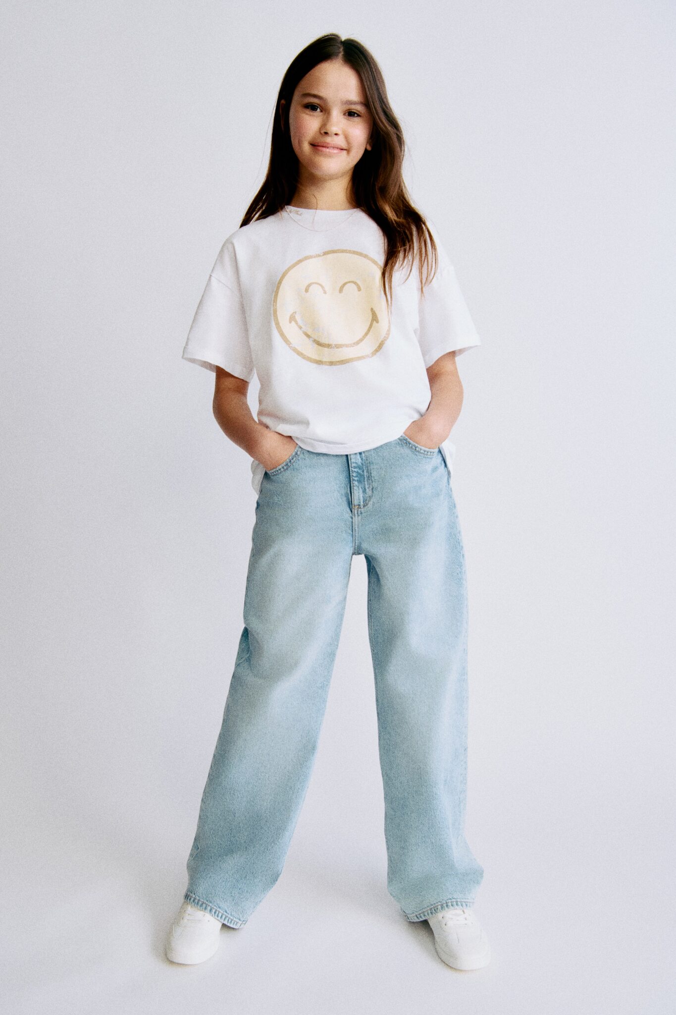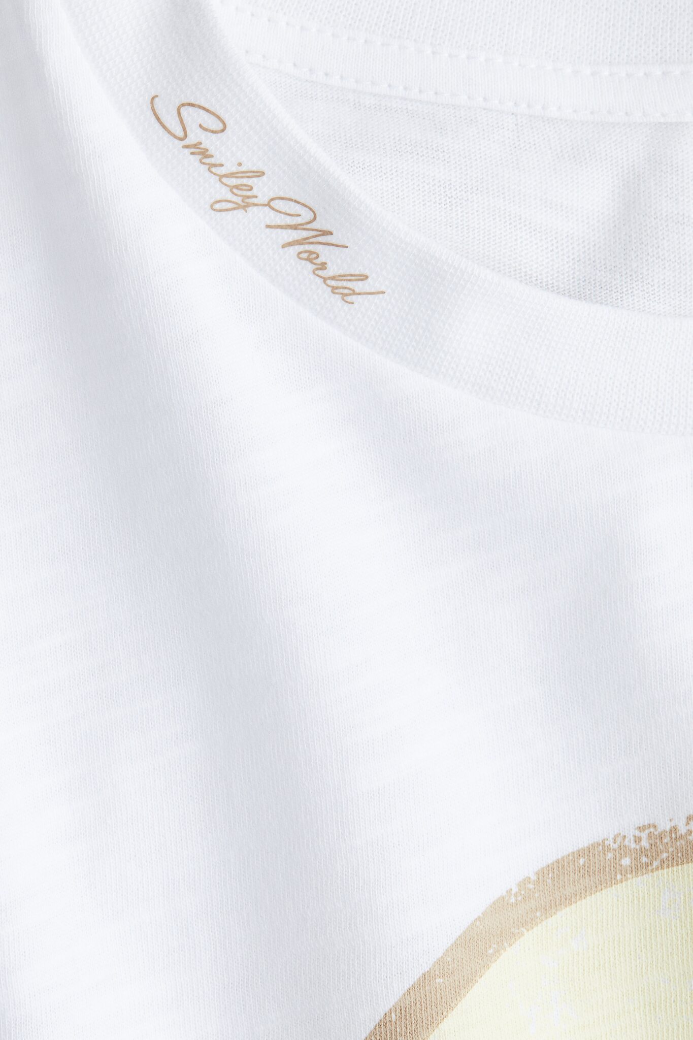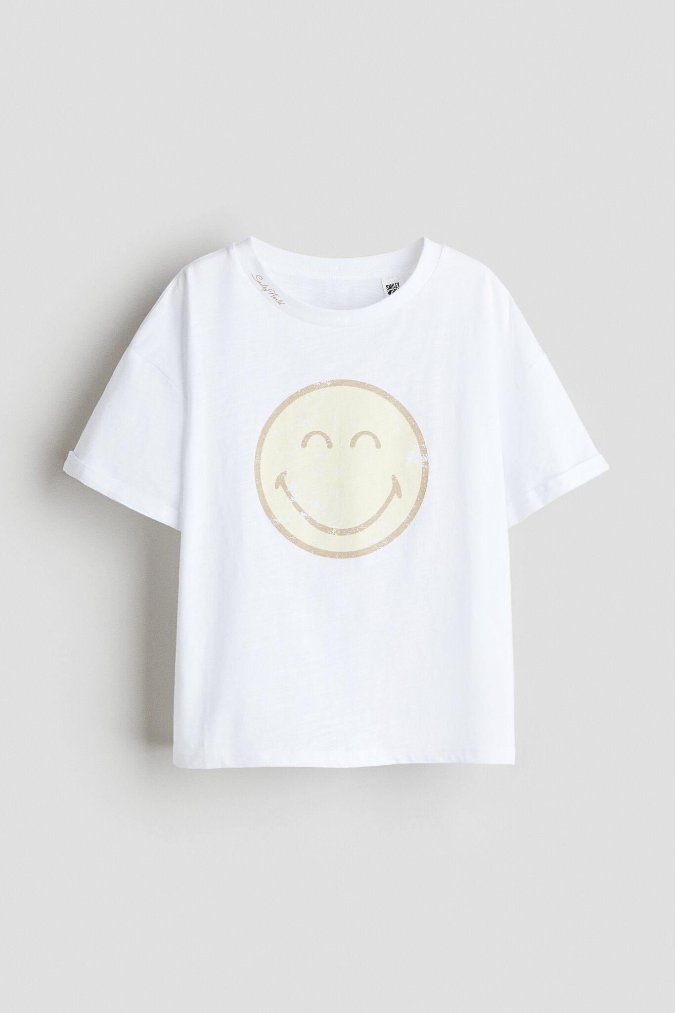 Футболка свободного кроя из мягкого хлопкового трикотажа с принтом, круглым вырезом, ребристой отделкой и спущенными плечами.