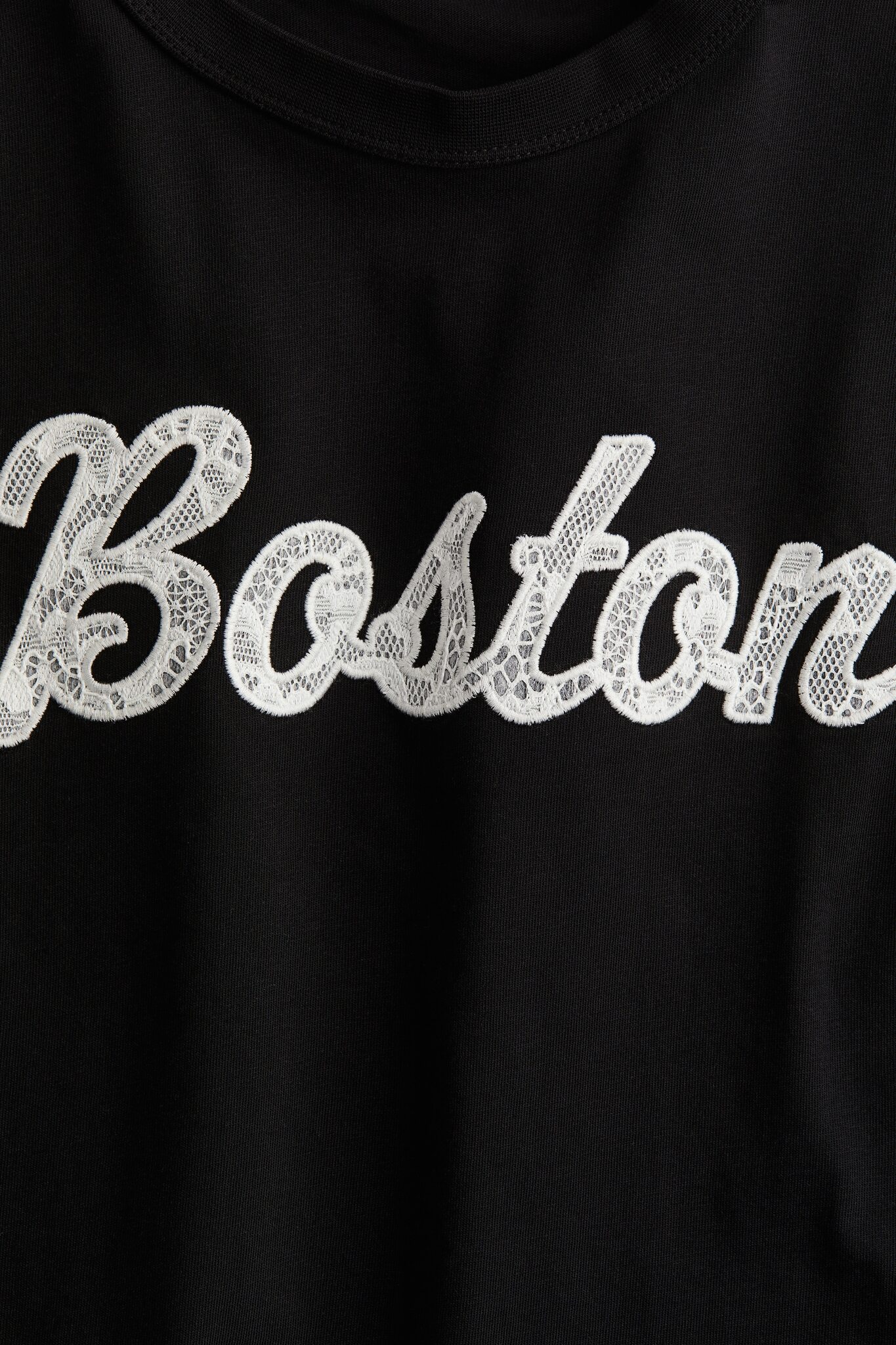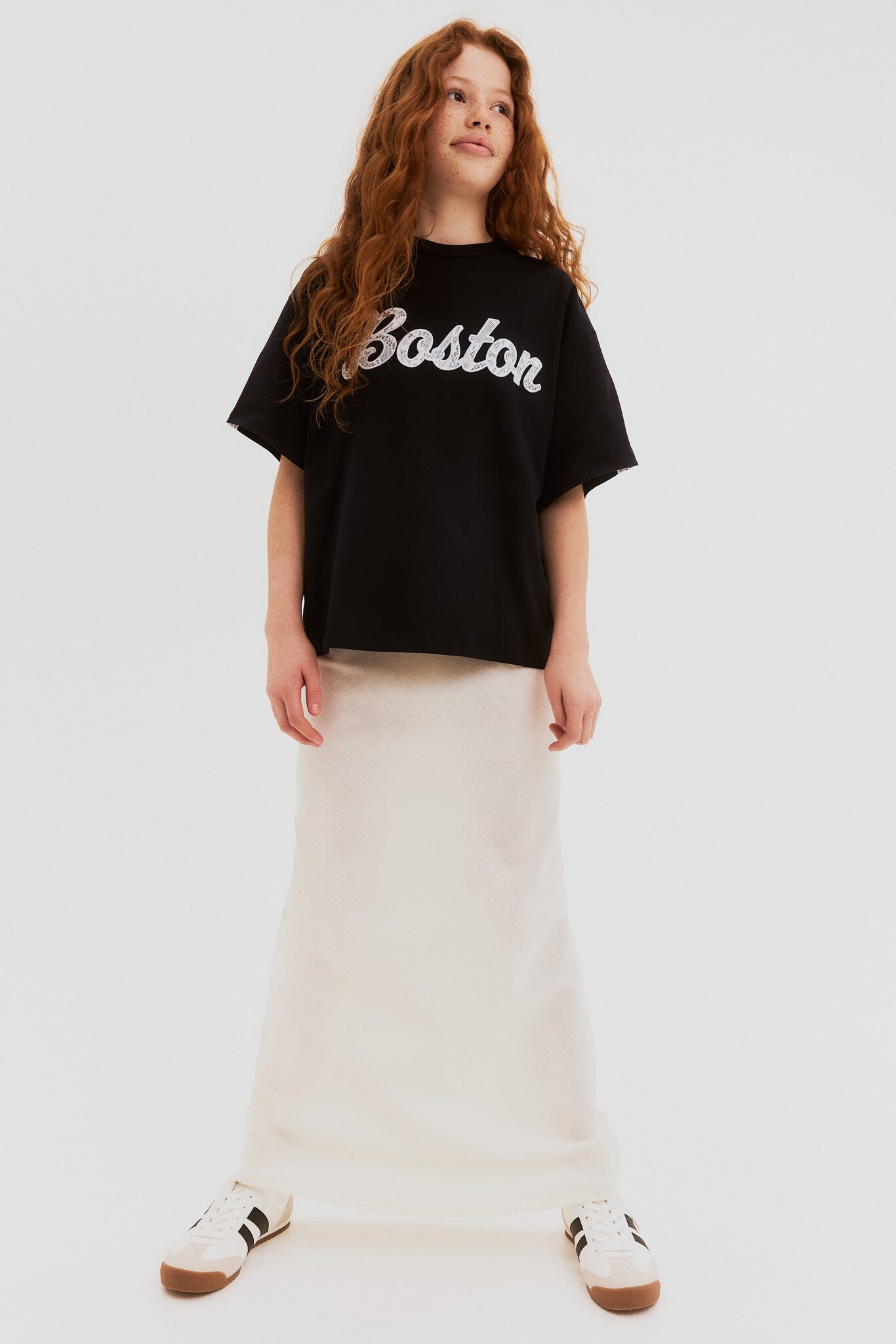 Футболка свободного кроя из мягкого трикотажа с круглым вырезом, ребристой отделкой, спущенными плечами и текстовым мотивом спереди.