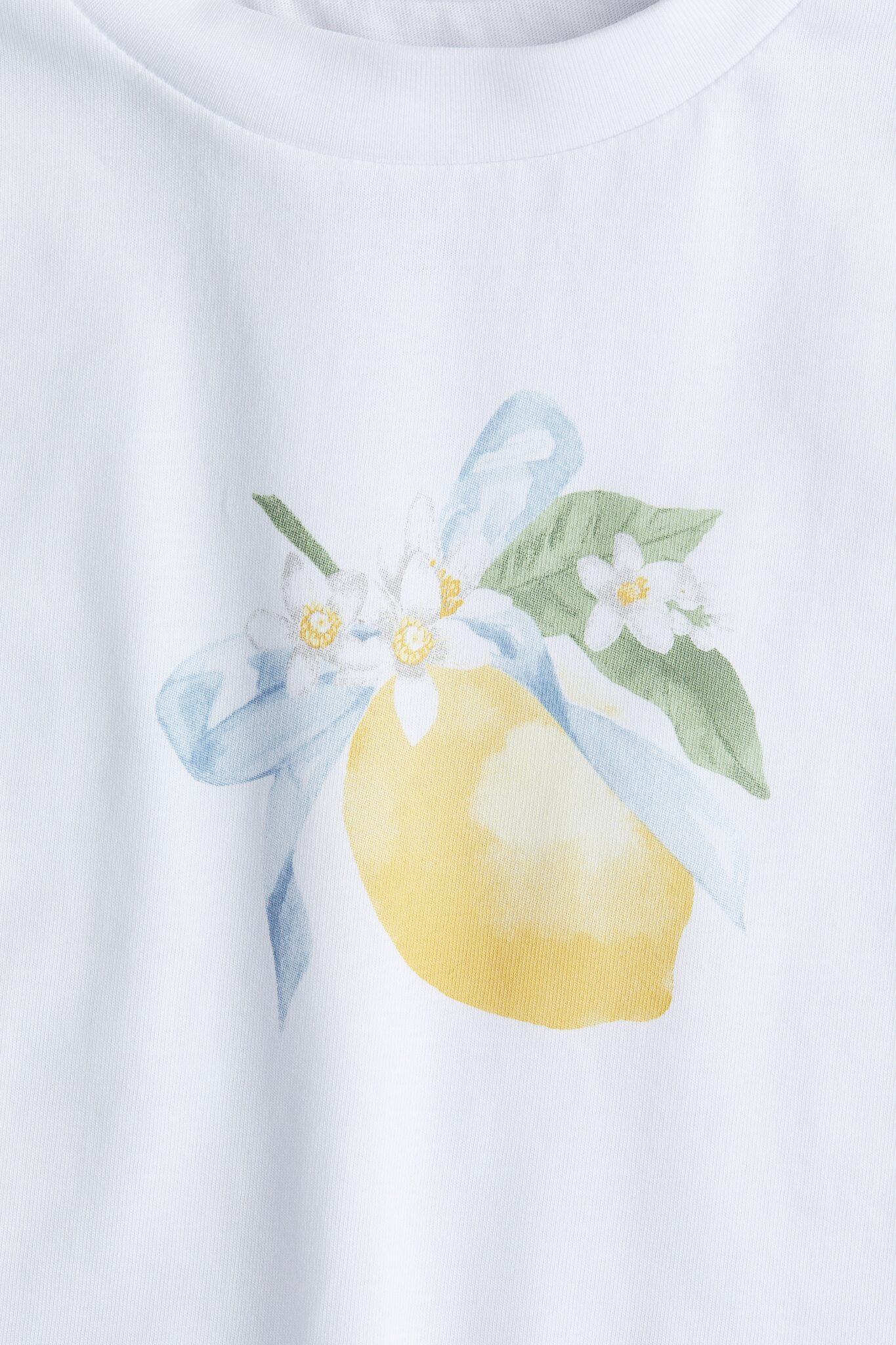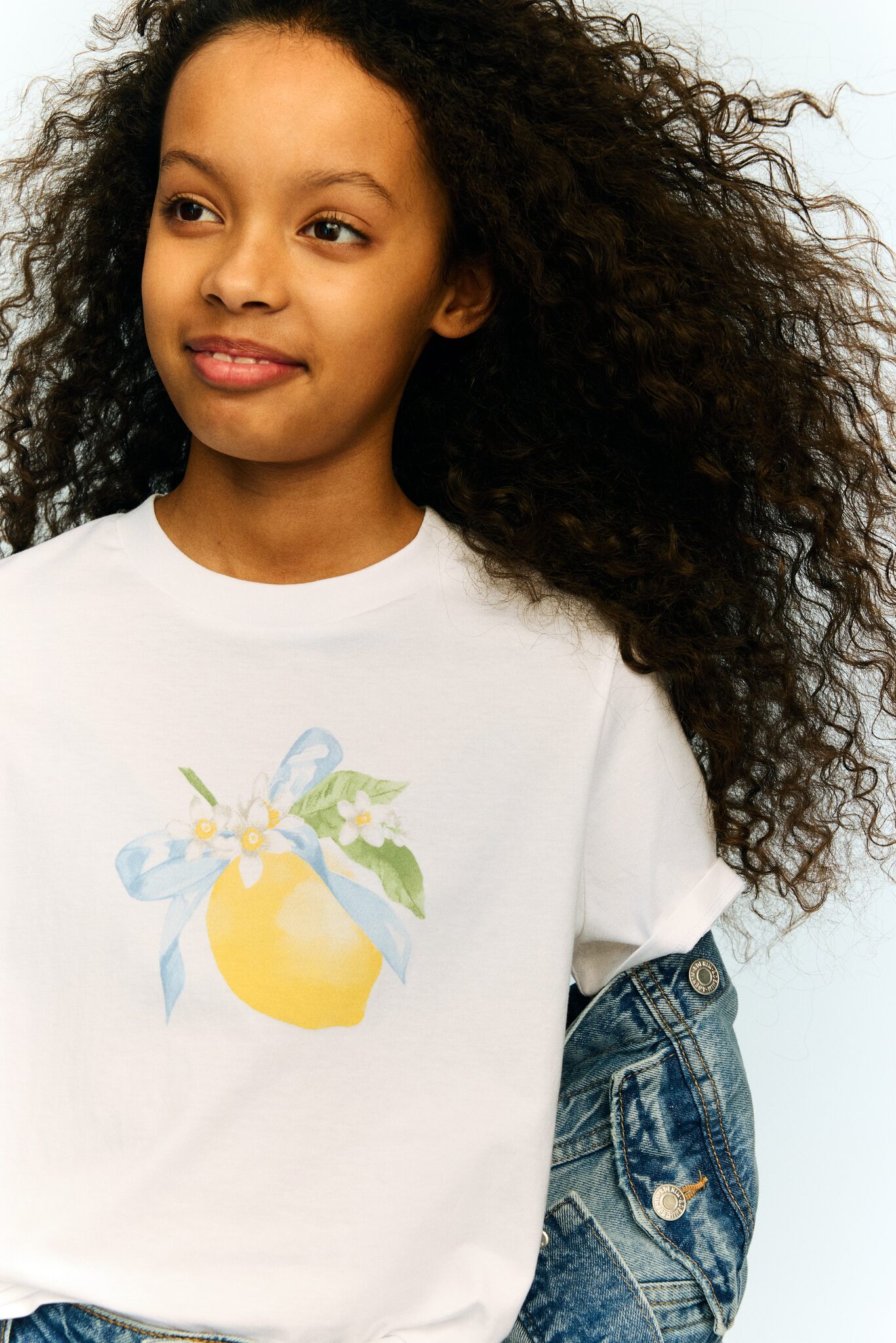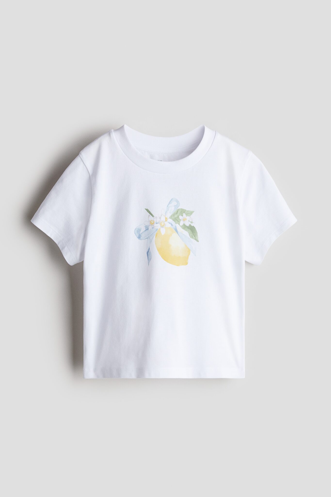 Футболка из мягкого хлопкового трикотажа с принтом. Круглый вырез с ребристым краем и короткие рукава.