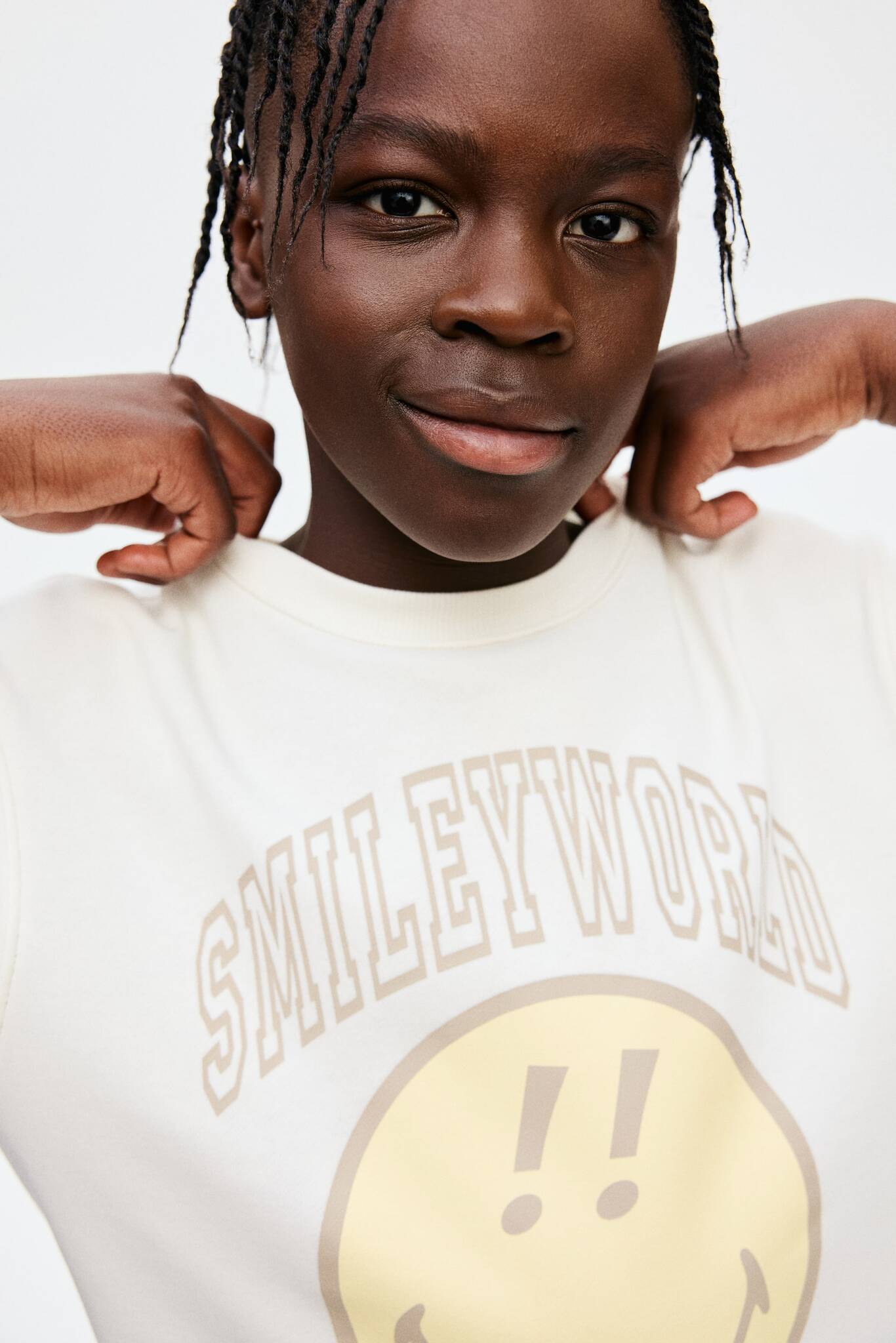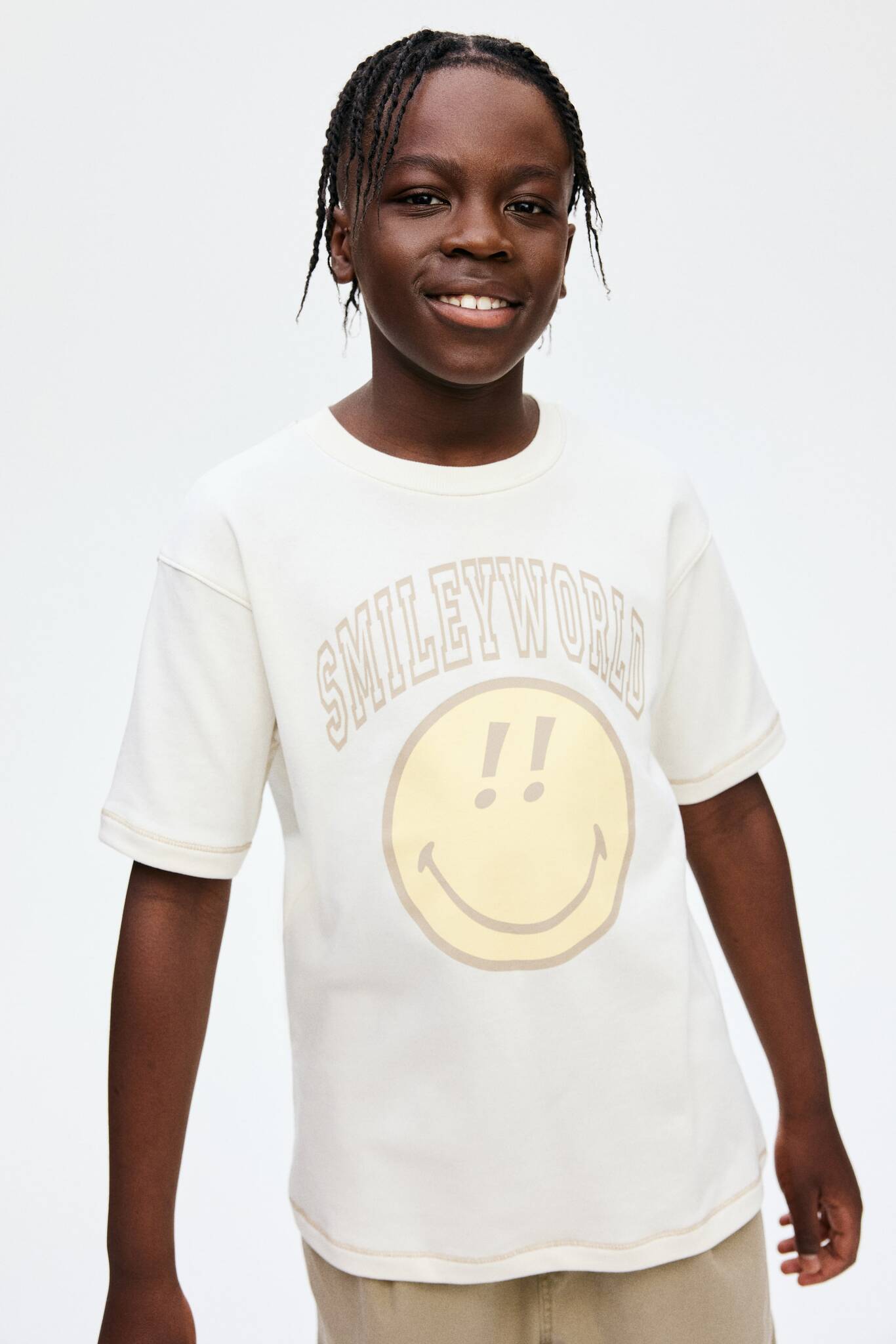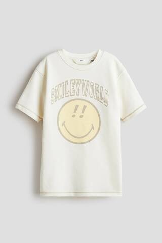 Футболка свободного кроя из лёгкого принтованного трикотажного полотна. Круглый вырез горловины с ребристыми краями и спущенная линия плеча.