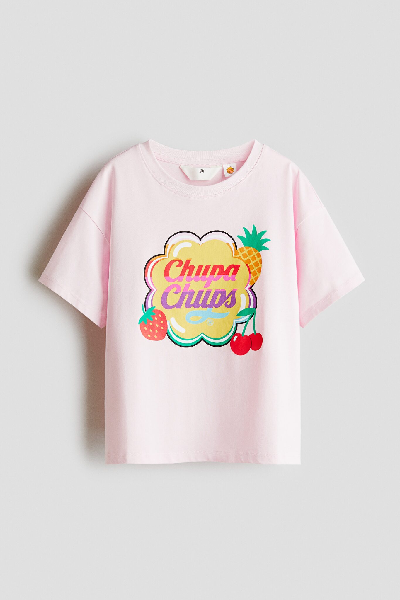 Футболка свободного кроя из мягкого хлопкового трикотажа с принтом, круглым вырезом, ребристой отделкой и спущенными плечами.