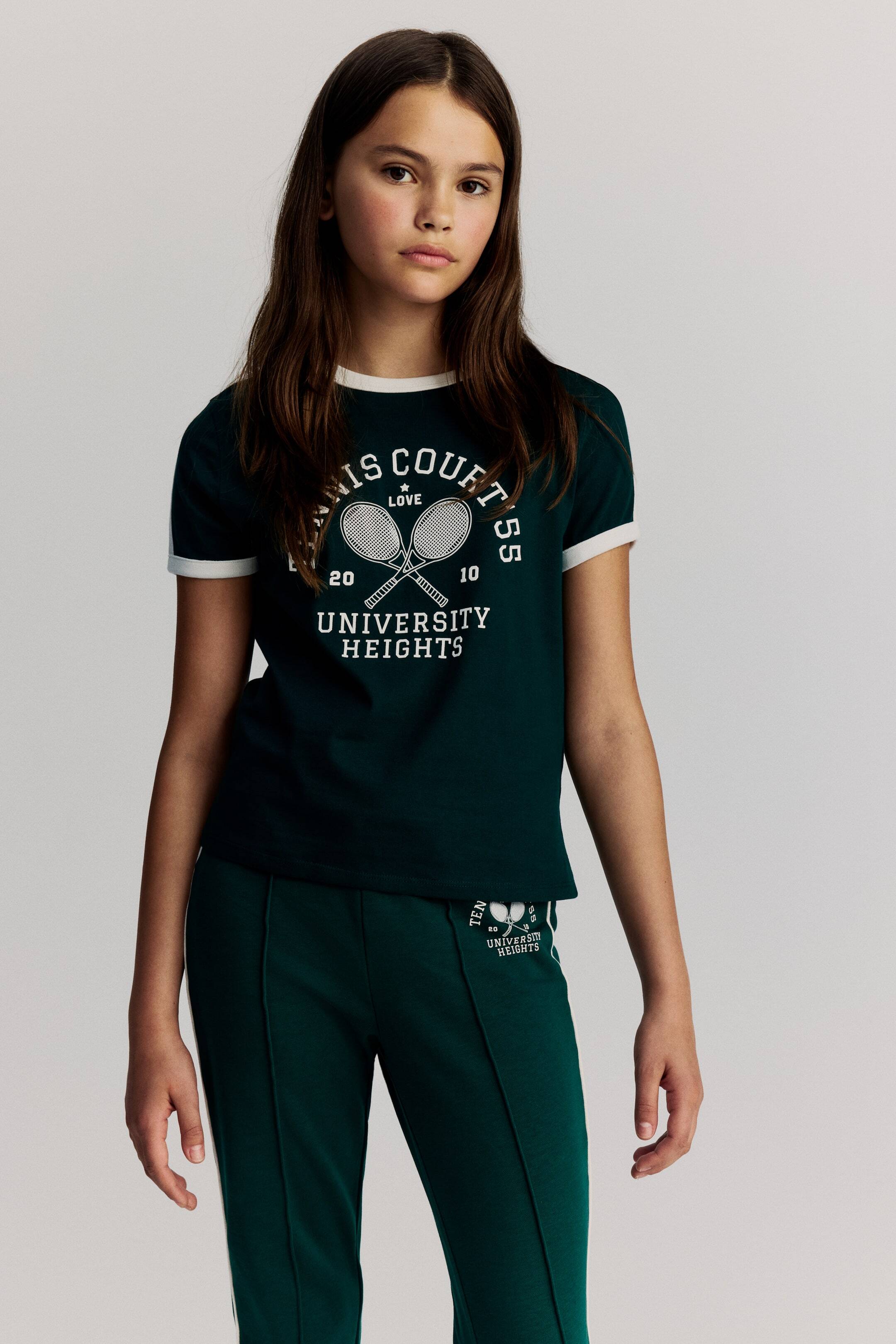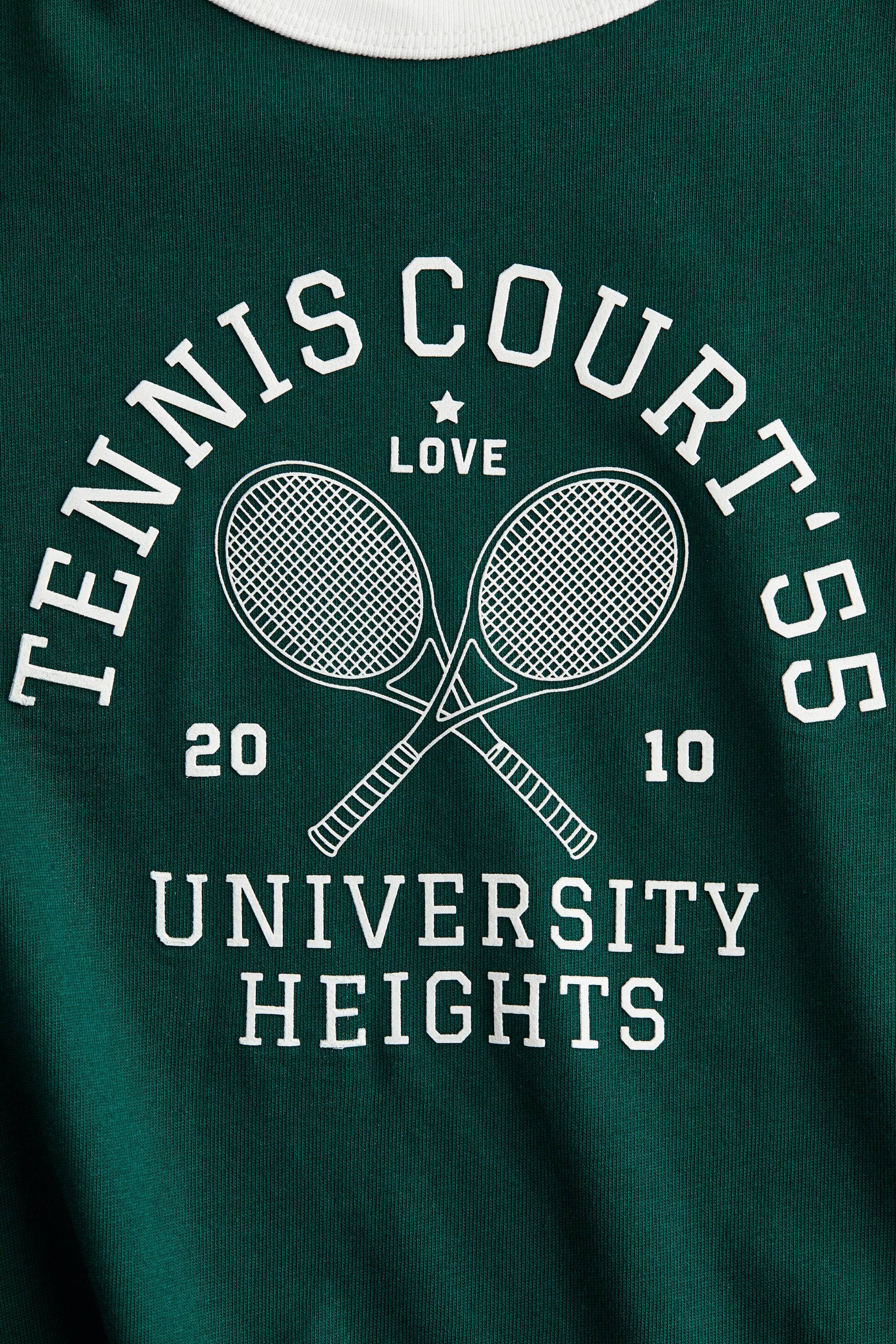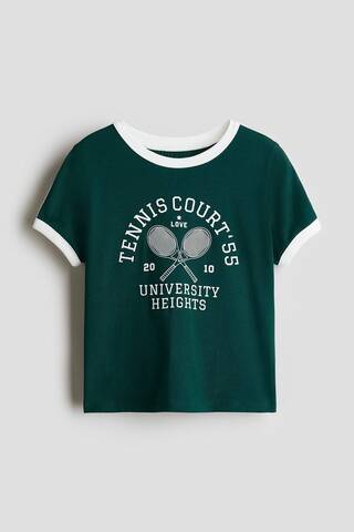 Футболка из мягкого хлопкового трикотажа с принтом. Круглый вырез с ребристым краем и короткие рукава.