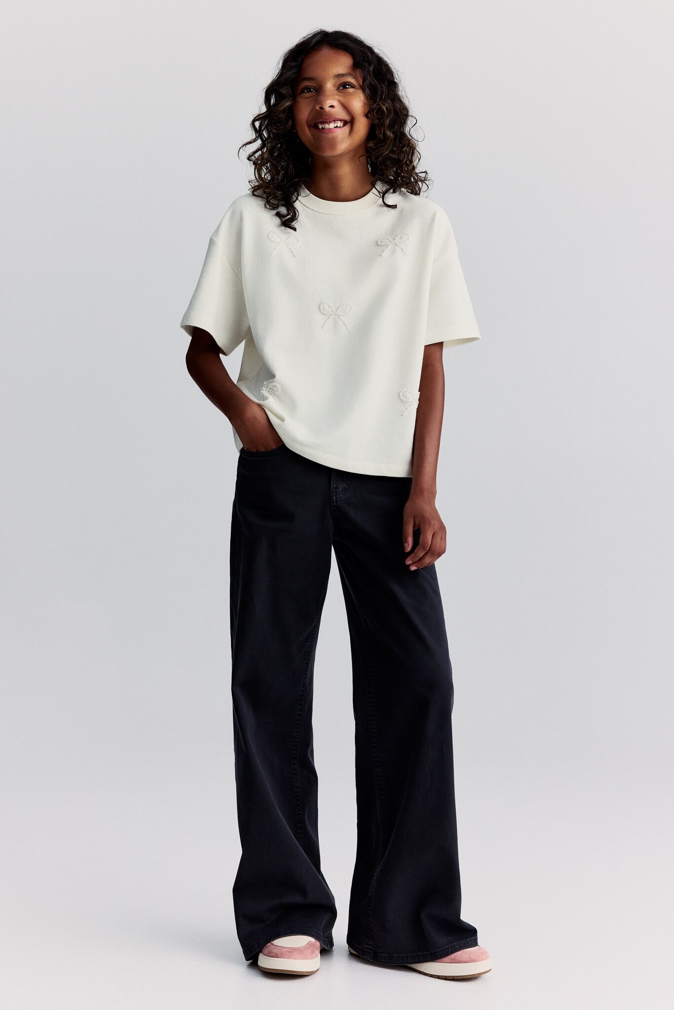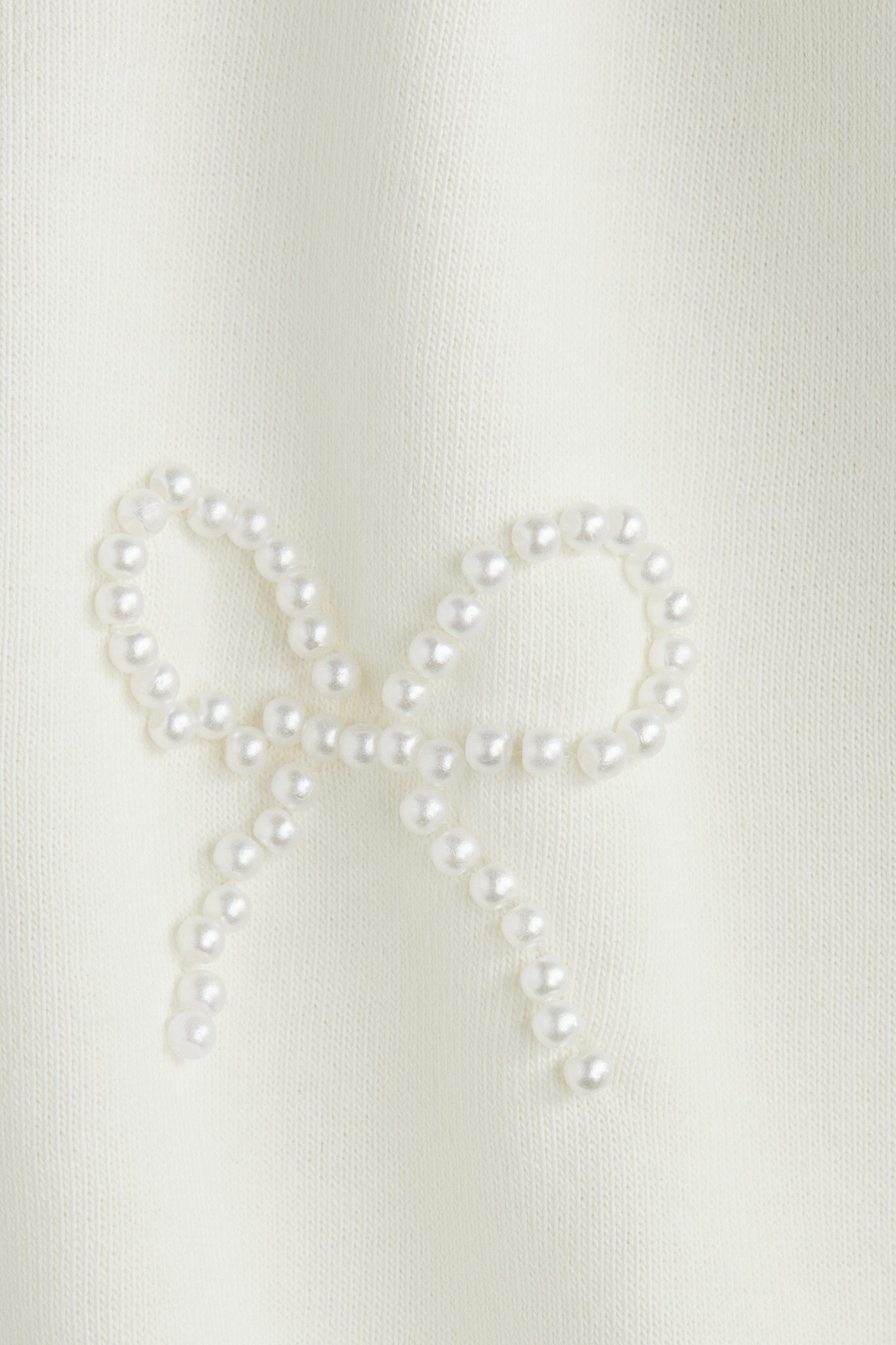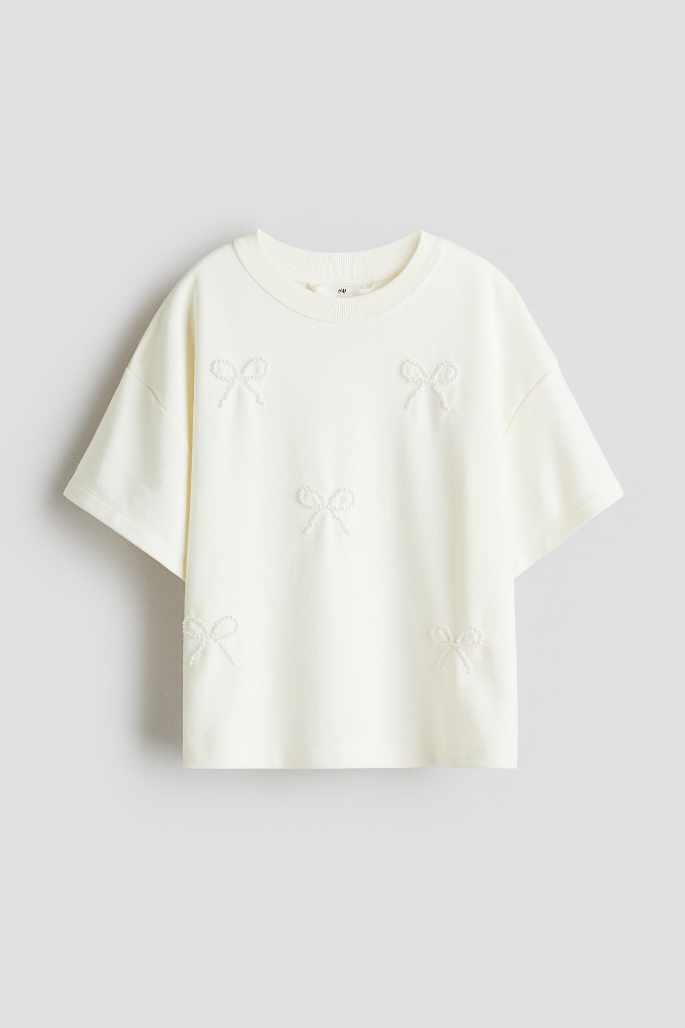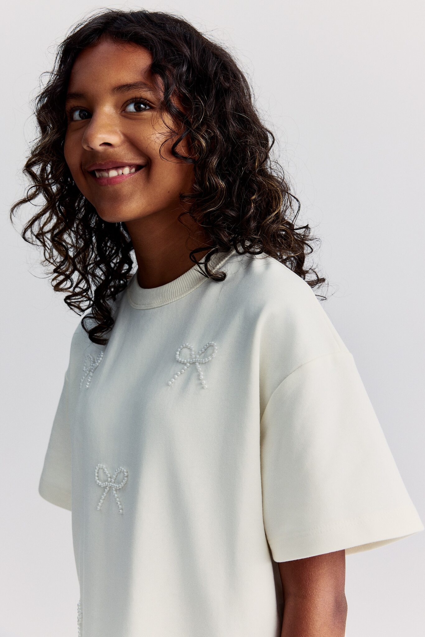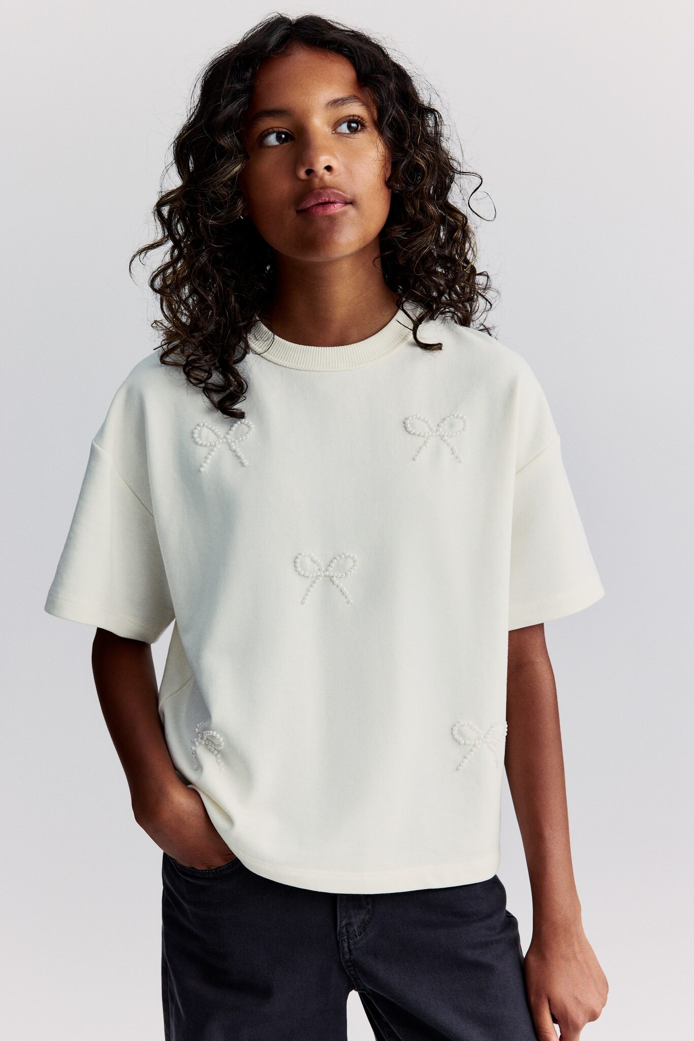 Футболка свободного кроя из мягкого трикотажа с аппликациями из бисера спереди. Круглый вырез горловины с ребристыми кромками и спущенной линией плеча.