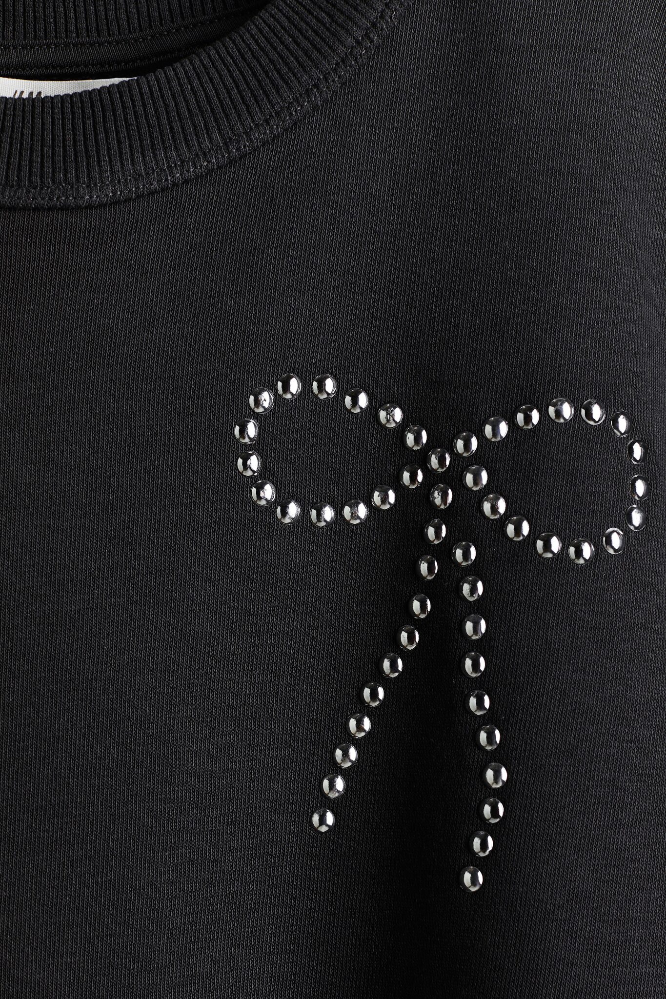 Футболка свободного кроя из мягкого трикотажа с аппликациями из бисера спереди. Круглый вырез горловины с ребристыми кромками и спущенной линией плеча.