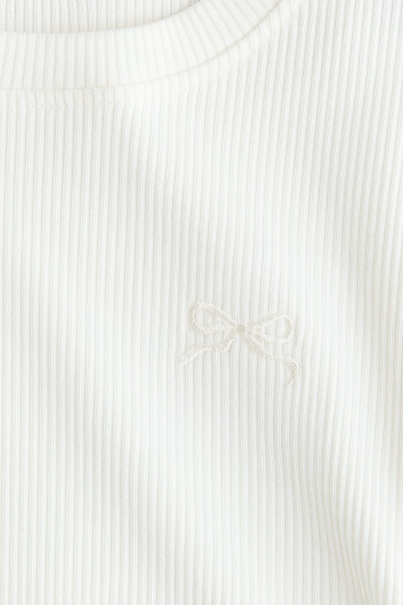 Футболка из хлопкового трикотажа в рубчик с круглым вырезом, небольшим вышитым мотивом спереди и рукавами-крылышками.