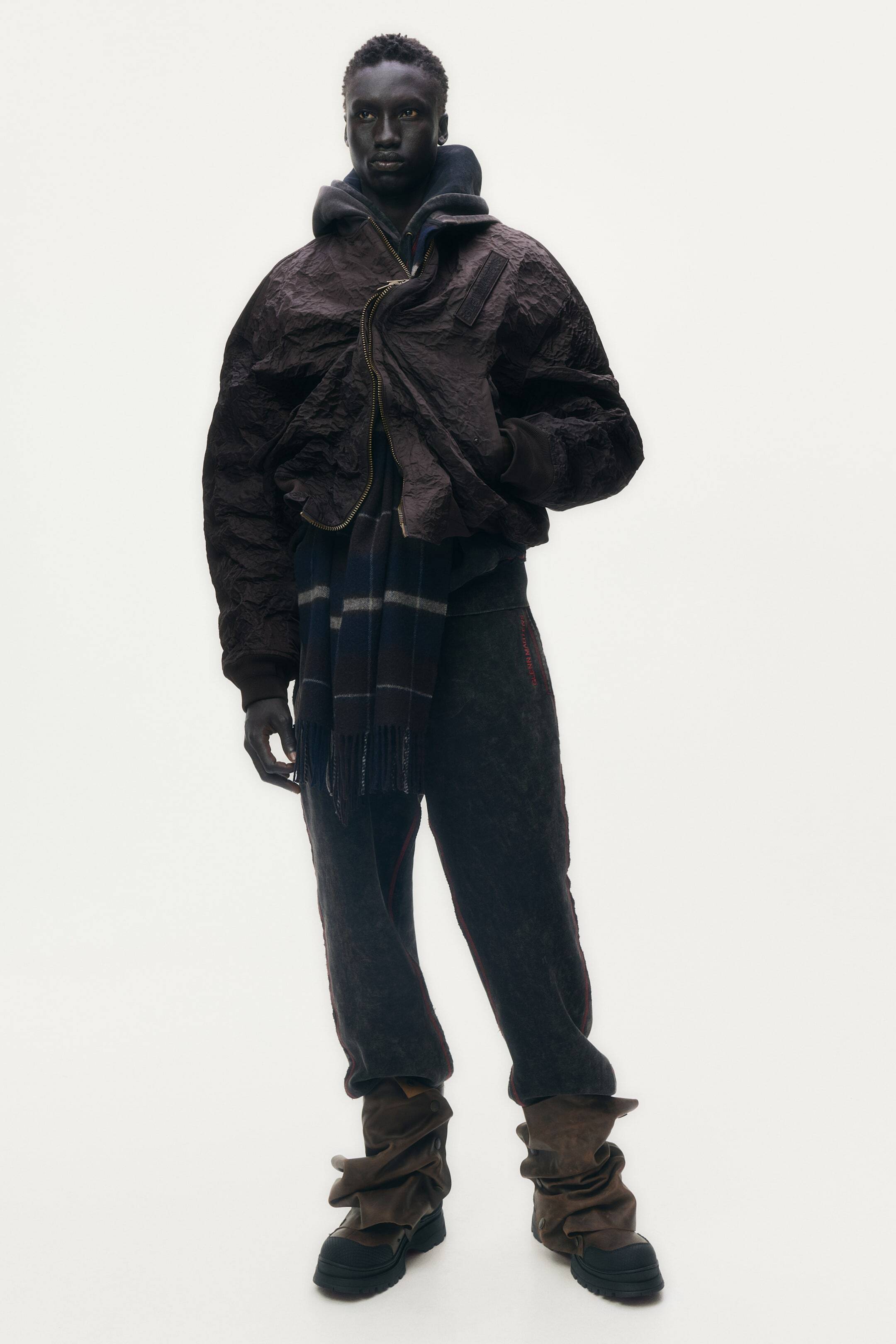 Утеплённая куртка-бомбер из тканого материала с фольгированным слоем, усиленным спереди и на внутренней стороне рукавов. Свободный крой, спущенная линия плеча и ребристый воротник-стойка. Двусторонняя молния спереди с отделкой из китового уса по бокам для более структурированного кроя и возможности создания эффекта стрелок. Съёмная застёжка на липучке с логотипом дизайнера на груди. Боковые прорезные карманы с клапаном на кнопке, два внутренних прорезных кармана на кнопке. Вытачки на плечах, ребристые манжеты и нижний край. Подкладка из габардина.