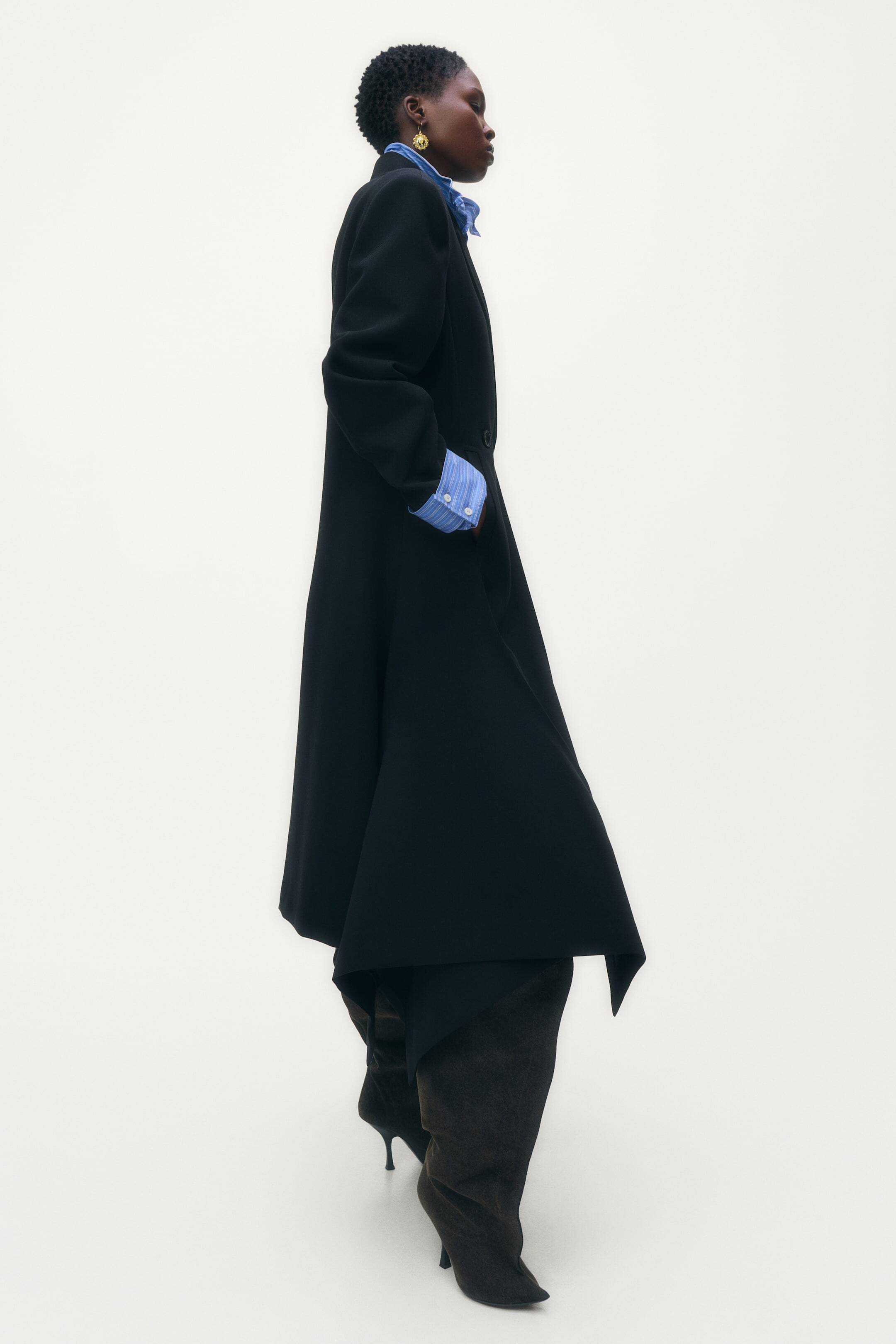 Длинное пальто из шерстяной ткани с острыми лацканами и большими подплечниками для создания чёткого силуэта. Двубортное, застёгивается на две пуговицы с двухсторонней застёжкой. Один прорезной нагрудный карман и боковые прорезные карманы. Расклешённый от талии книзу крой, высокие боковые разрезы, перекрывающие друг друга, и асимметричный подол с одной шлицей сзади. Внутренняя часть верхней части и рукавов на подкладке из габардина.