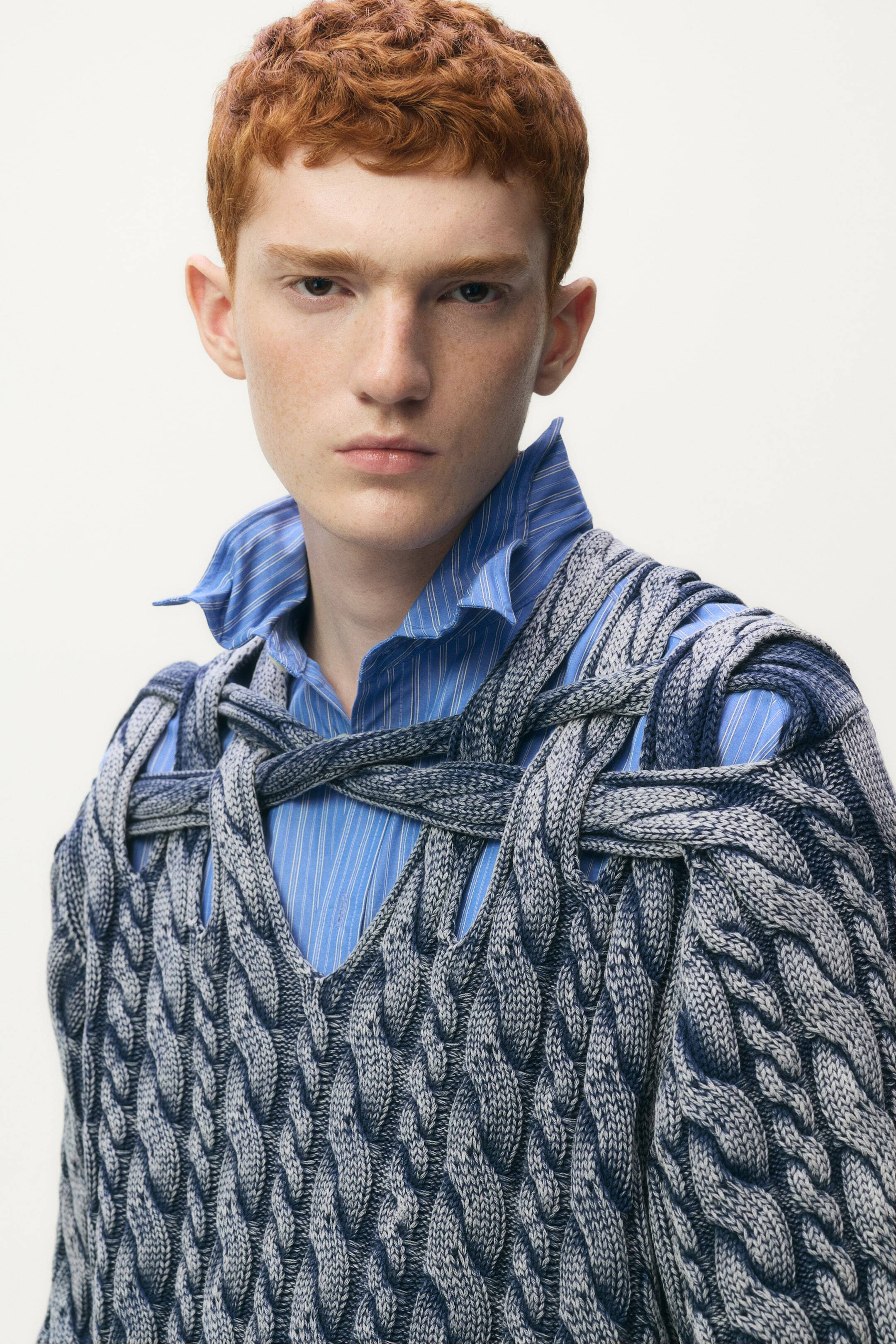 Хлопковый свитер фактурной вязки с выцветшей отделкой. Широкие секции фактурной вязки спереди и на рукавах переходят в свободные полосы спереди и на плечах, создавая игривый образ с вырезами. Ребристые манжеты и низ.
