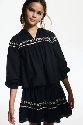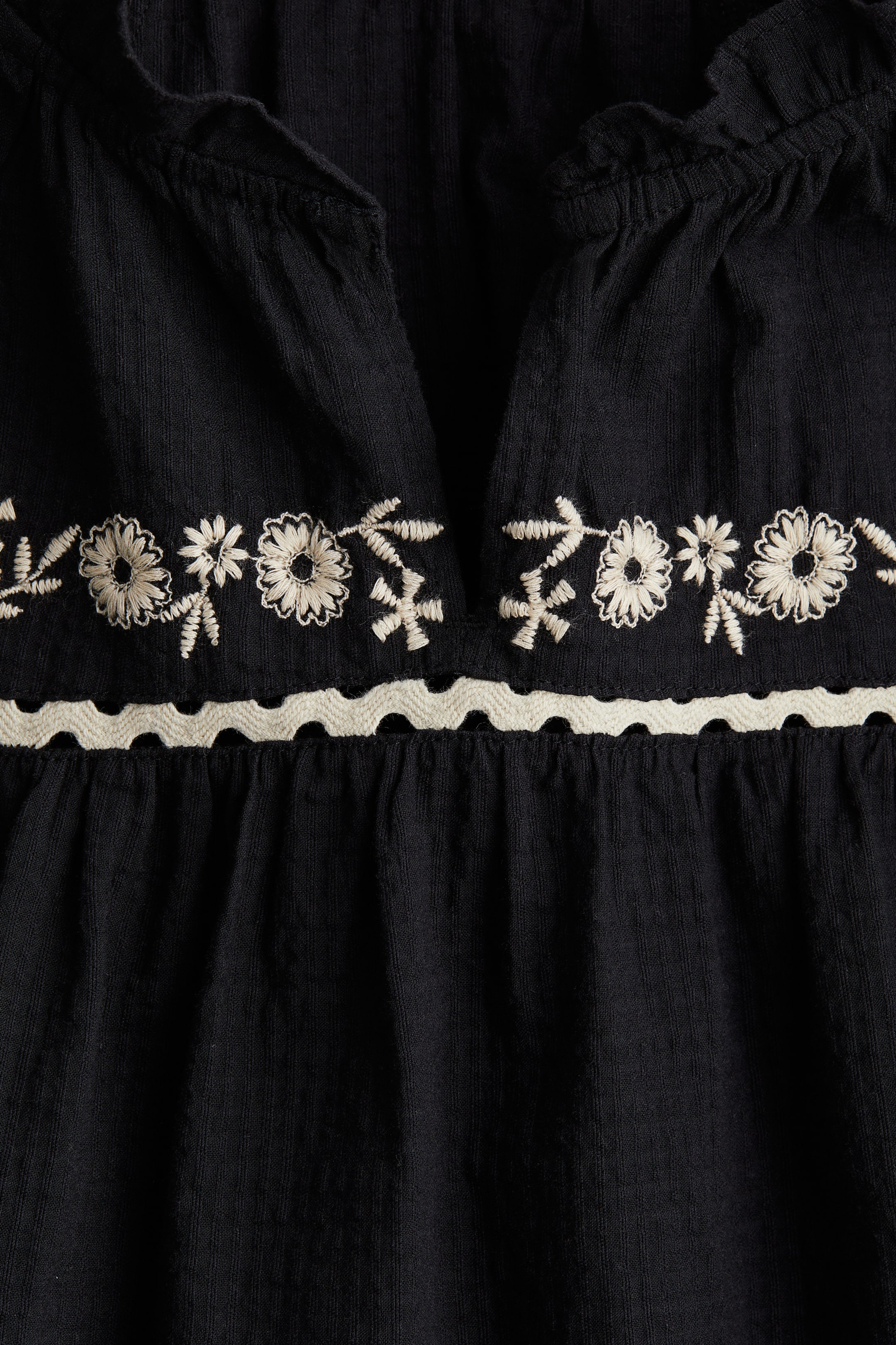 Блузка свободного кроя из мягкого хлопка и жаккардовой ткани с вышитыми деталями. Имеет круглый вырез горловины с оборками и V-образный вырез спереди. Спереди – присборенная кокетка, длинные рукава-фонарики с тонкой резинкой и оборками на манжетах.