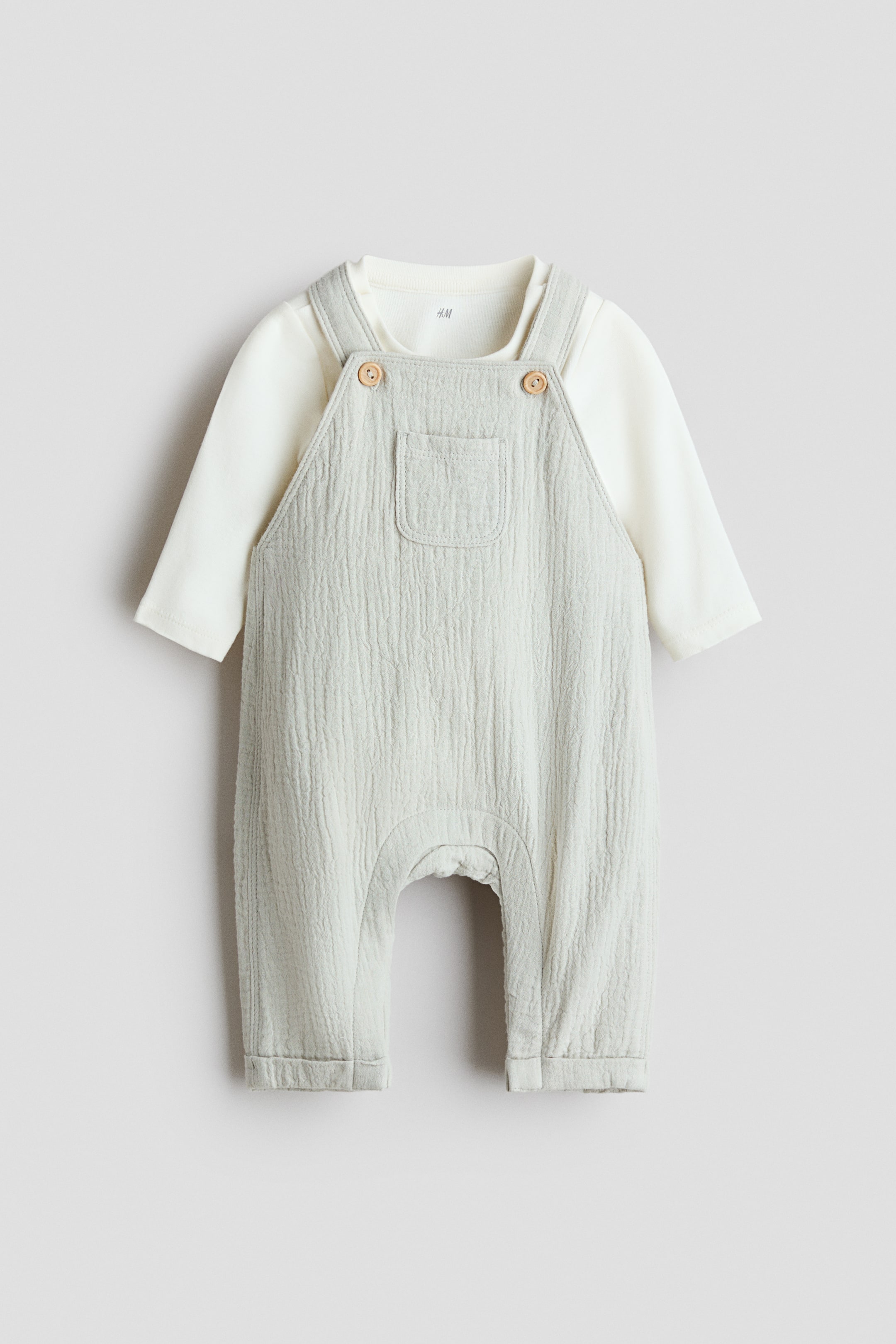 Комплект, состоящий из мягкого хлопкового муслинового комбинезона и хлопкового трикотажного боди. Комбинезон с регулируемыми бретелями на пуговицах и открытыми нагрудными карманами. Двойной подол с потайными застежками-кнопками вдоль щиколоток. Боди с длинными рукавами и круглым вырезом, с застежками-кнопками на плечах и внизу для удобства надевания и снимания.