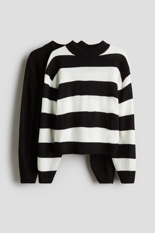 Комплект из двух одинаковых мягких свитеров тонкой вязки. Отличается спущенной линией плеча и широкой резинкой на горловине, манжетах и подоле.