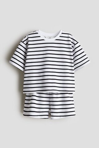 Повседневный комплект из футболки и шорт из лёгкого свитшота. Футболка с круглым вырезом, ребристым лифом, спущенной линией плеч, прямым кроем и короткими разрезами по бокам. Шорты с приталенной резинкой на талии.